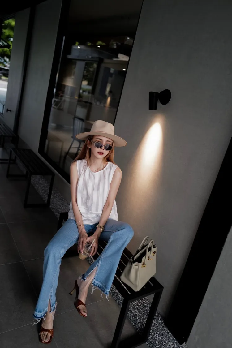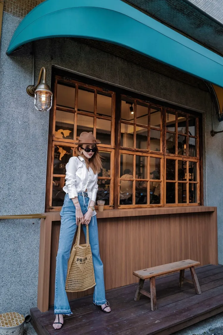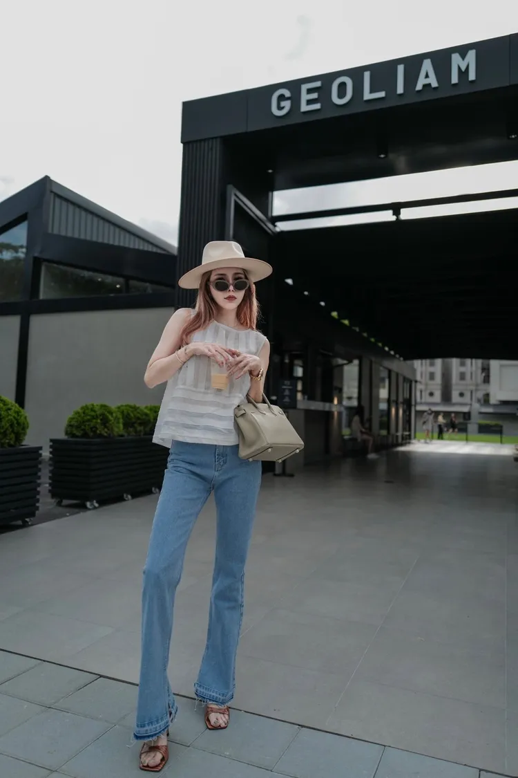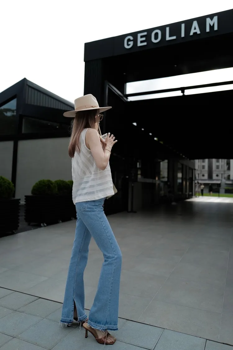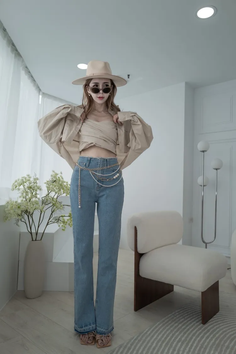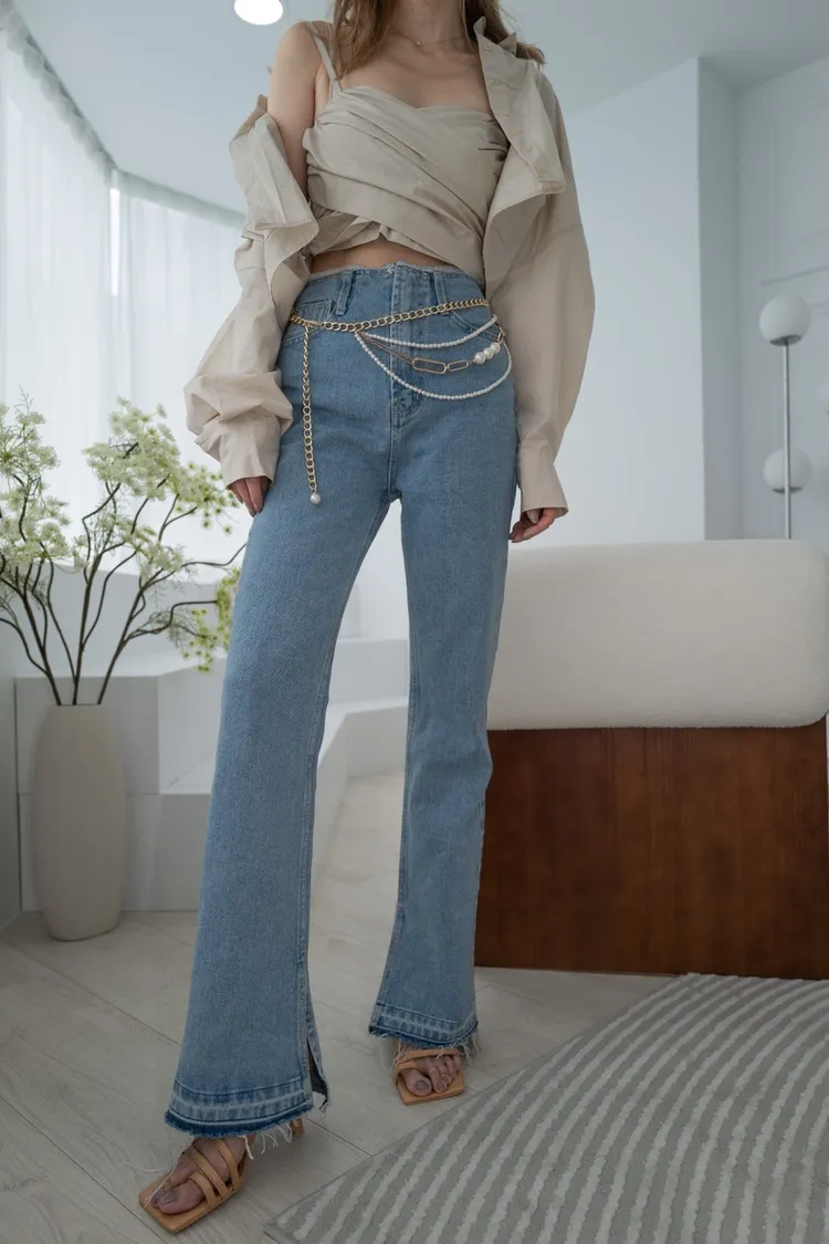 A021淺藍色褲頭鬚感內開叉靴型褲