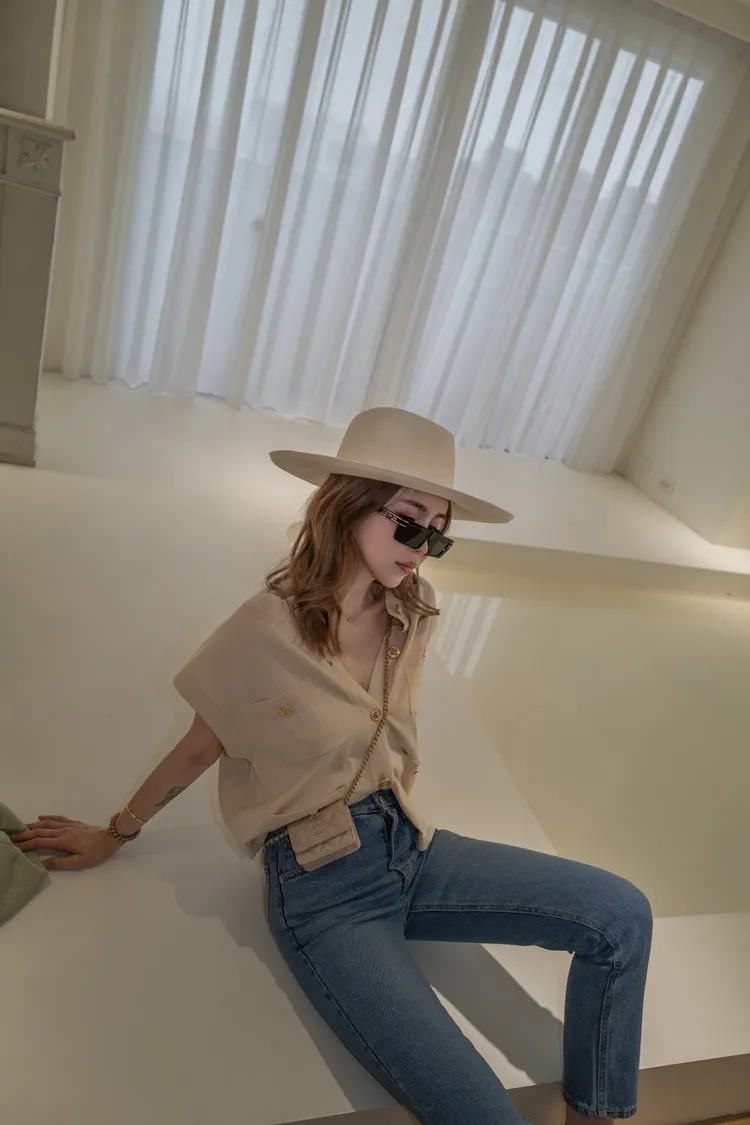 M153杏色金釦細針織背心