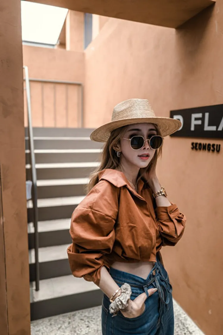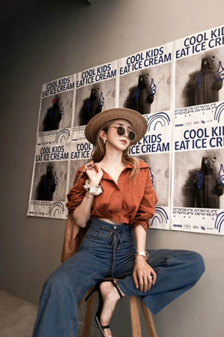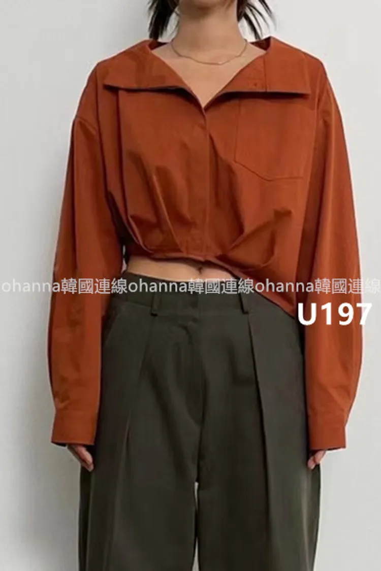 U197必買楓葉橘腰抓皺下擺不對稱襯衫