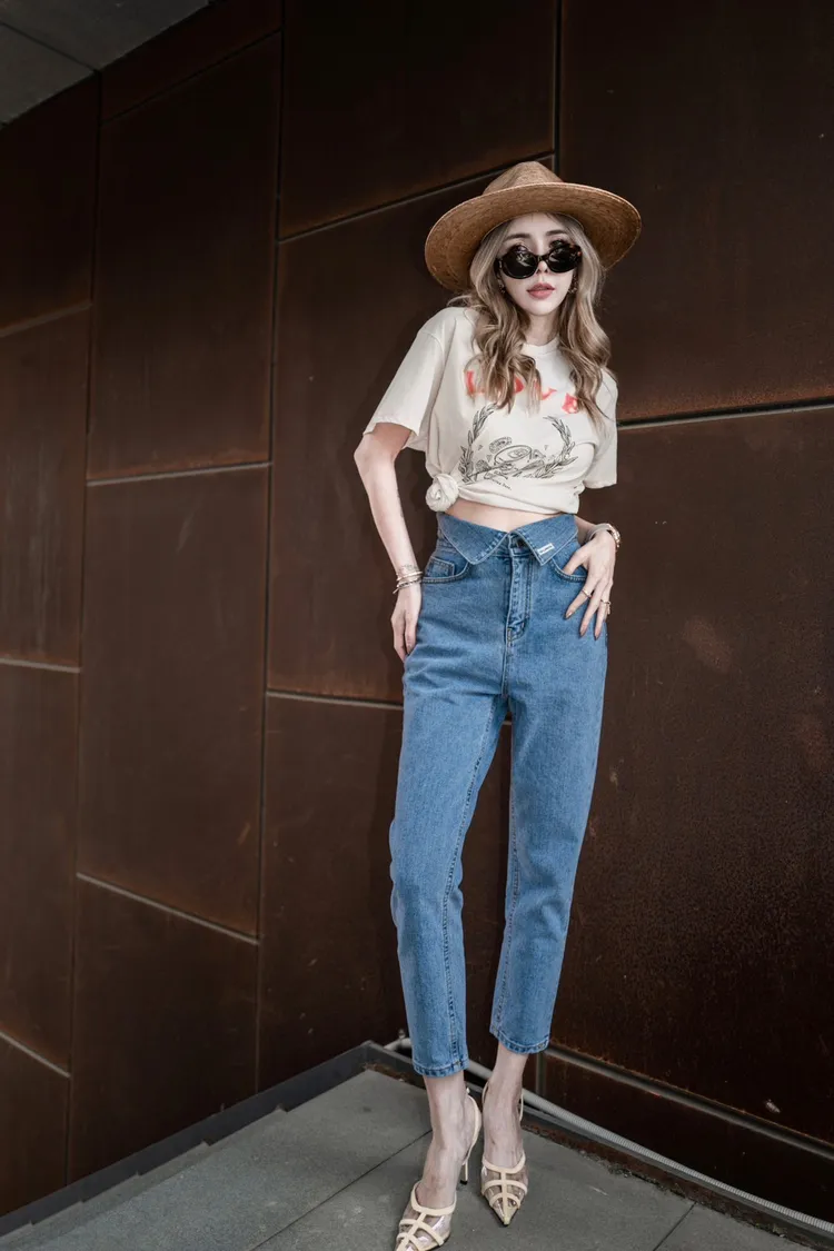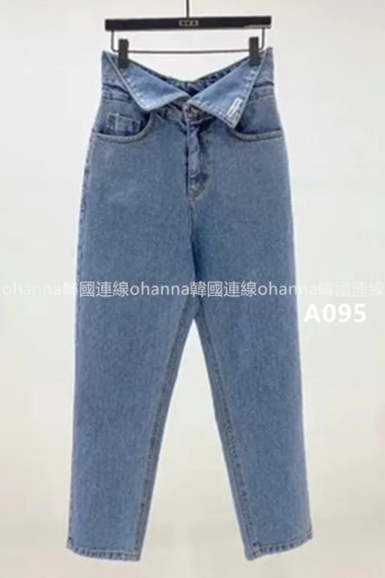 A095藍色褲頭下翻素面牛仔褲