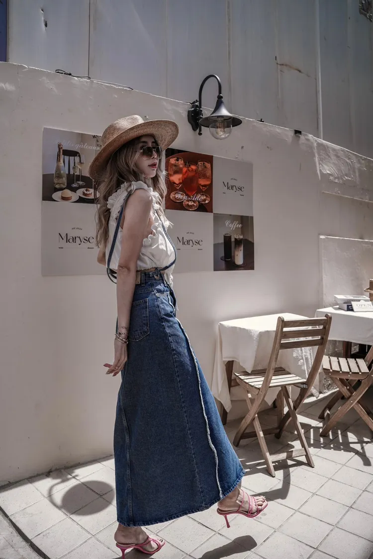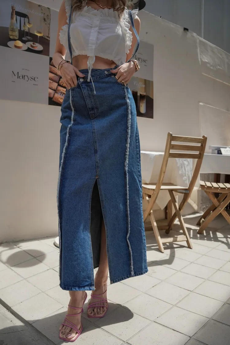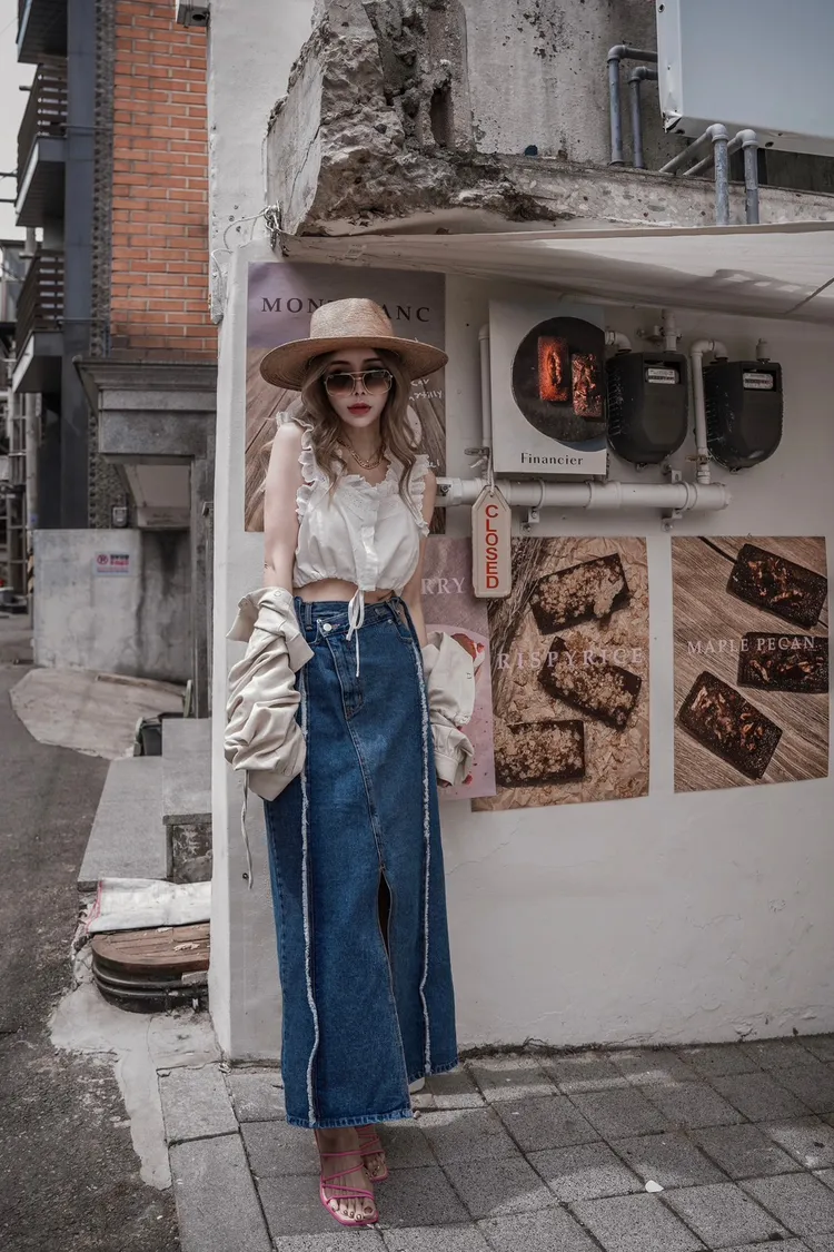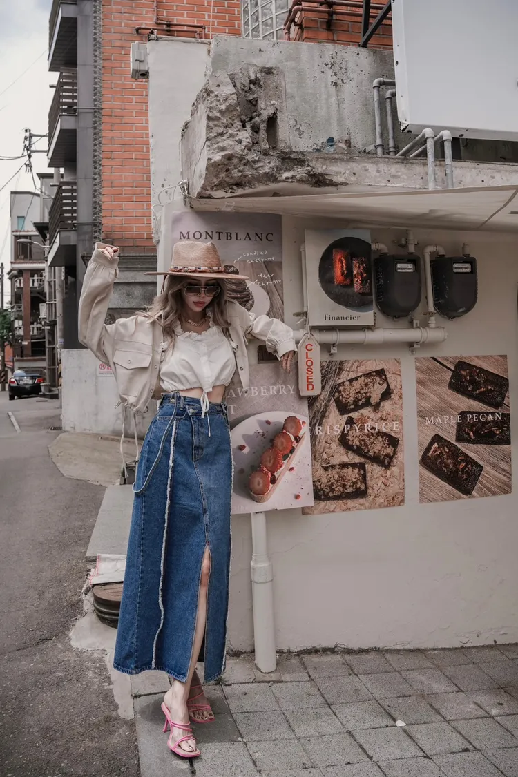 F123牛仔拉鍊斜釦開衩側邊毛邊造型長裙