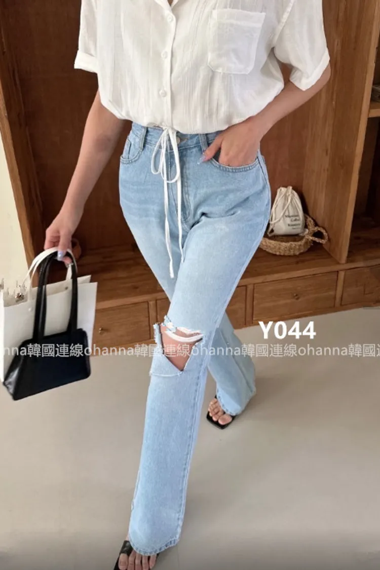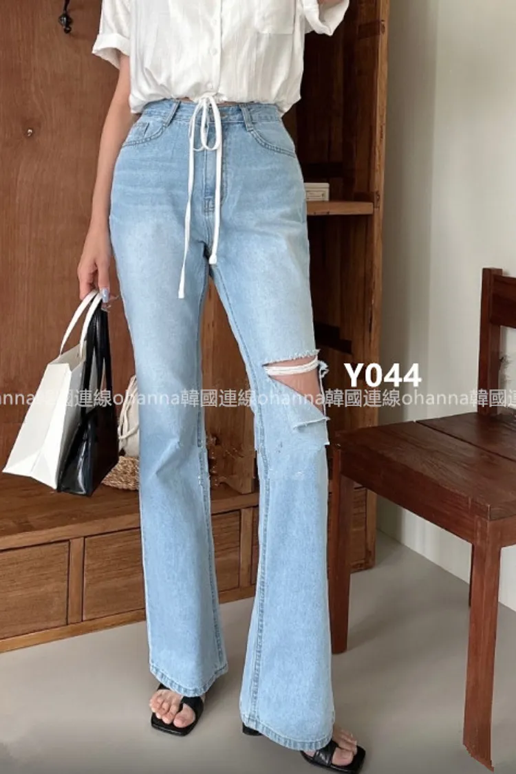 Y044淺藍單邊膝蓋簍空靴型褲