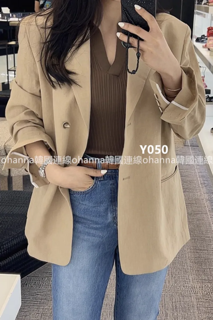 Y050駝色棉麻長版西裝外套