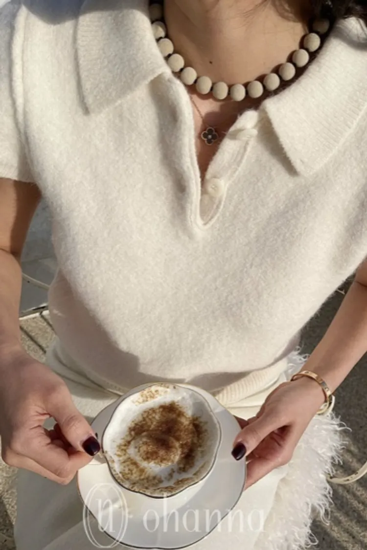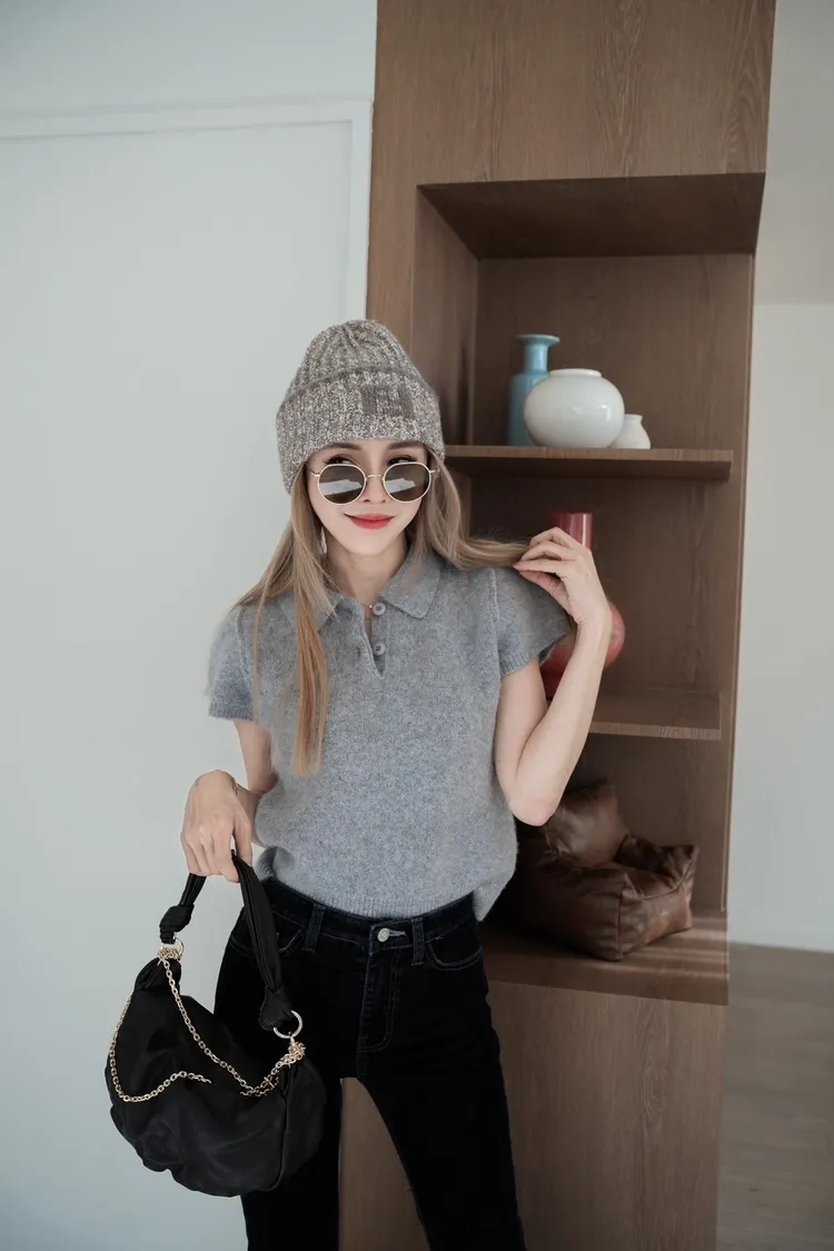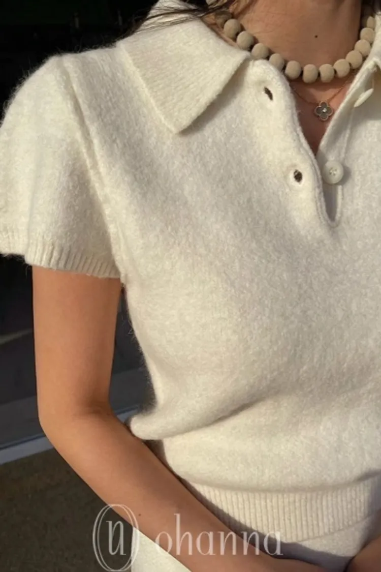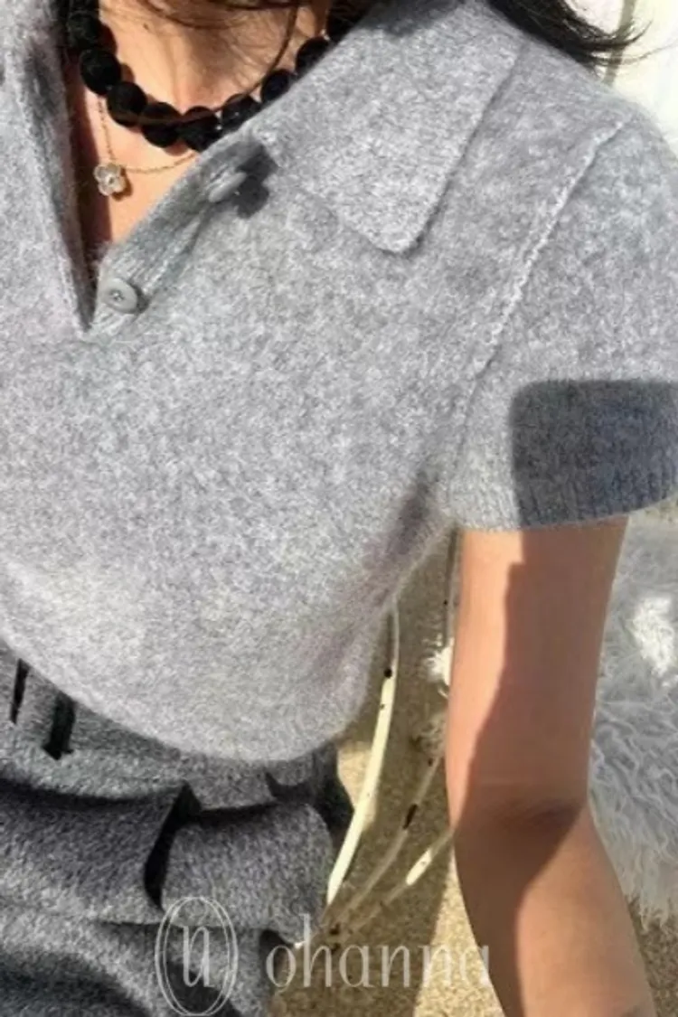 D043肩壓褶素面短袖翻領開襟上衣