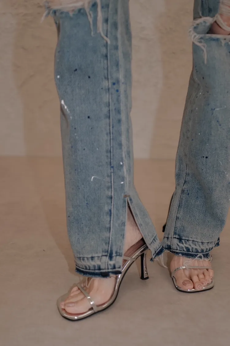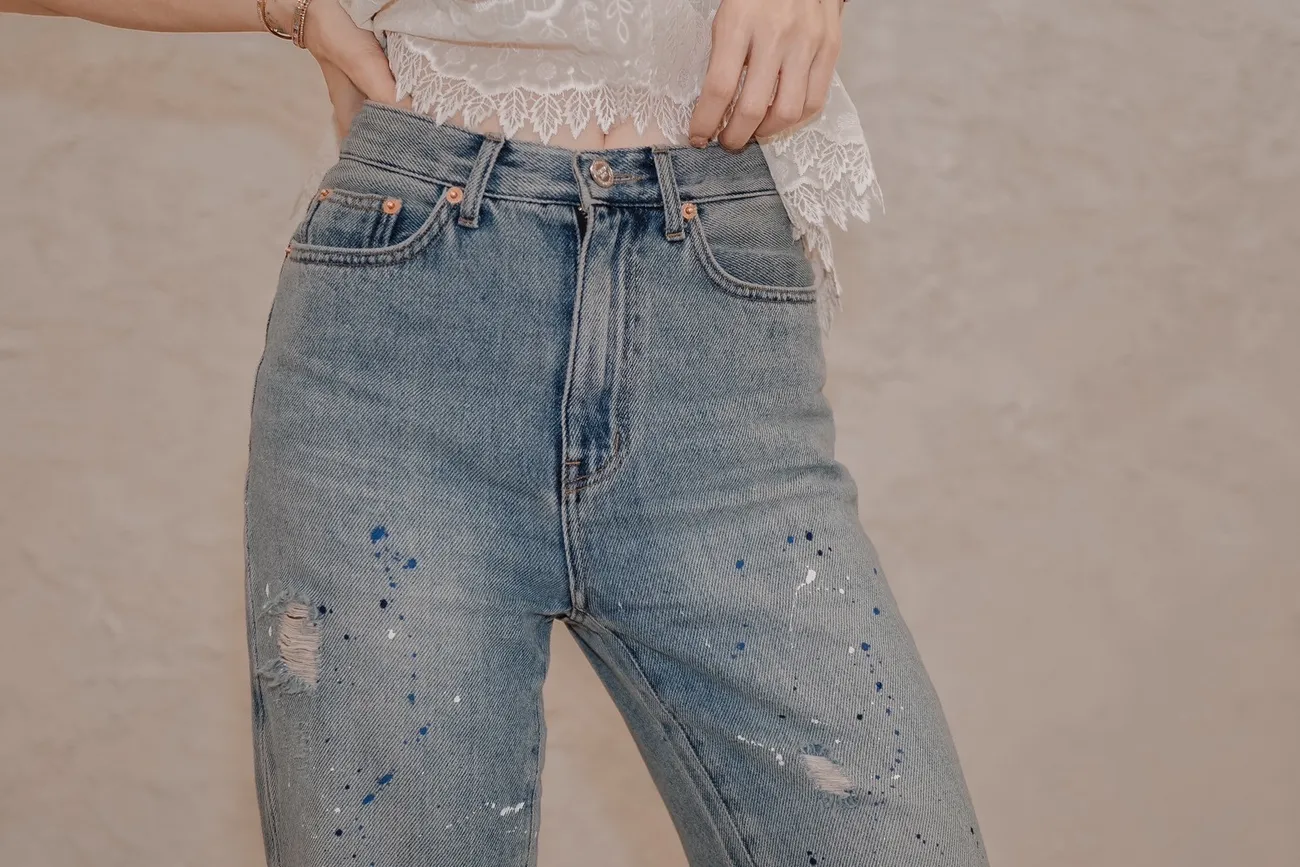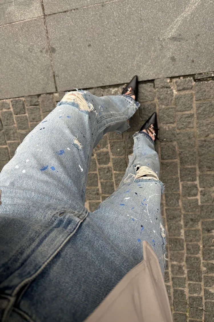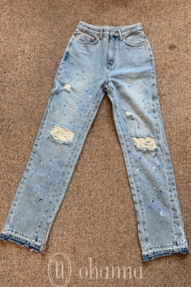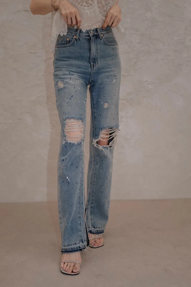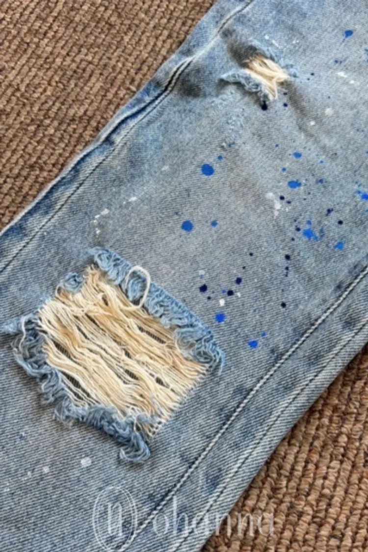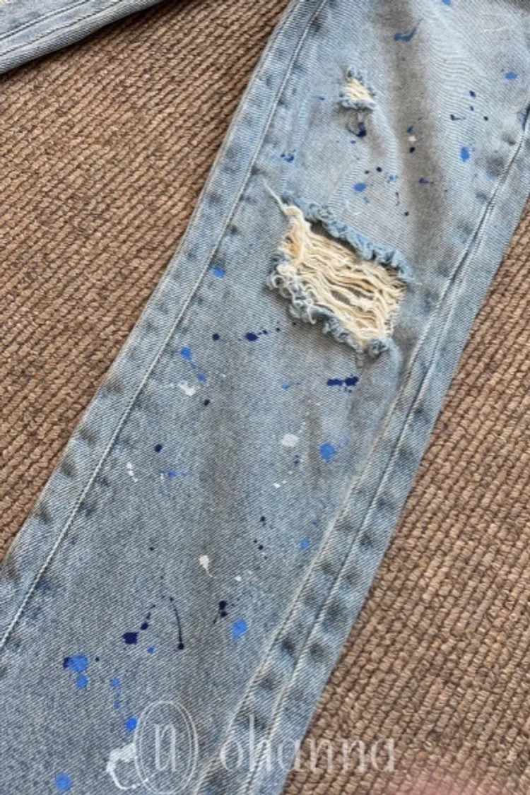 J118(自訂款)藍色刷破潑漆設計牛仔褲