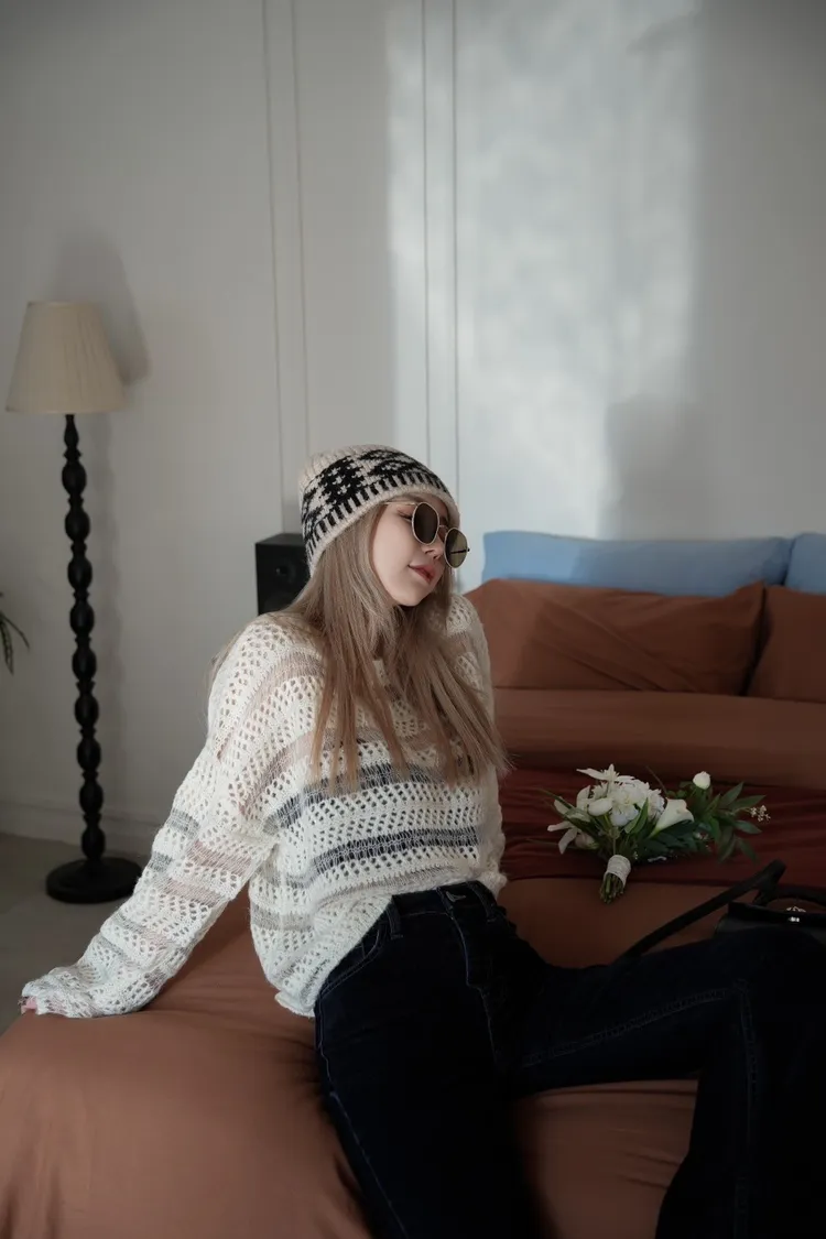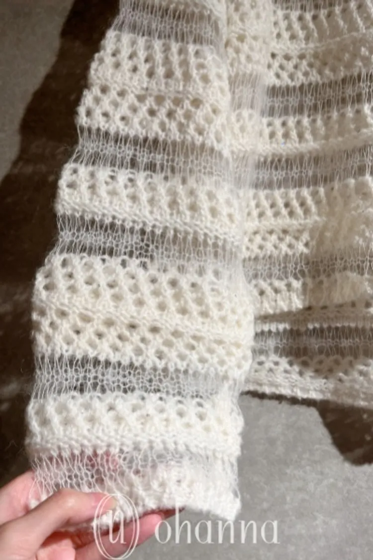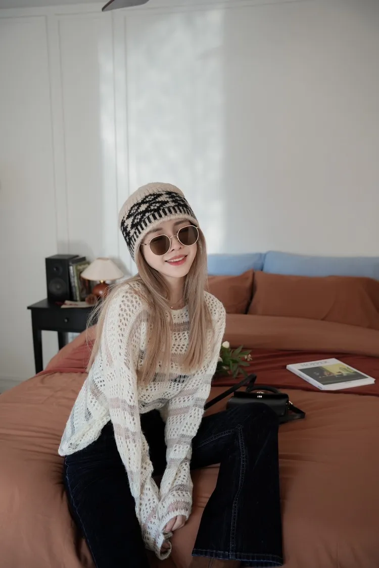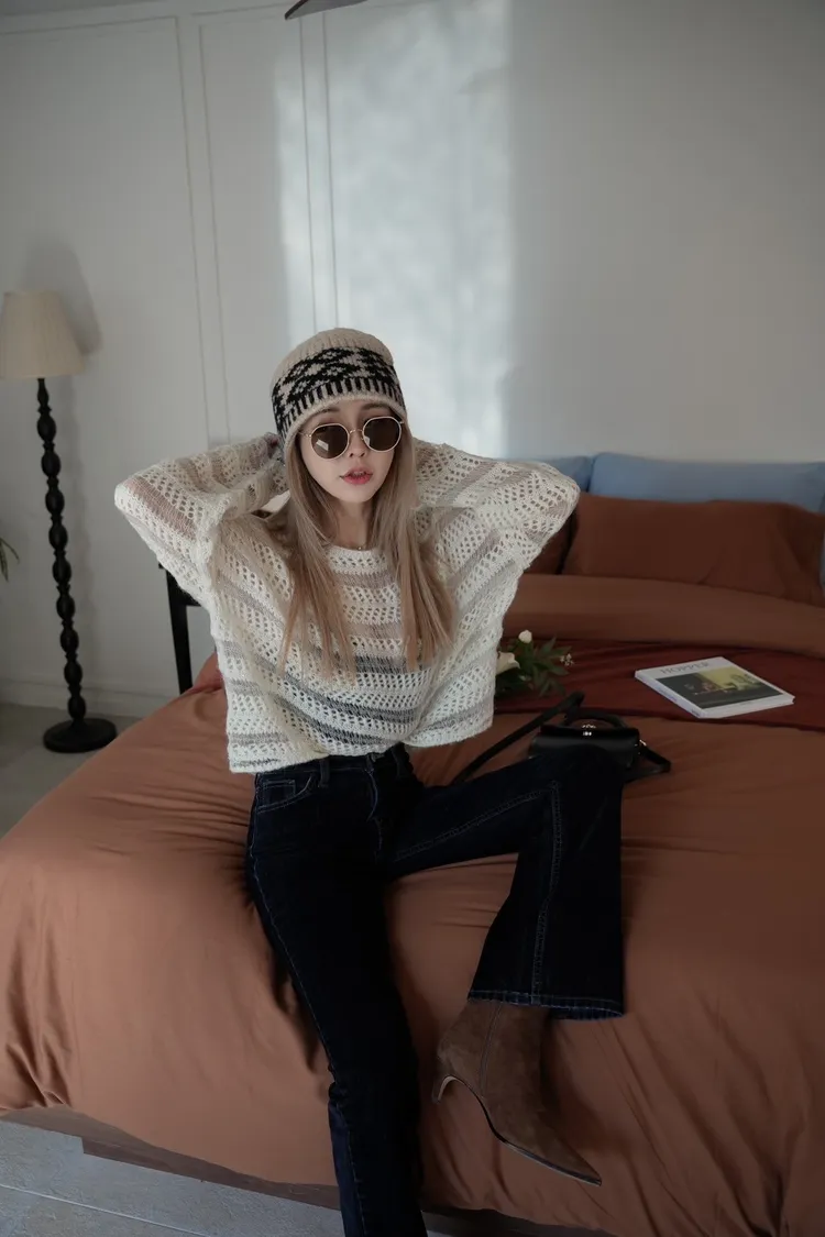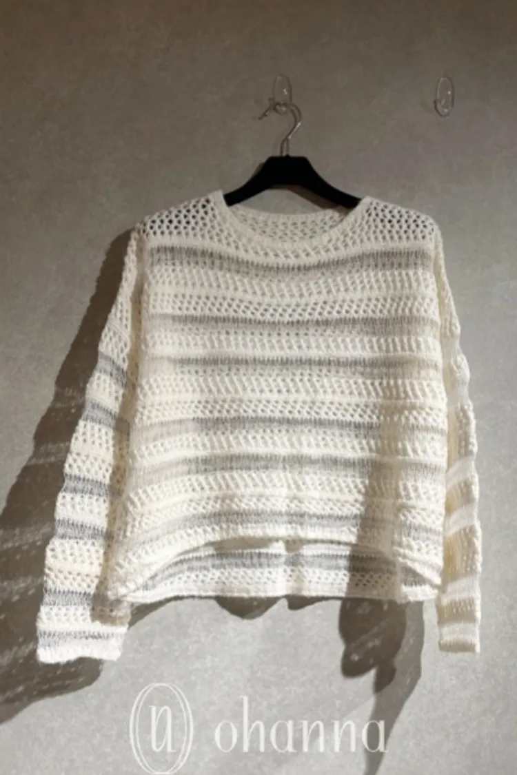 N005(自訂款)米白小亮片透膚簍空針織上衣