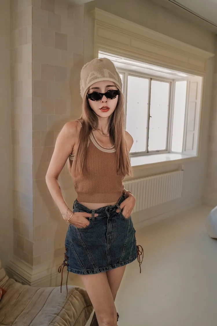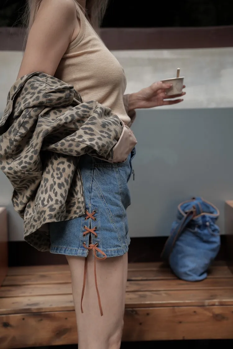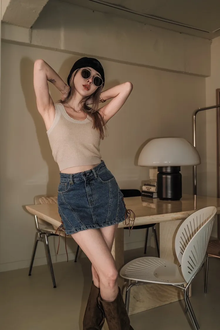 S029藍色壓線側綁帶牛仔短褲裙