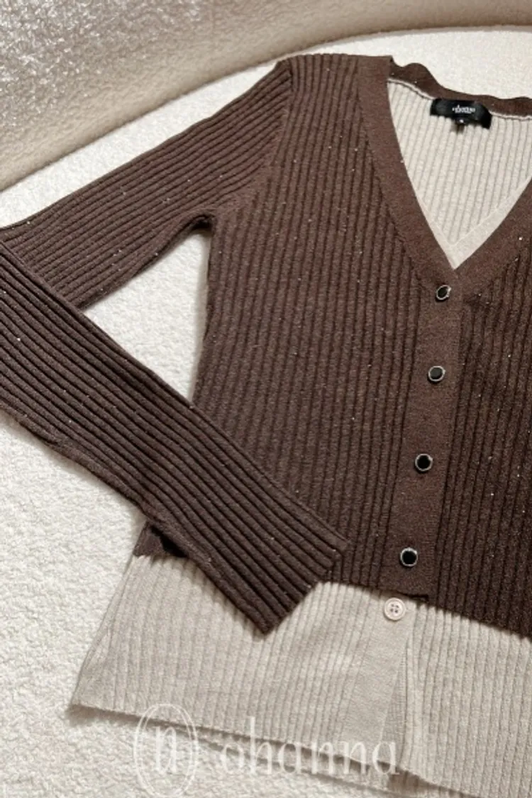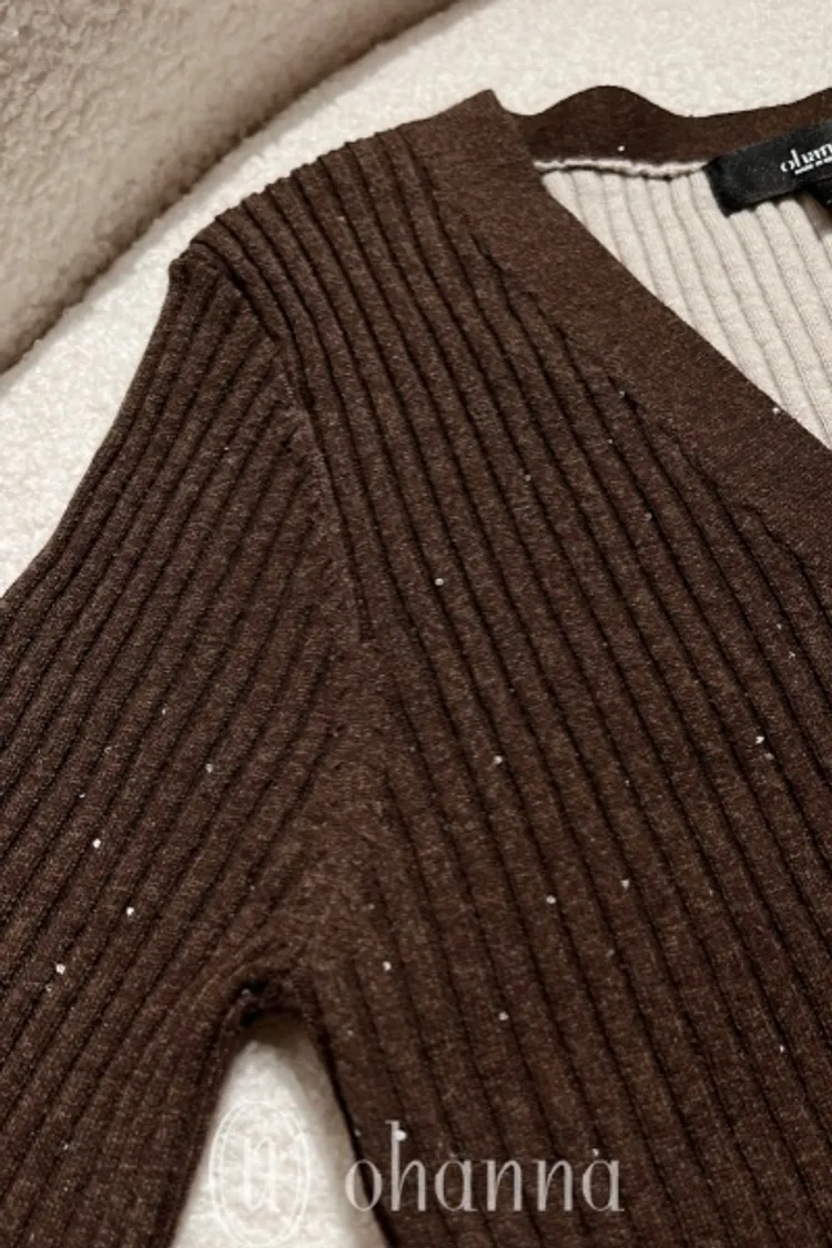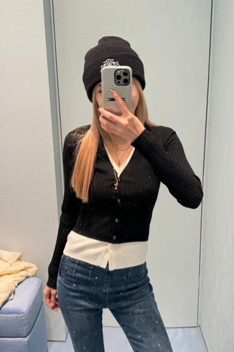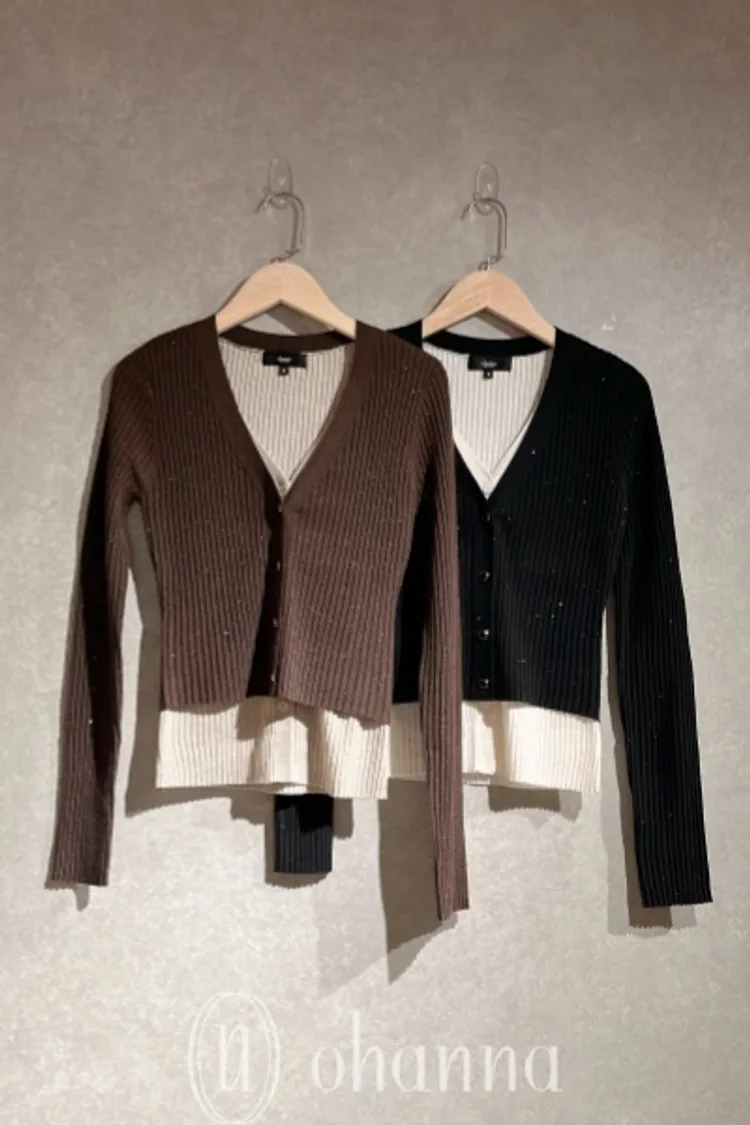 S081(自訂款)假兩件拼色小亮片坑條排釦上衣