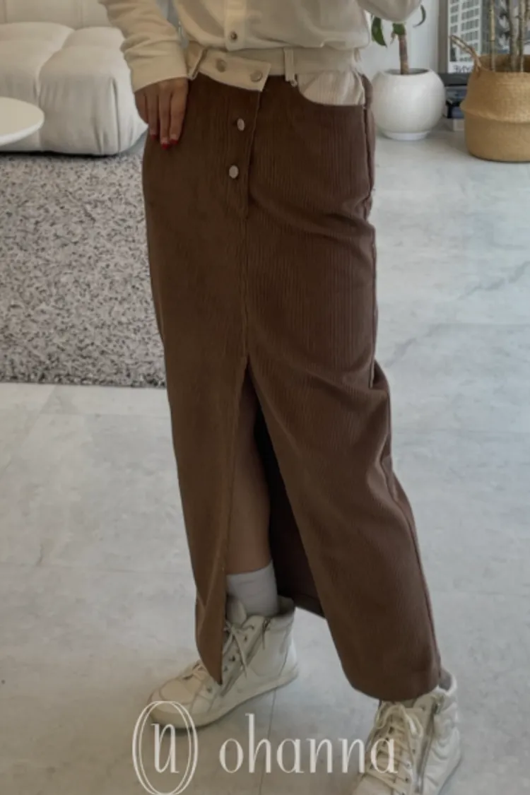 S105咖色拼色斜釦開叉長裙