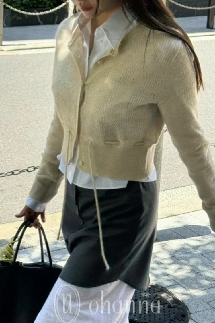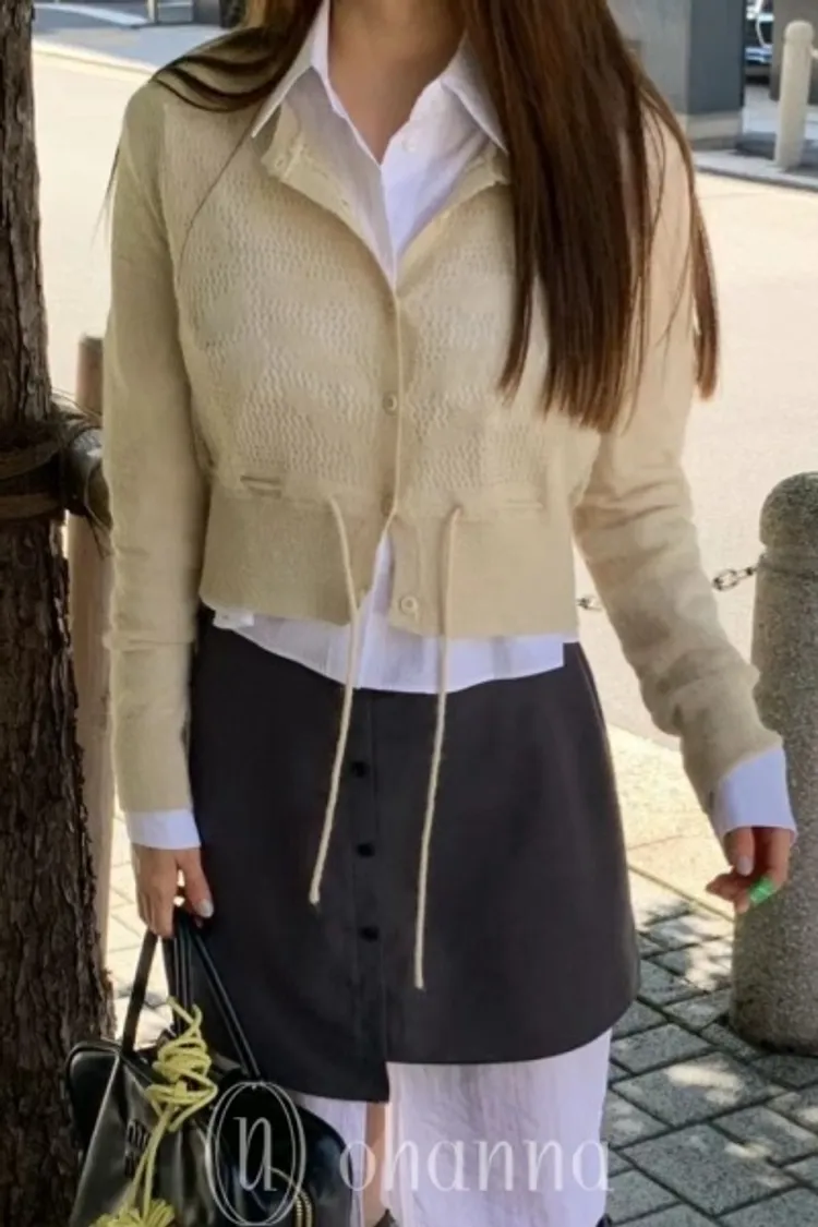 U073米色腰綁繩排扣針織衫