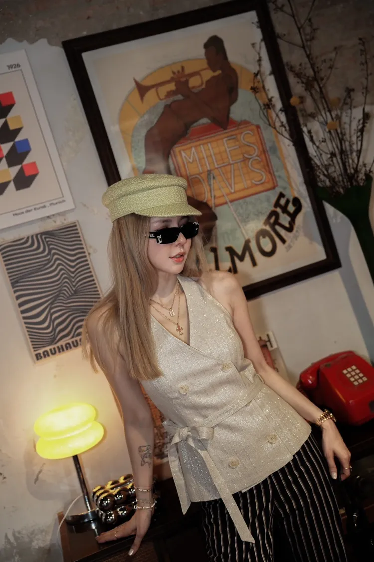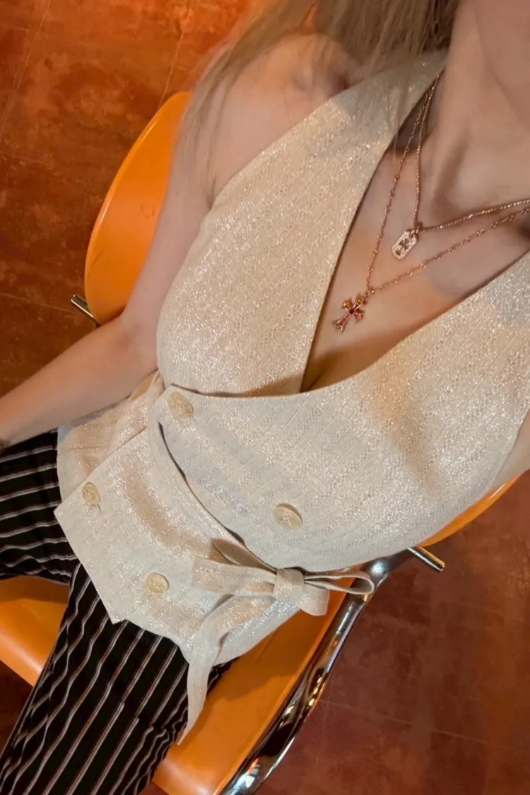 A113(自訂款)附綁帶繞頸美背銀蔥西裝背心
