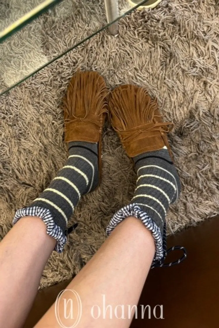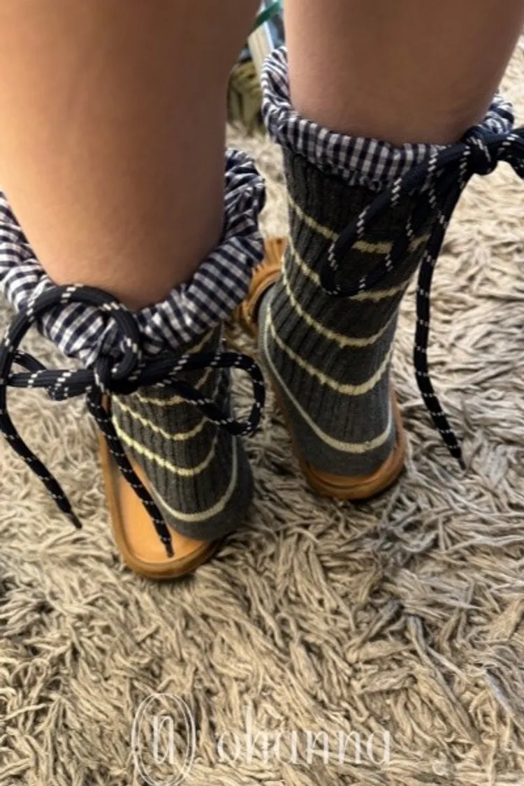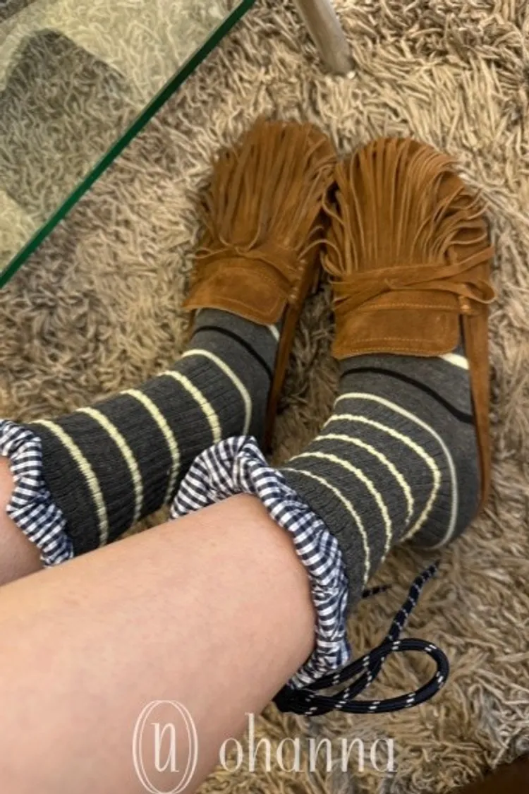 C060灰條紋上接格紋後綁帶中筒襪