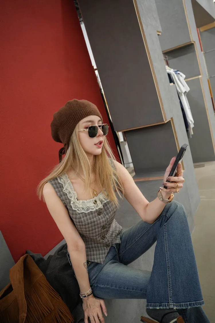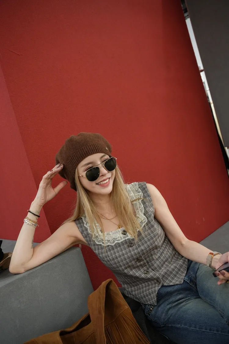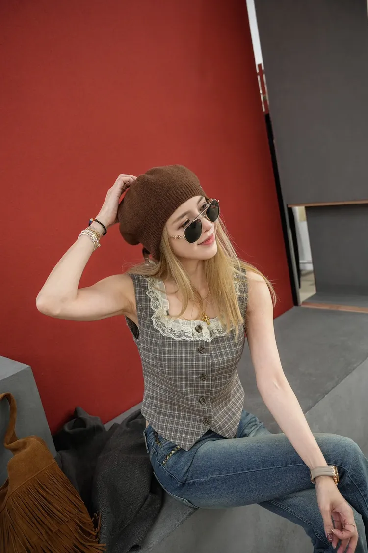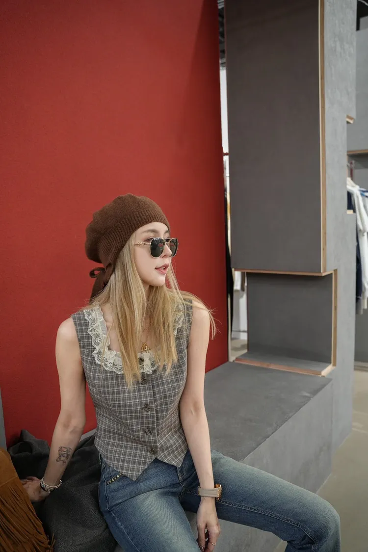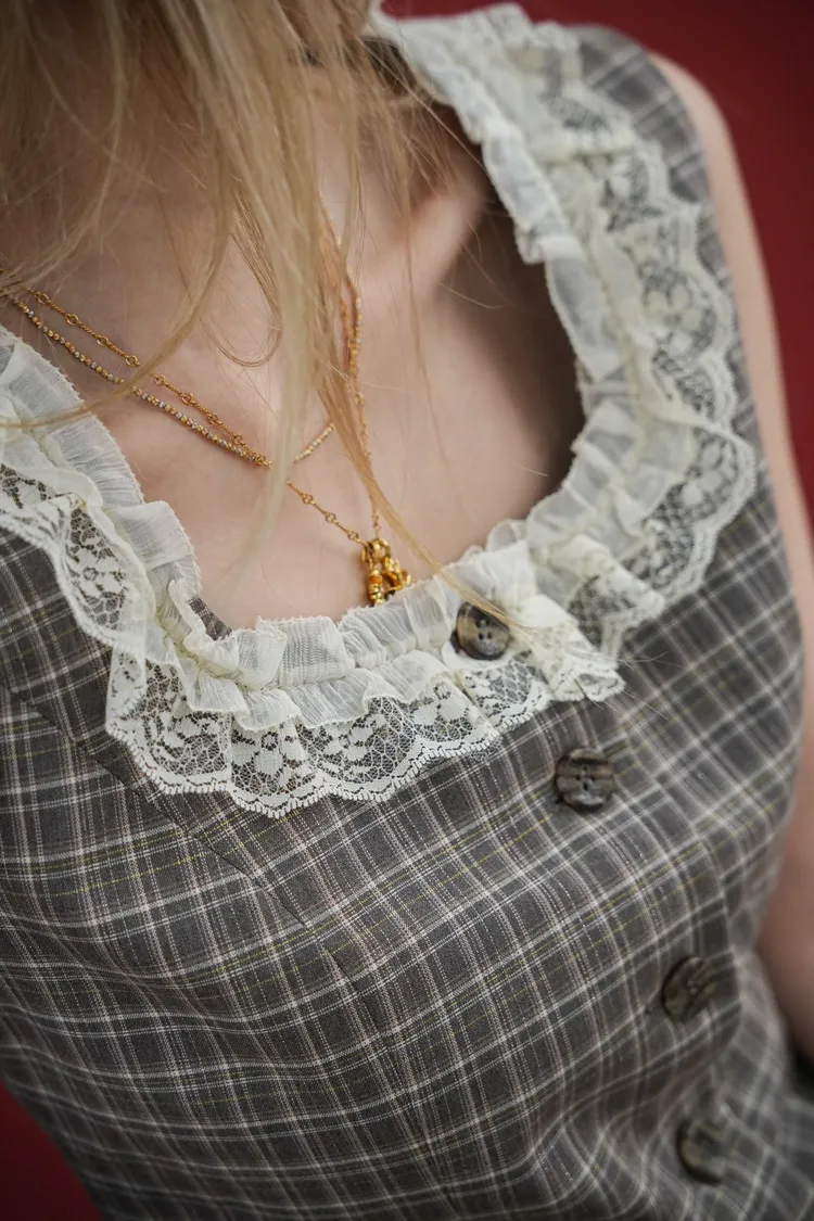 C068(自訂款)格紋領蕾絲排扣西裝背心