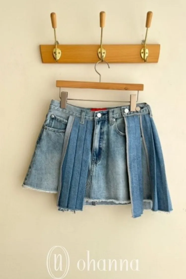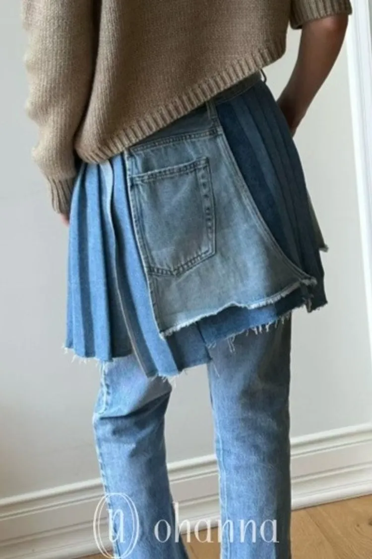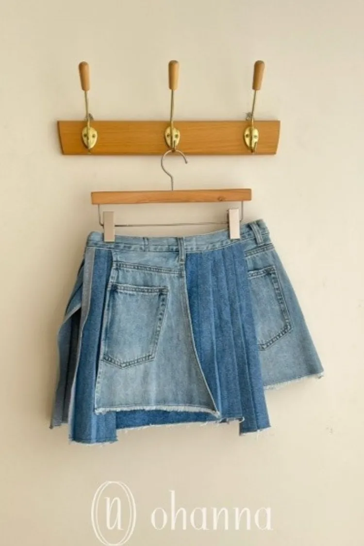 C079淺藍拼接百褶牛仔外罩短裙