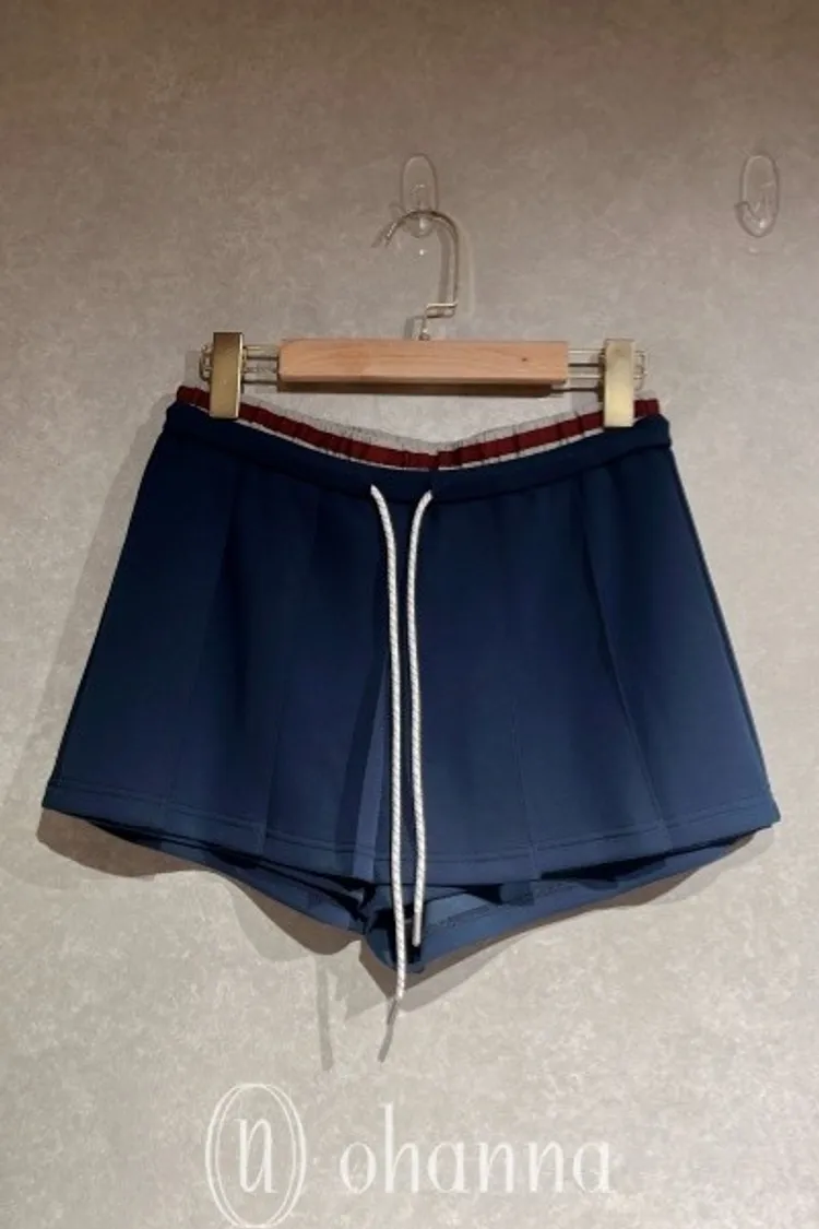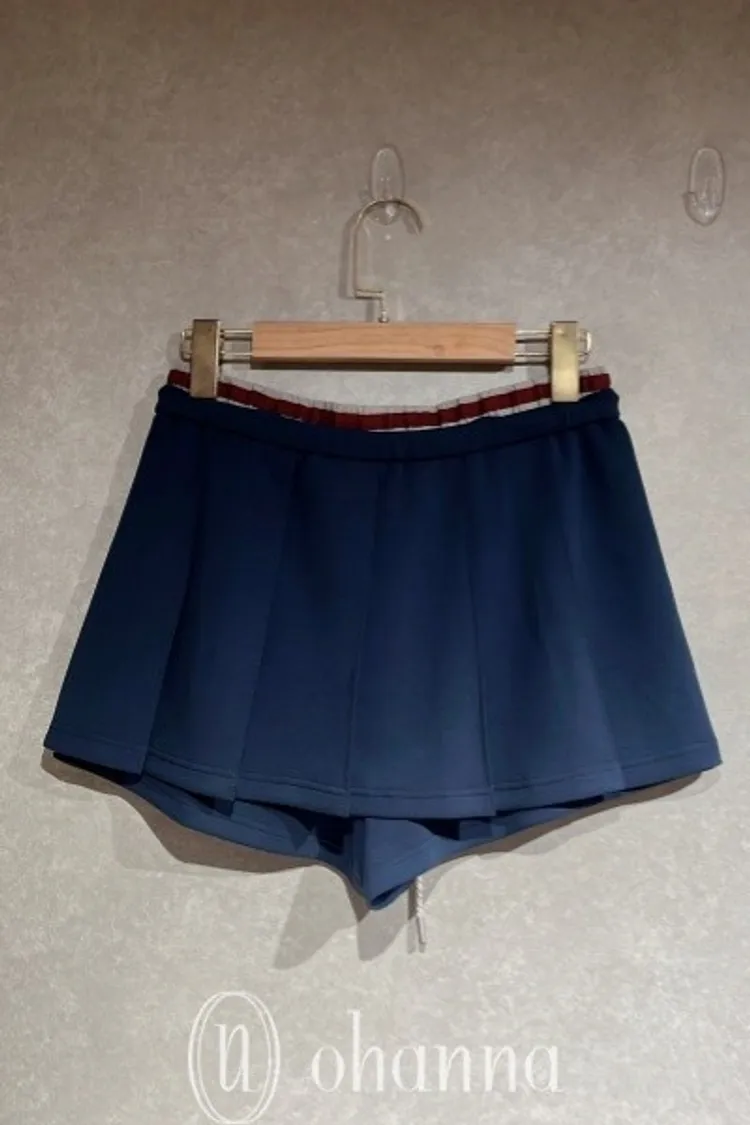 C094(自訂款)滾紅邊雙褲頭深藍抽繩百褶褲裙