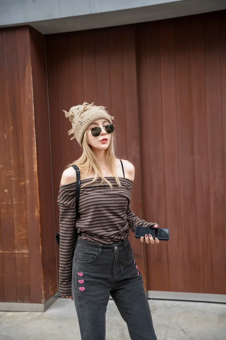 C103(自訂款)寬領咖色線條腰抓皺上衣