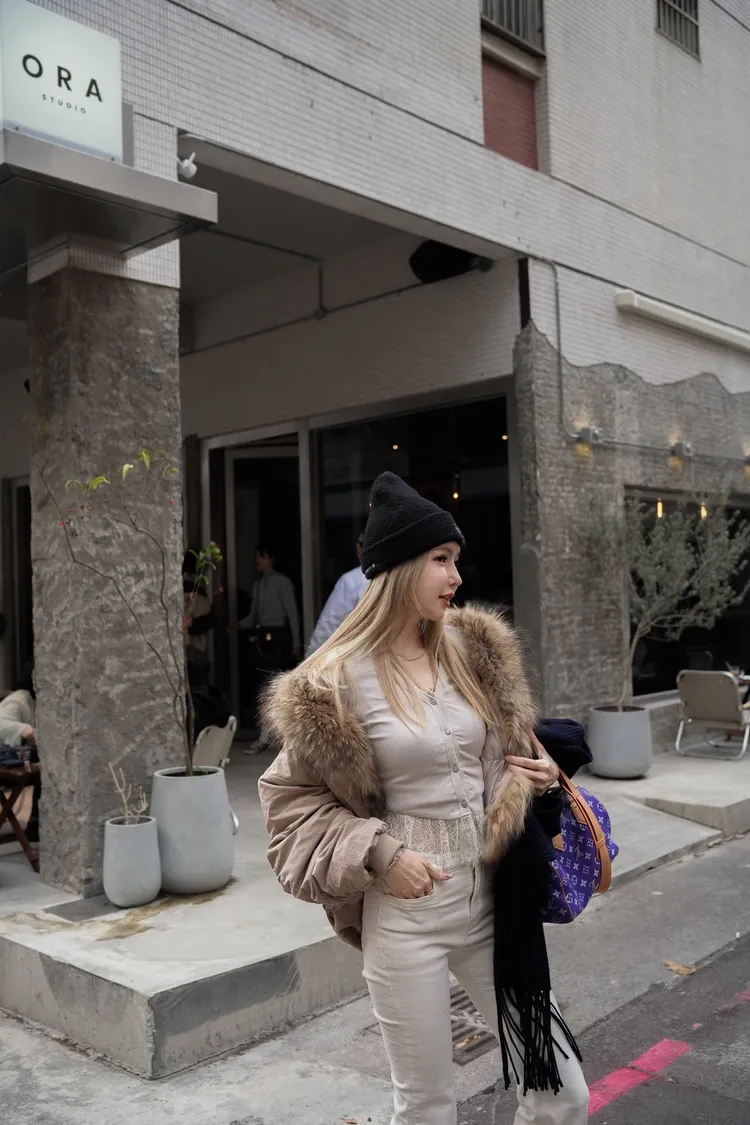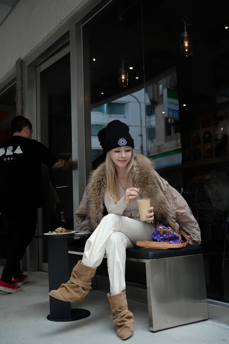 D060(自訂款)淺卡其色領毛毛袖抓皺外套