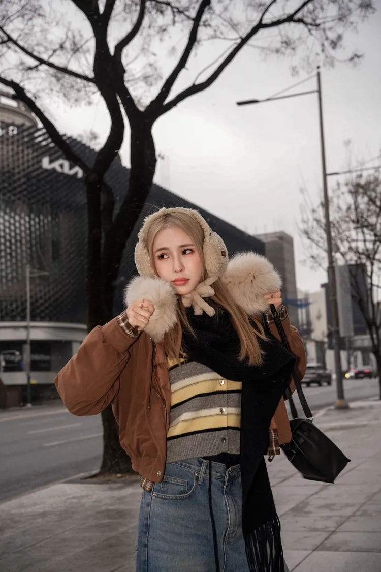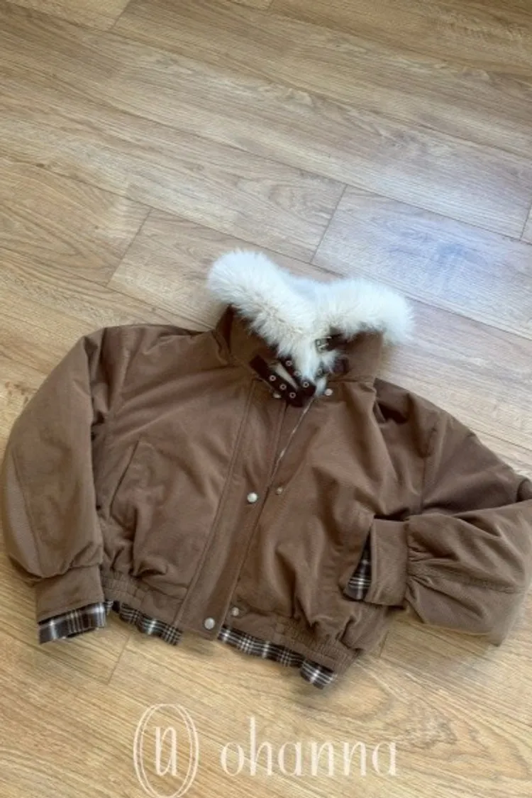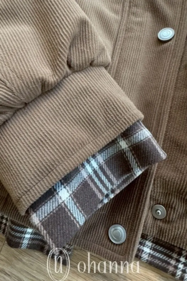 D065(自訂款)駝色翻領毛毛下拼接格紋外套