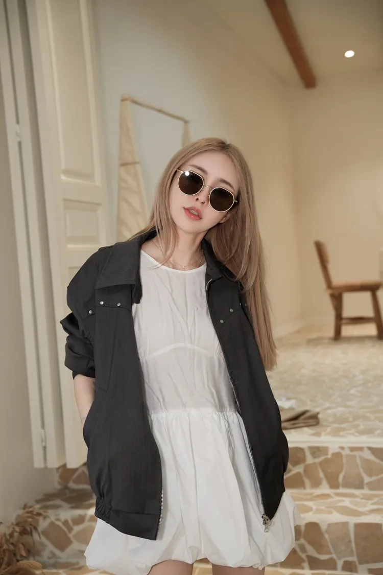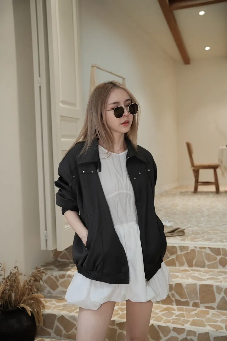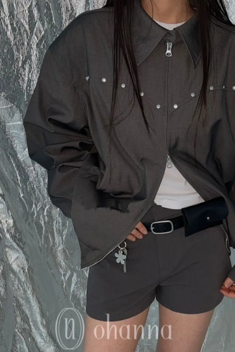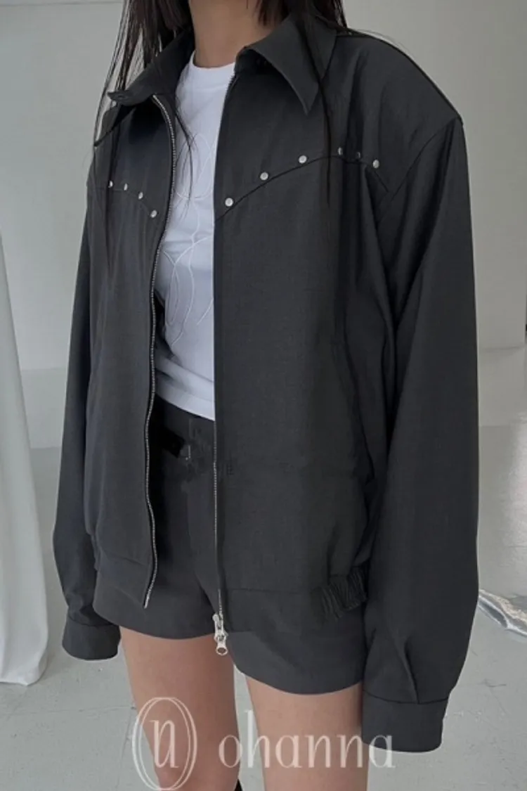 F090灰色胸小鉚釘造型拉鍊外套