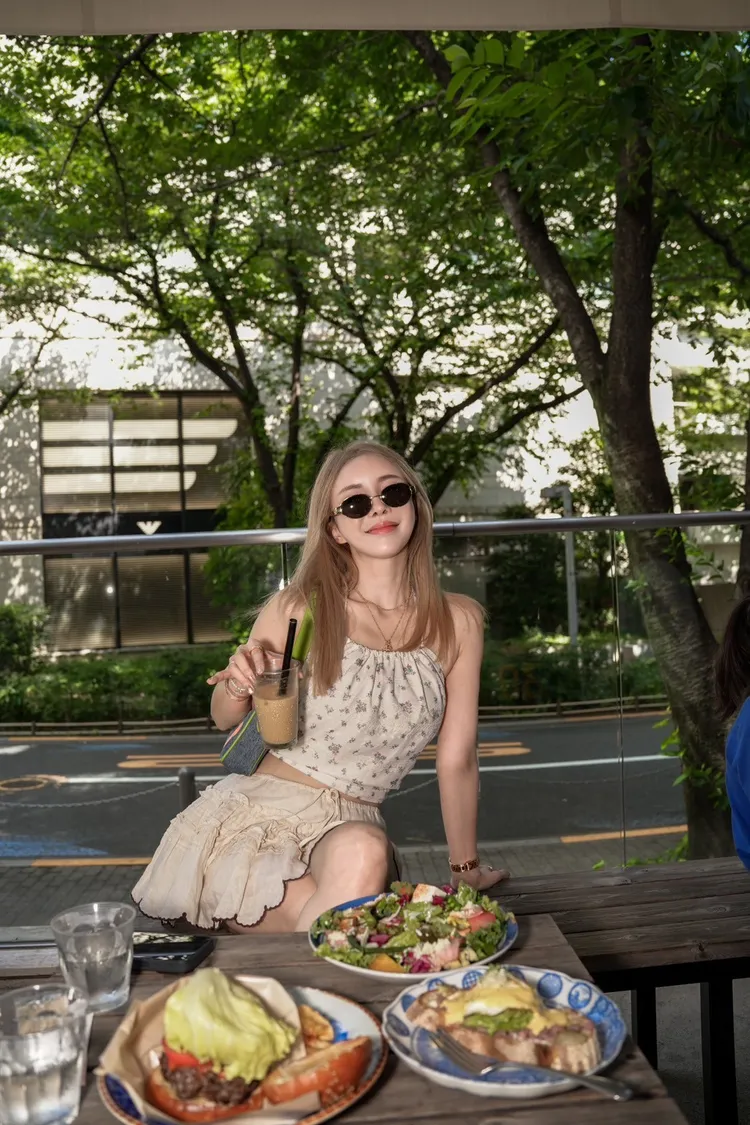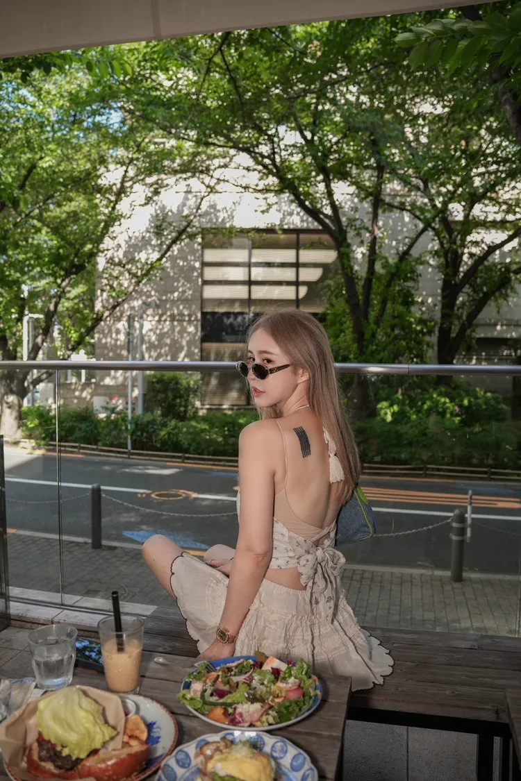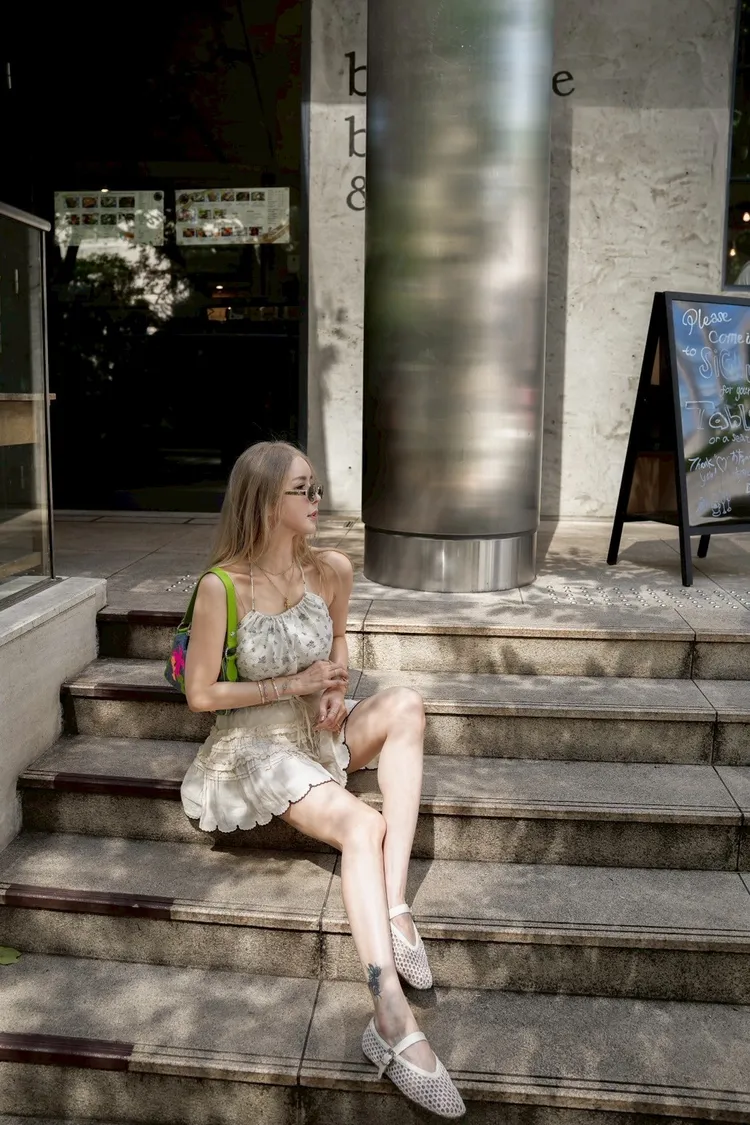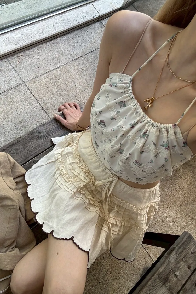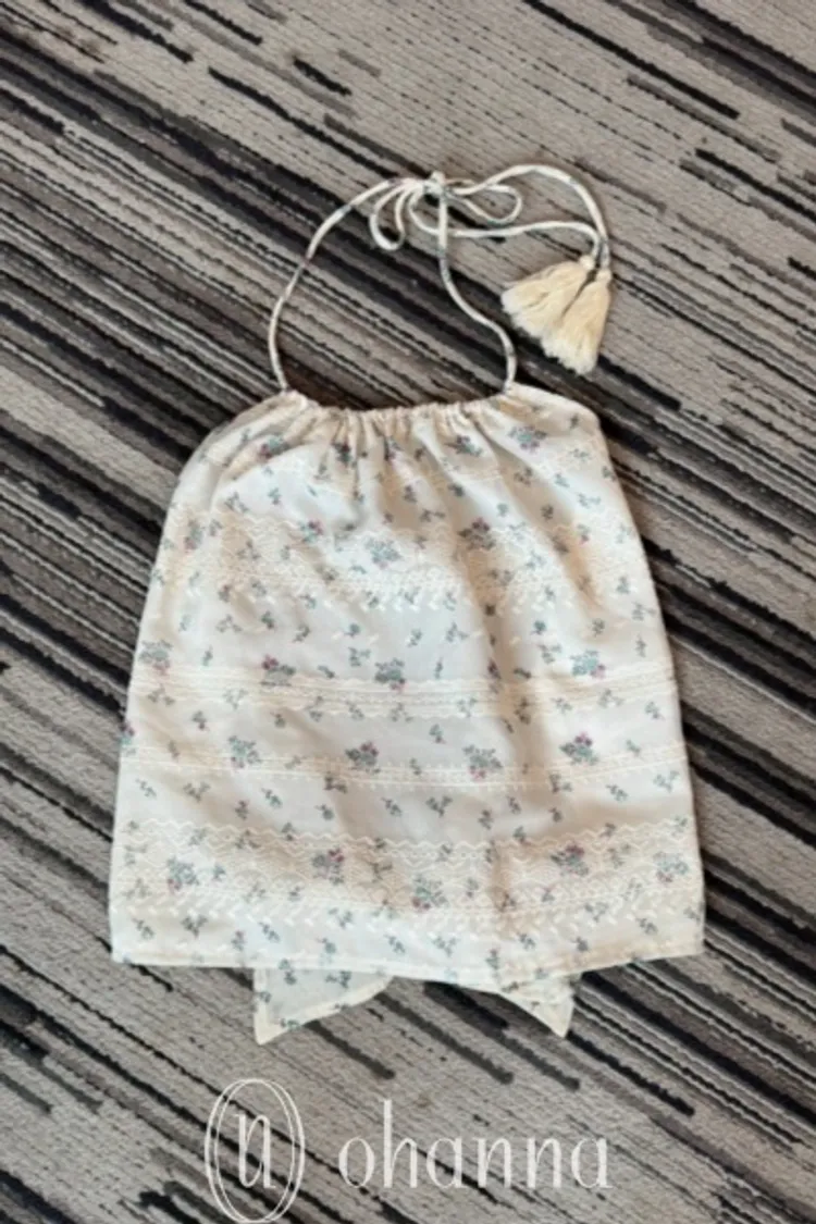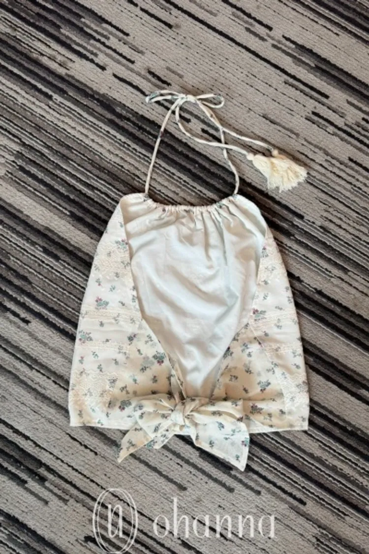 J076(自訂款)米色後綁帶紫色小花削肩背心