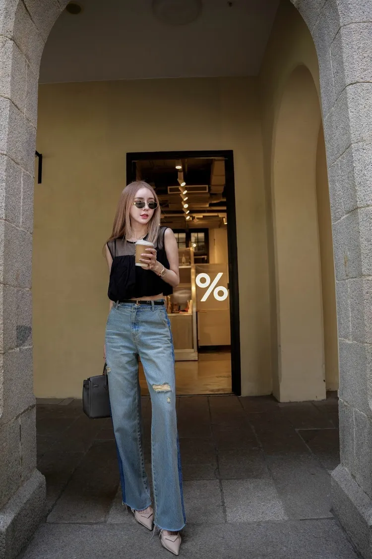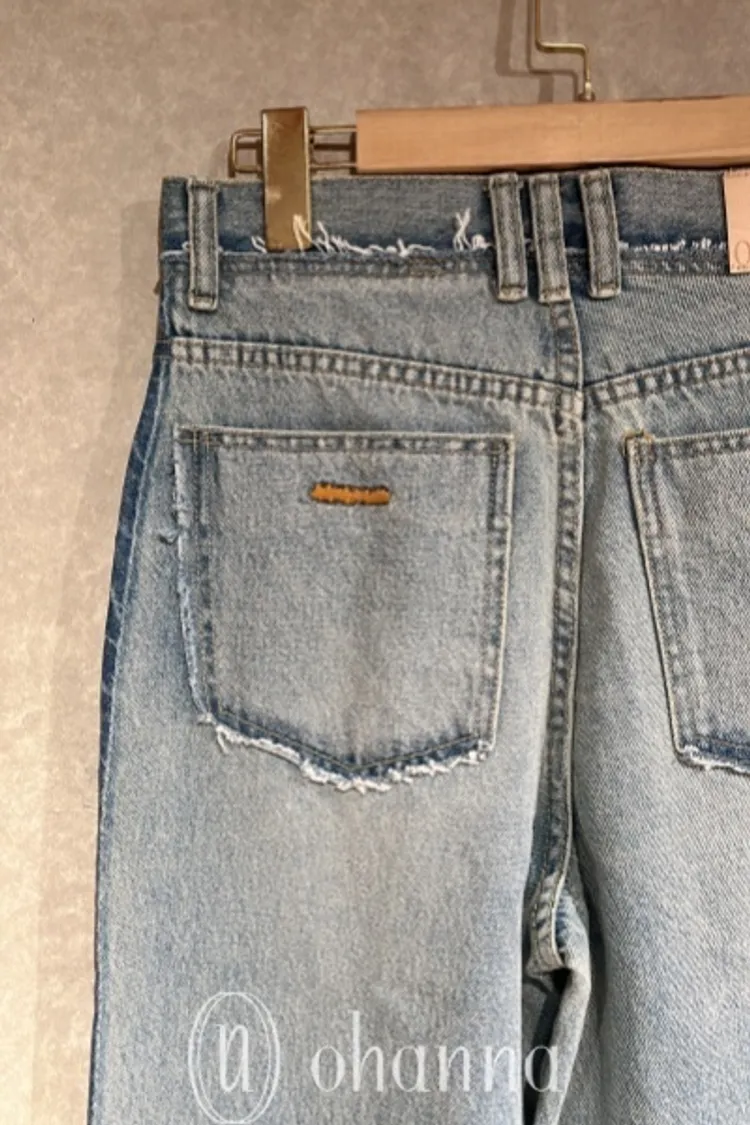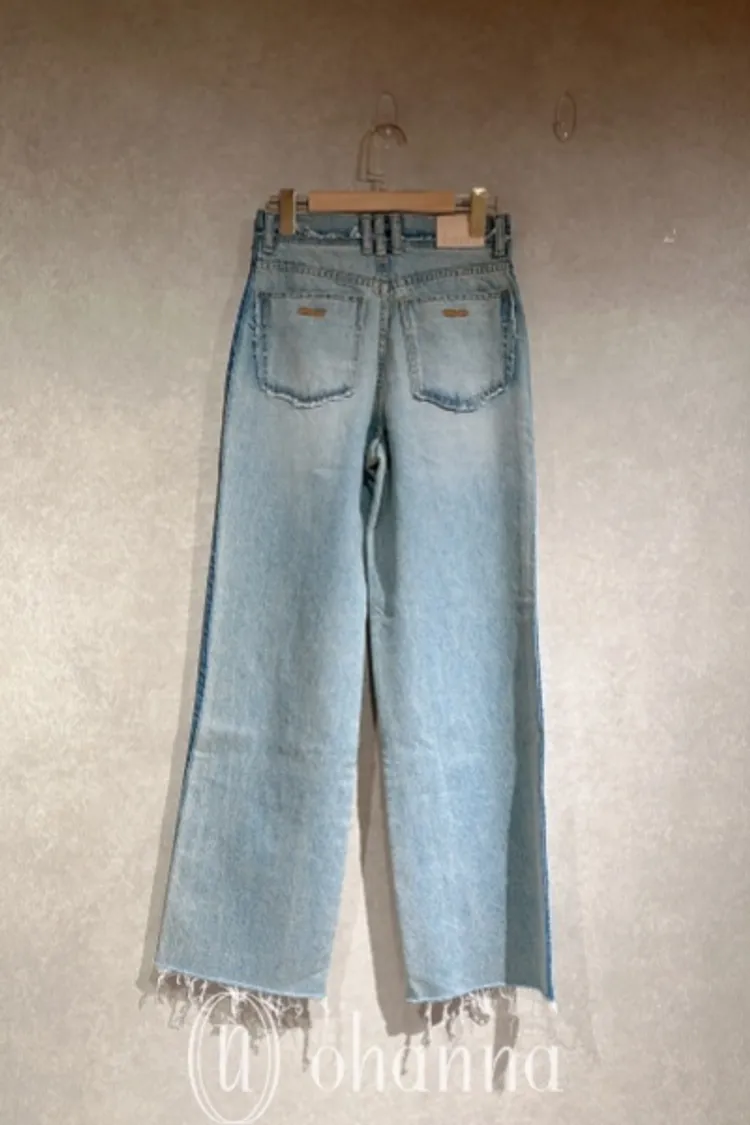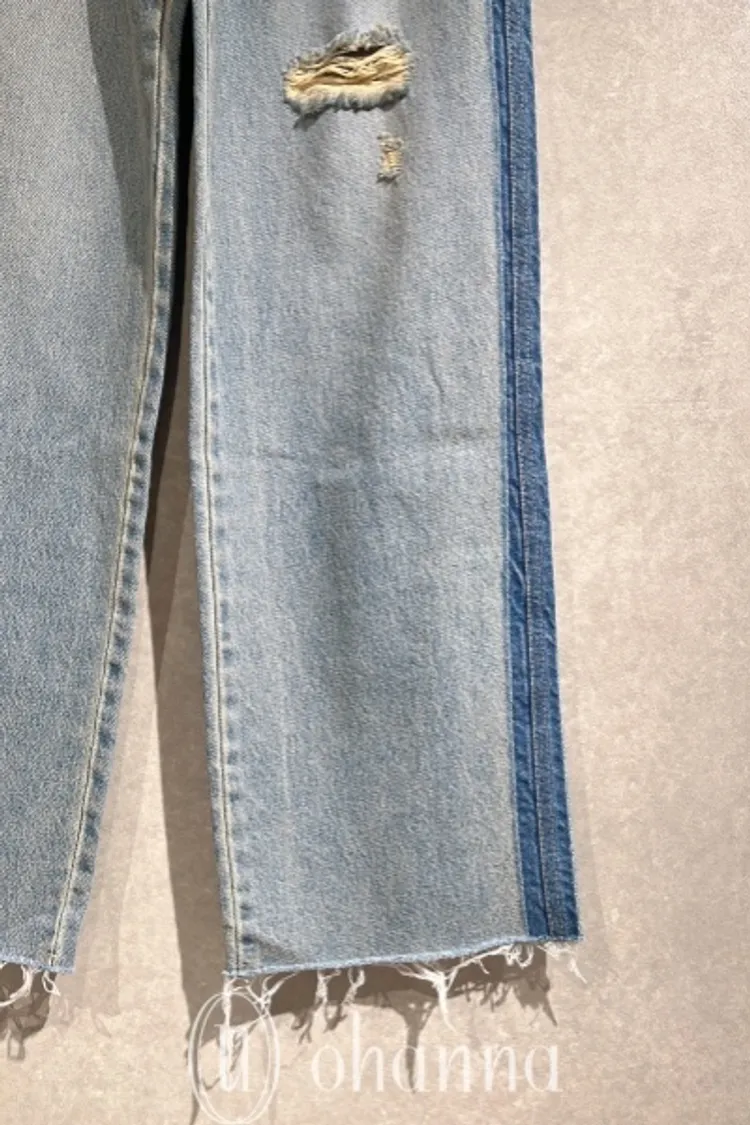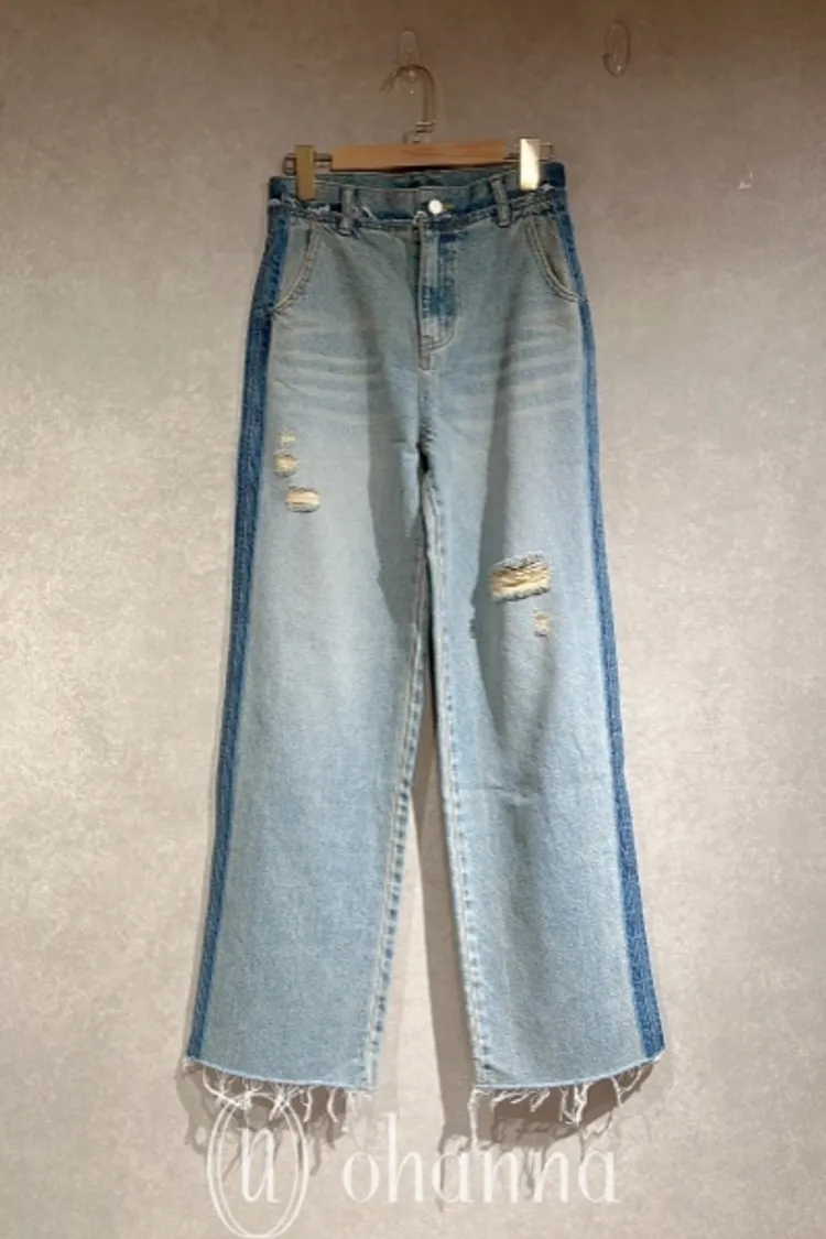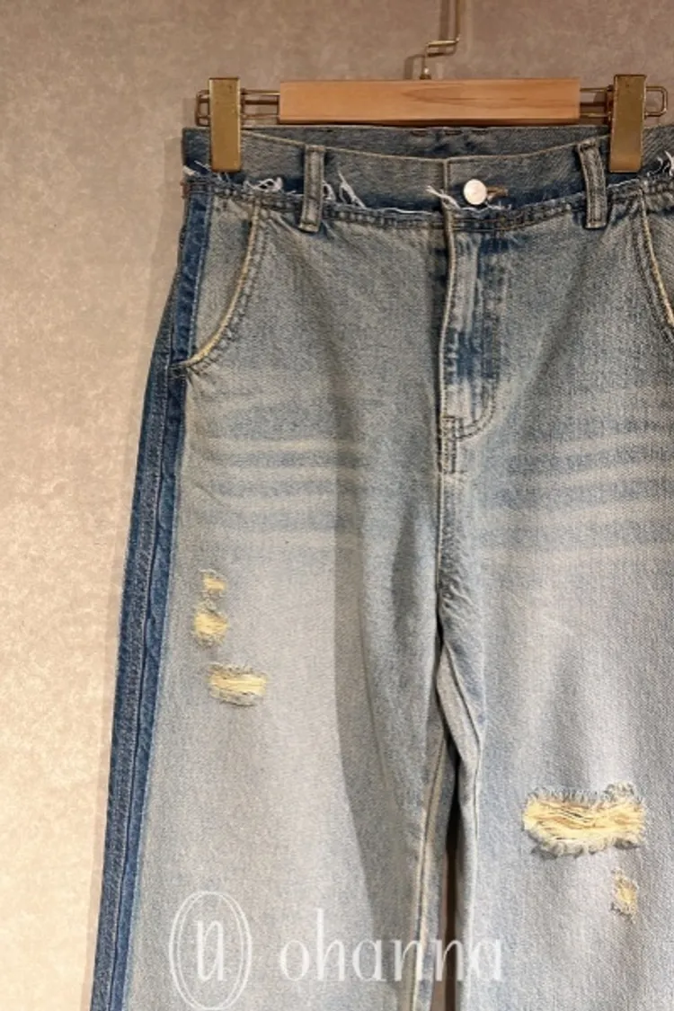 M027(自訂款)淺藍側拼色刷破不收邊牛仔褲