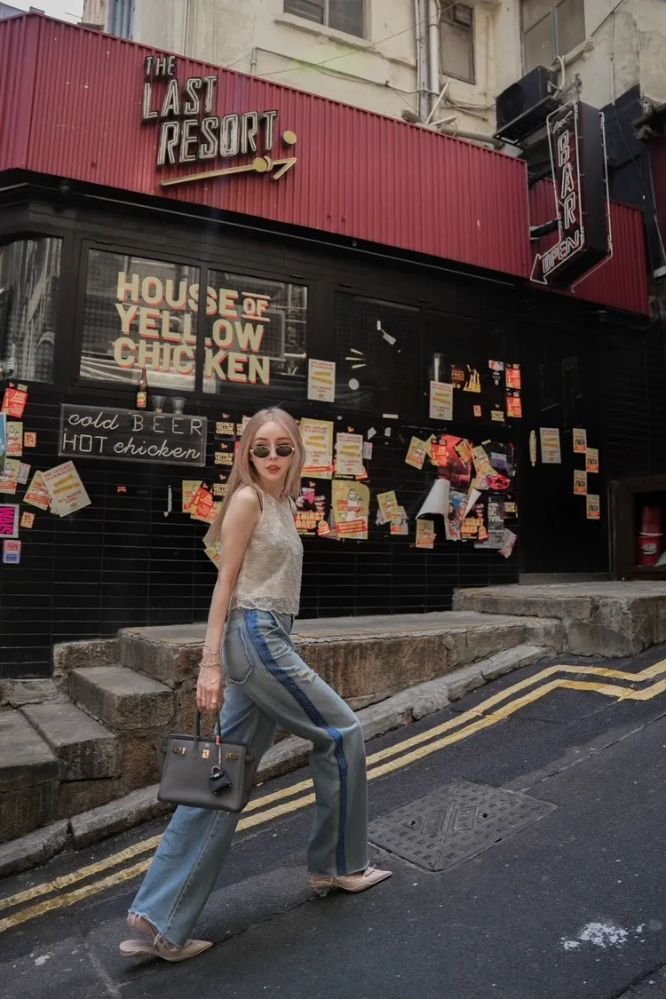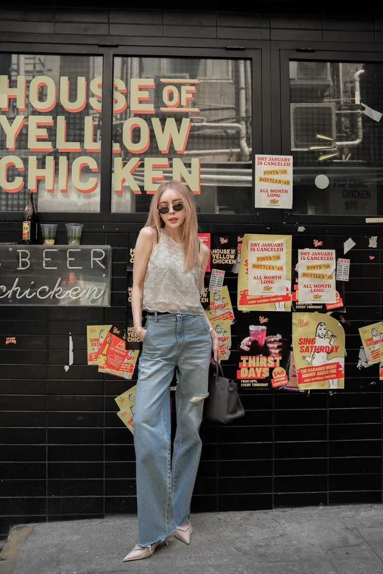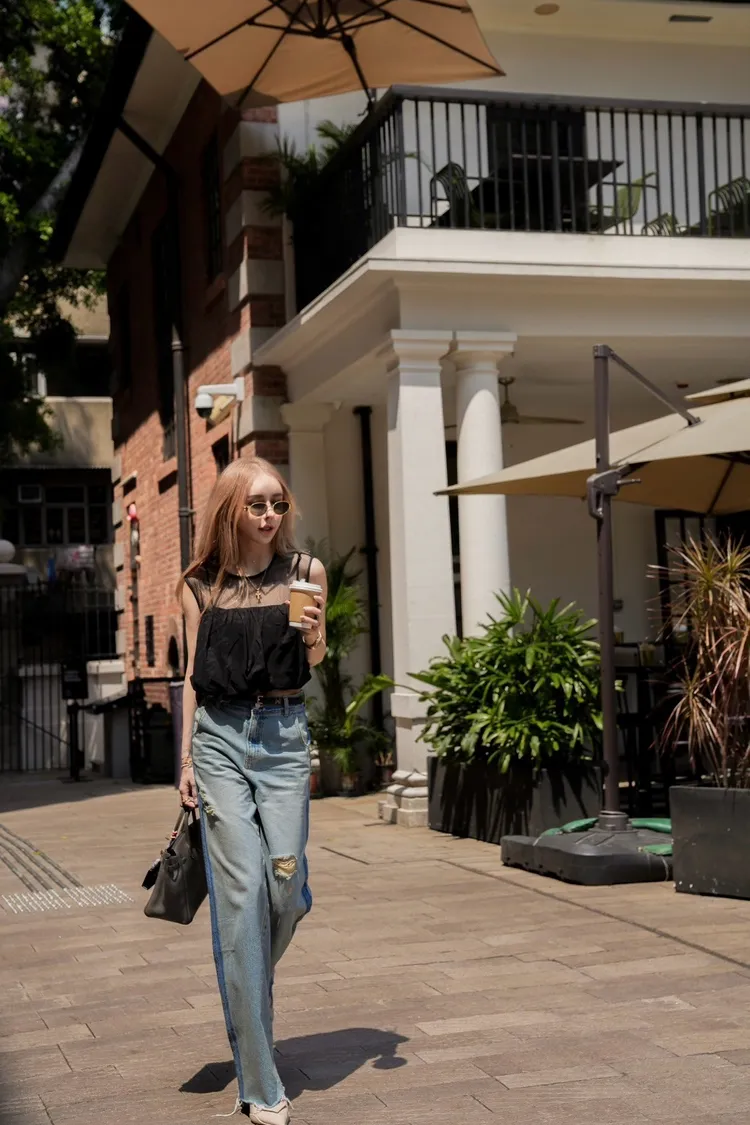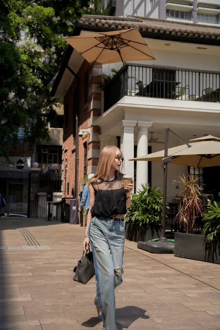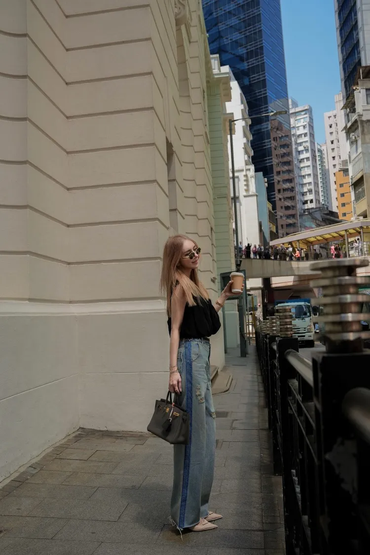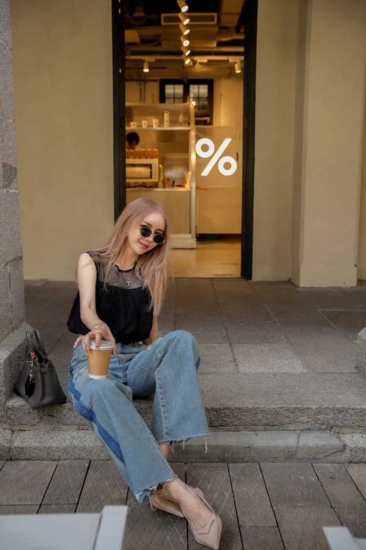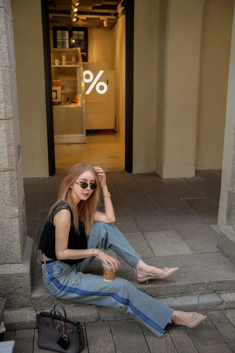 M027(自訂款)淺藍側拼色刷破不收邊牛仔褲