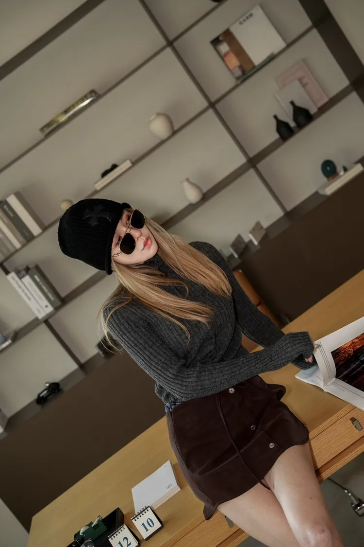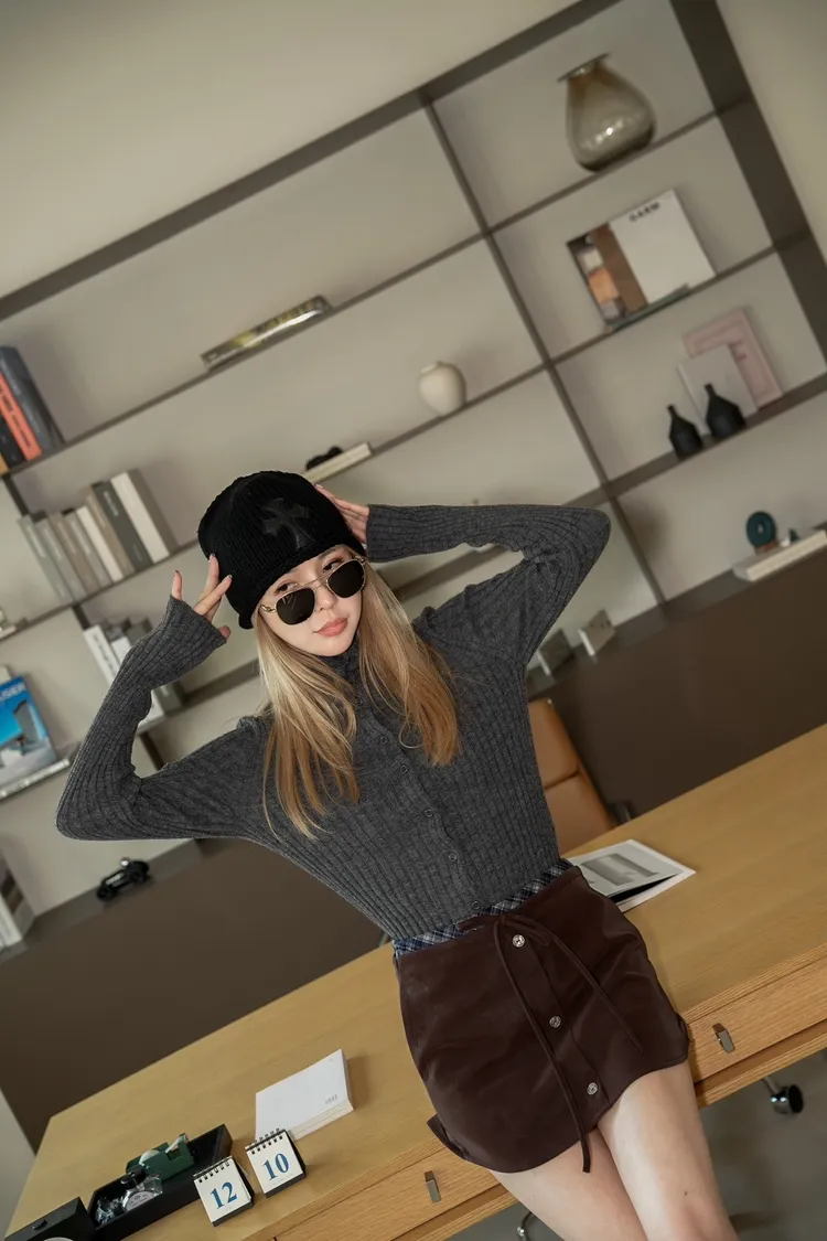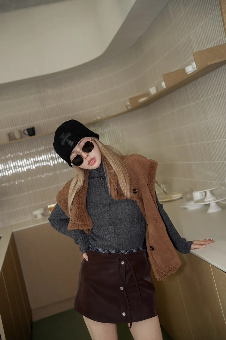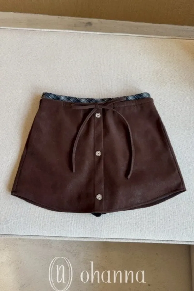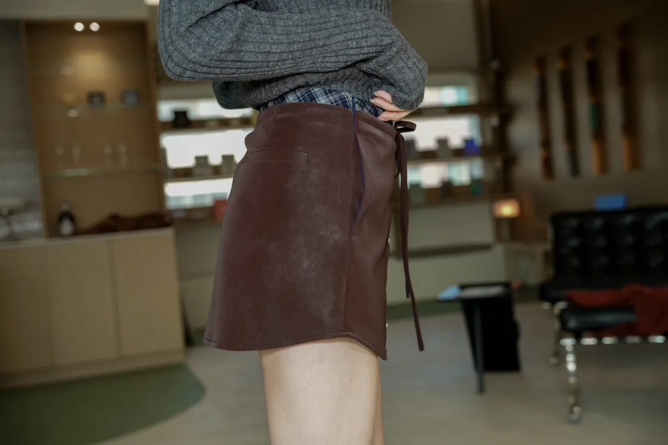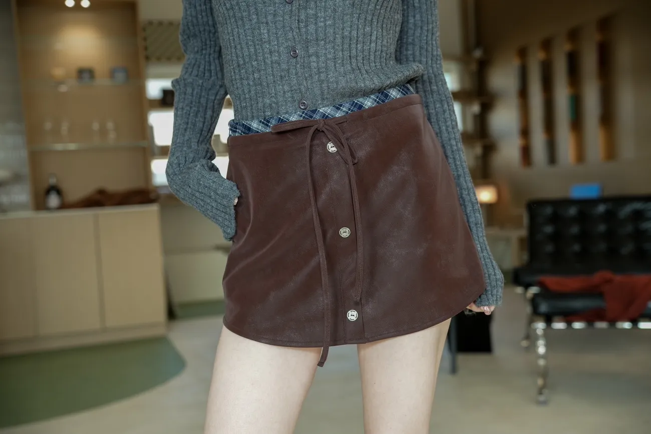 N070(自訂款)咖啡皮革上接格紋腰綁帶褲裙