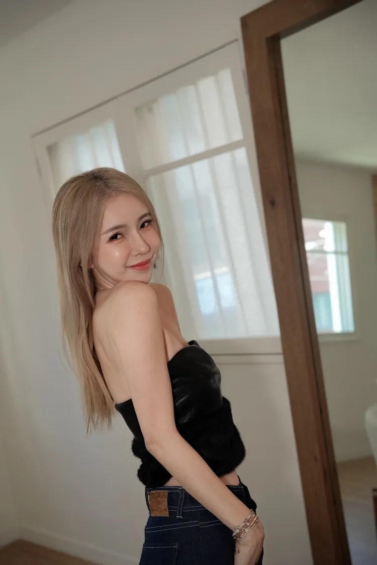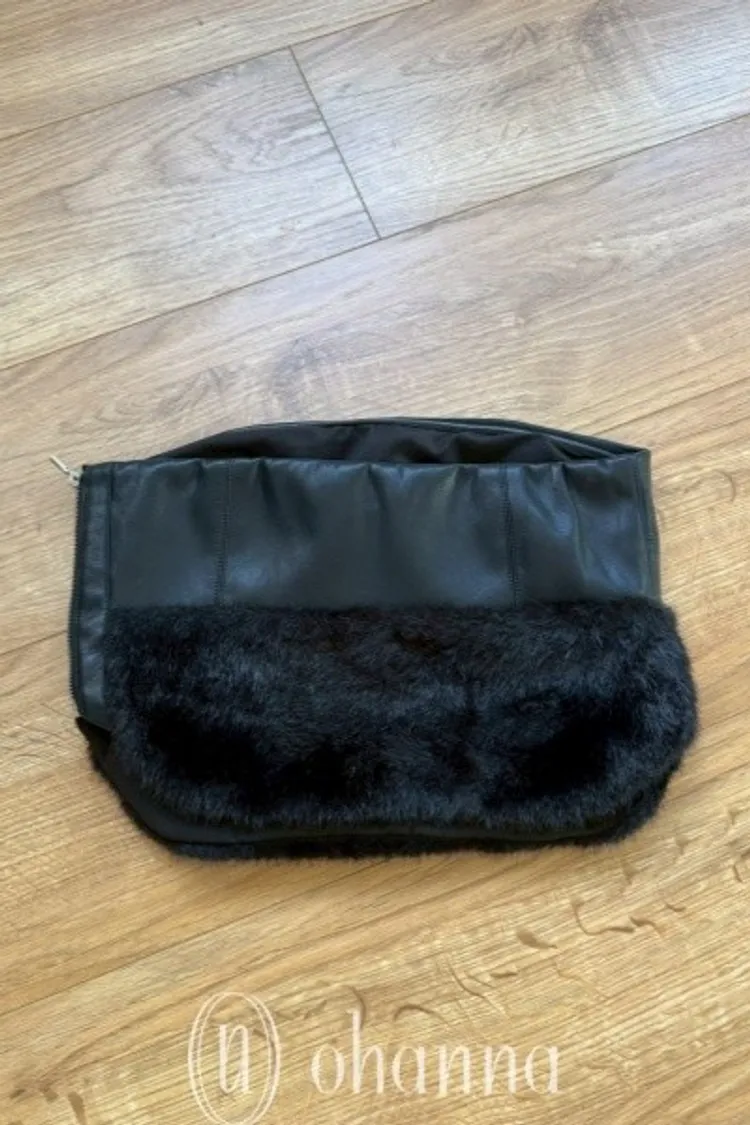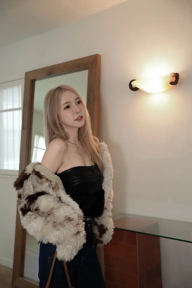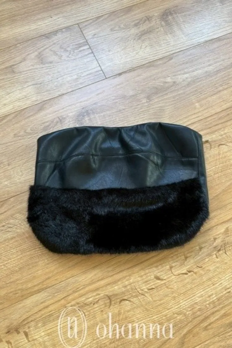 N110(自訂款)黑皮革下接毛毛平口上衣