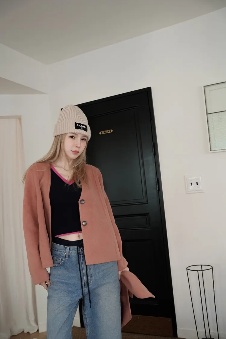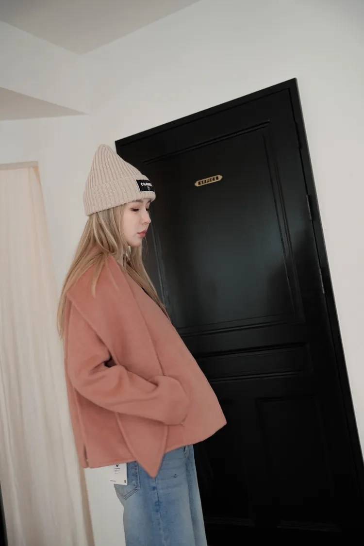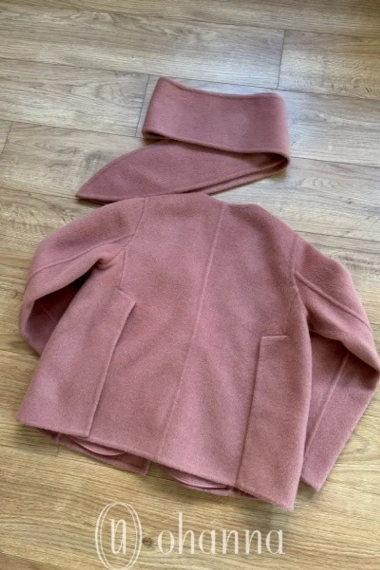 N111(自訂款)粉色無領傘狀羊毛外套(附圍巾)