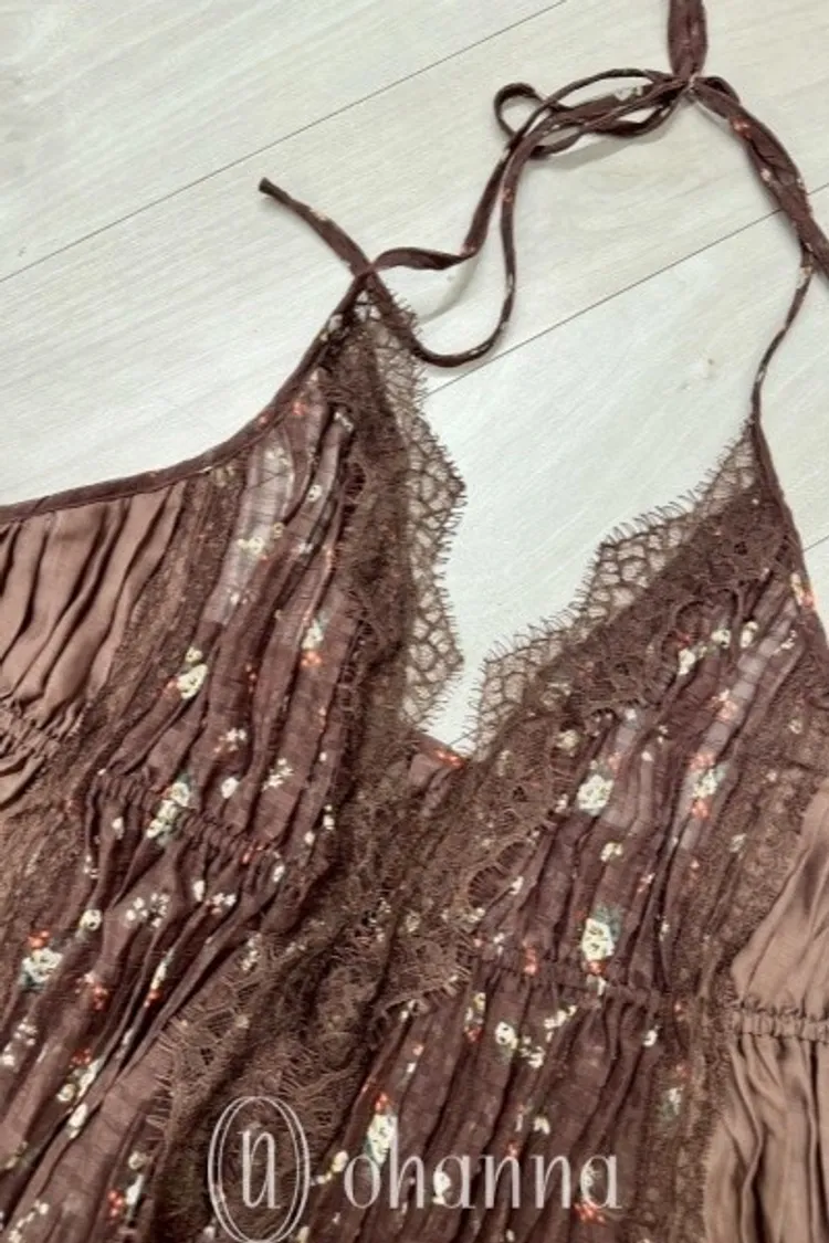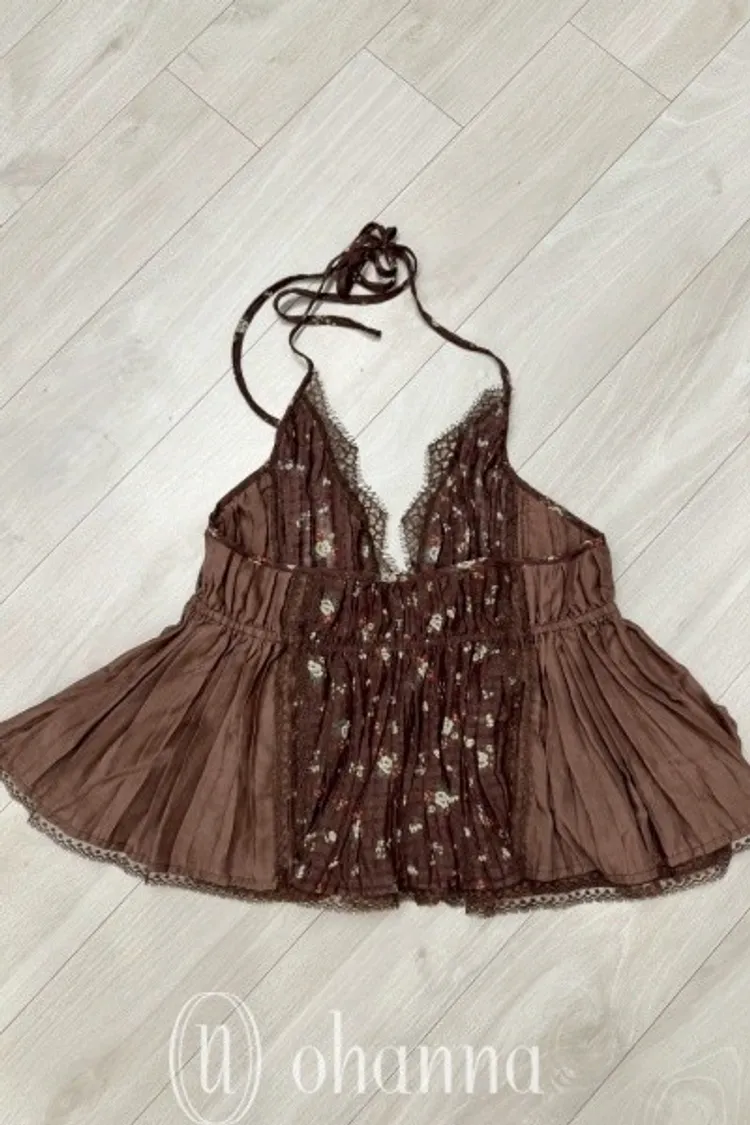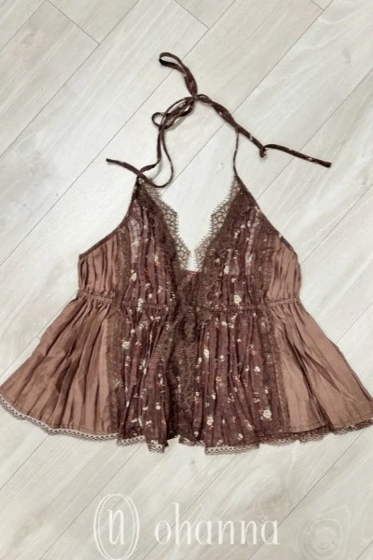 S048(自訂款)咖色小碎花拼接蕾絲抓皺細肩帶背心