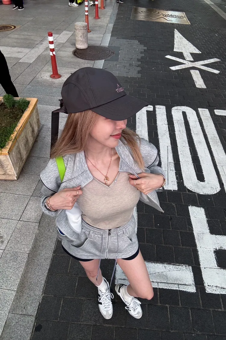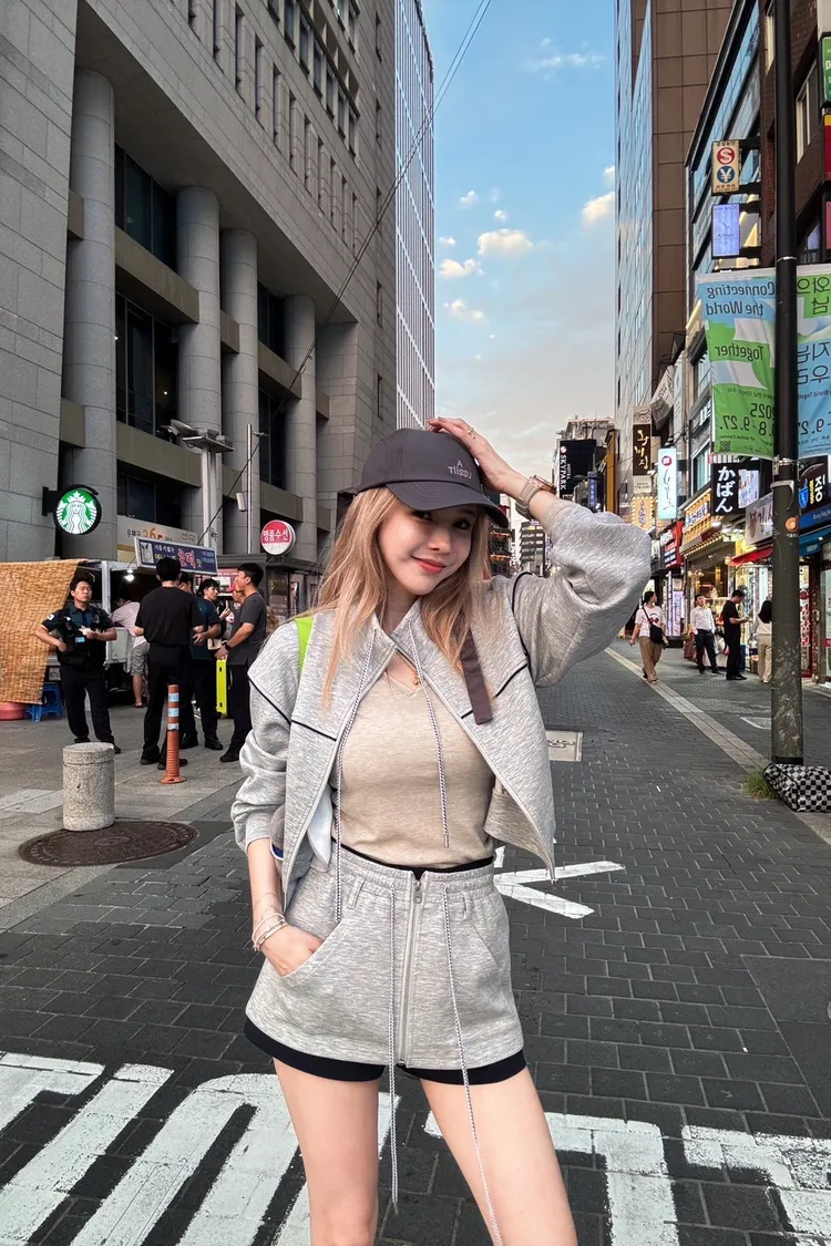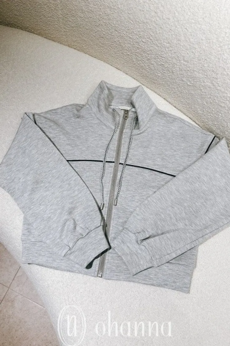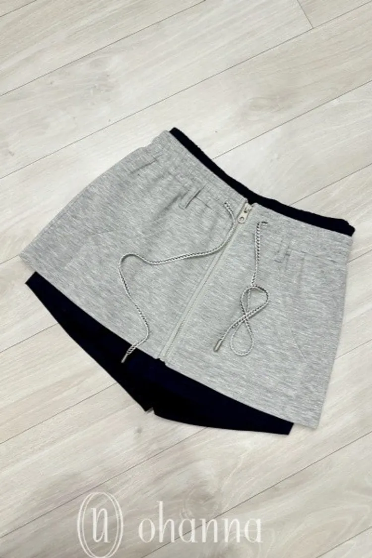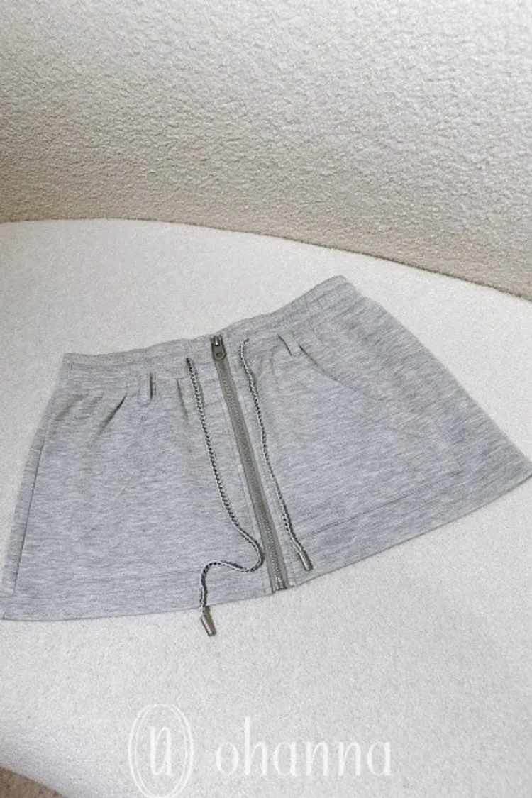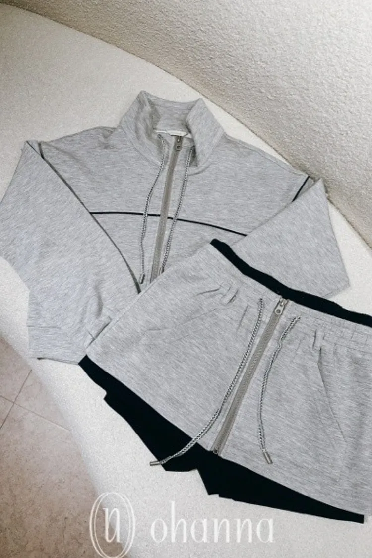 S053(自訂款)灰色流線立領抽繩拉鏈外套+外罩裙短褲 一組賣