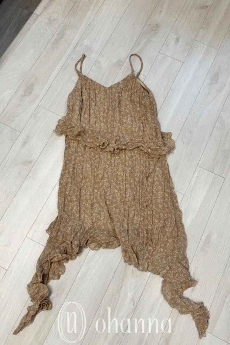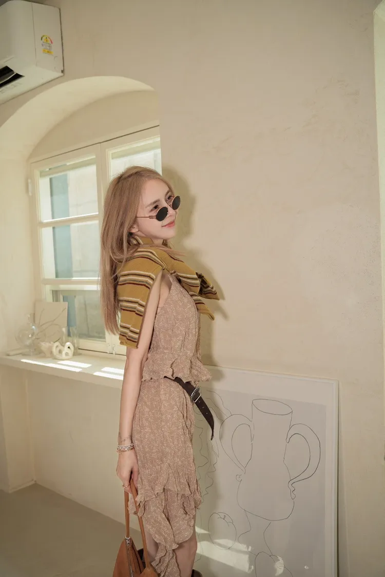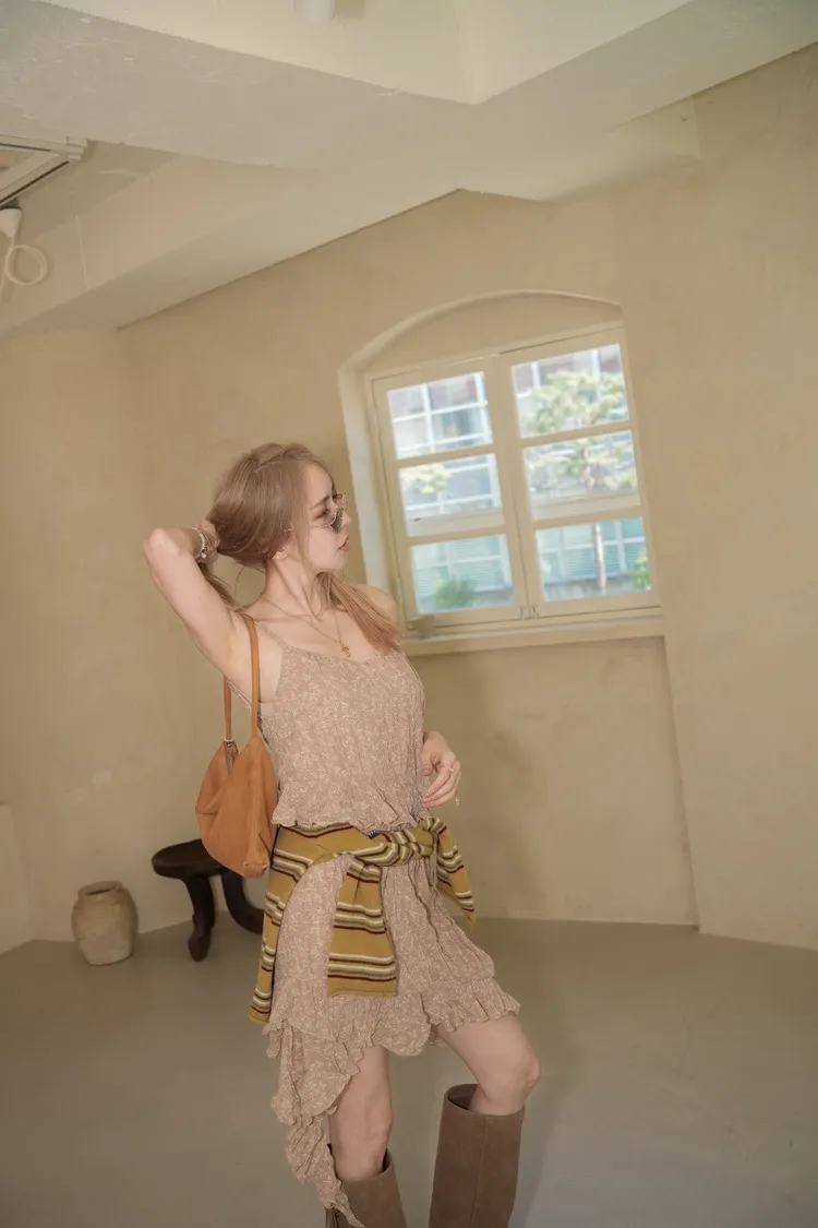 S059(自訂款)淺駝色皺褶荷葉垂擺細肩帶洋裝(附腰帶)