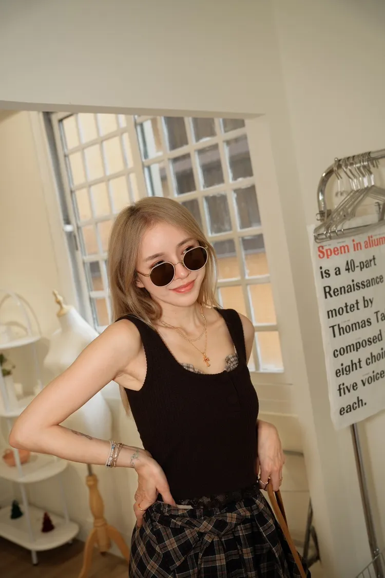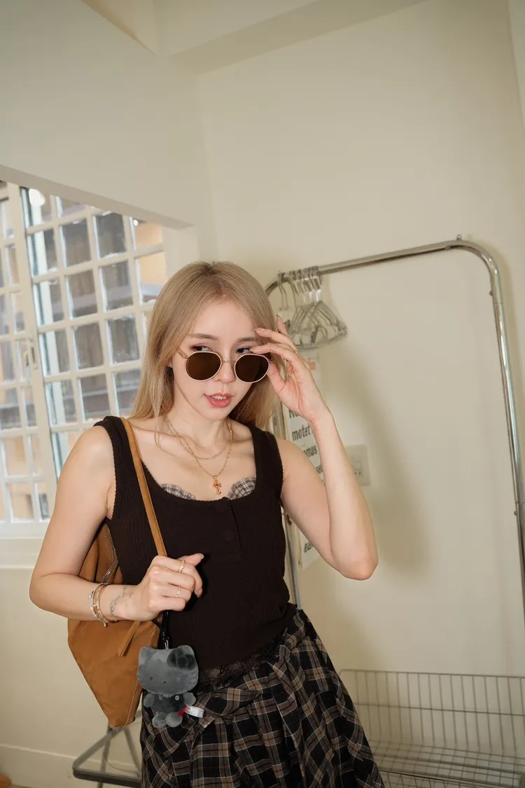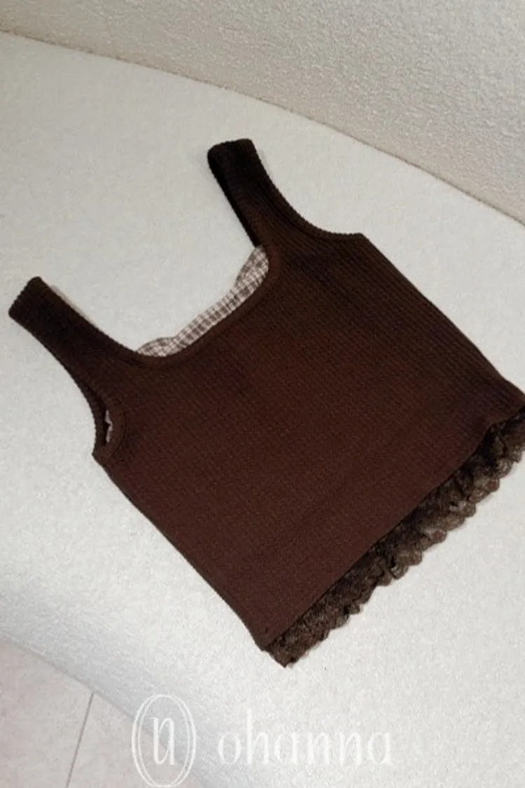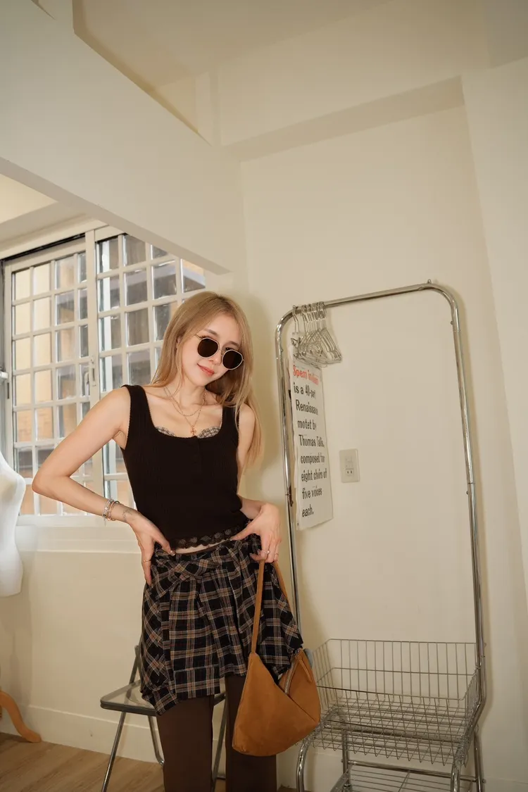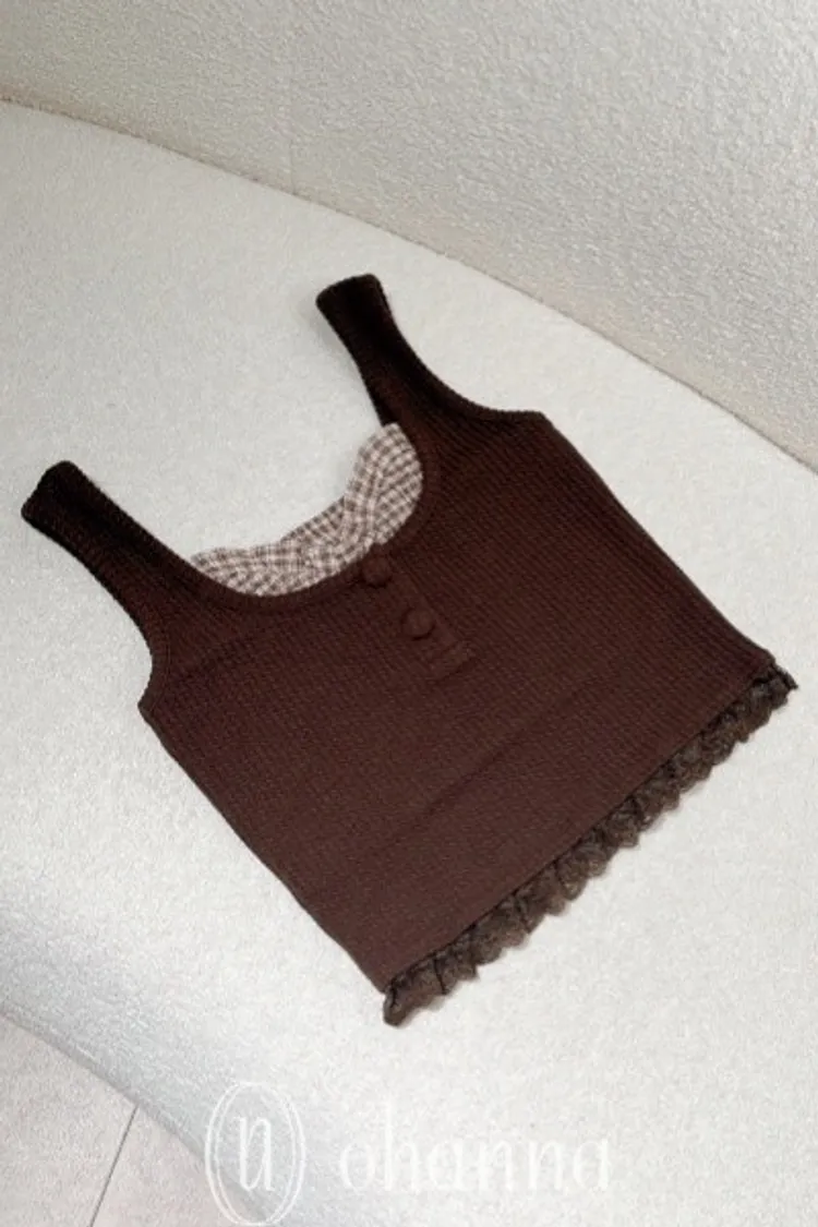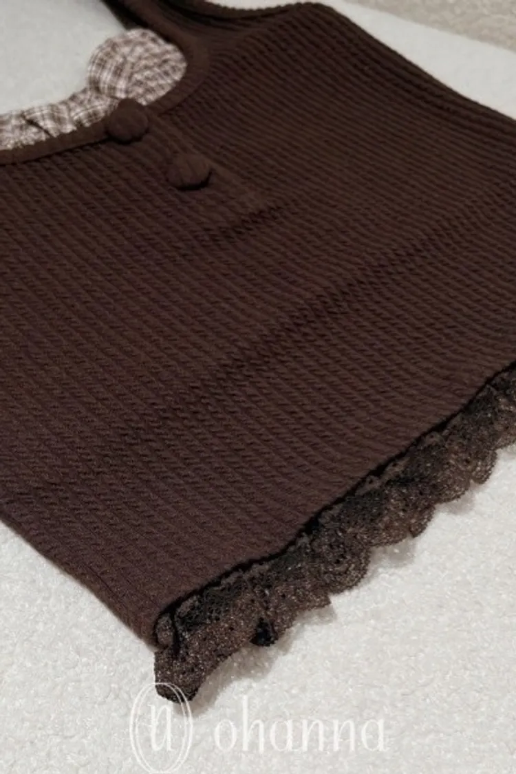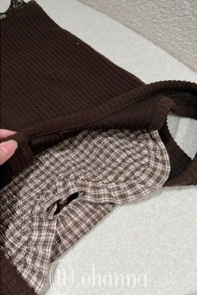 S063(自訂款)咖色拼接格紋下擺蕾絲背心