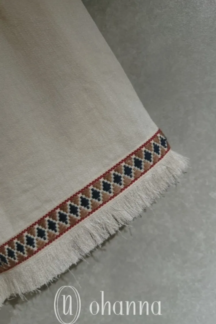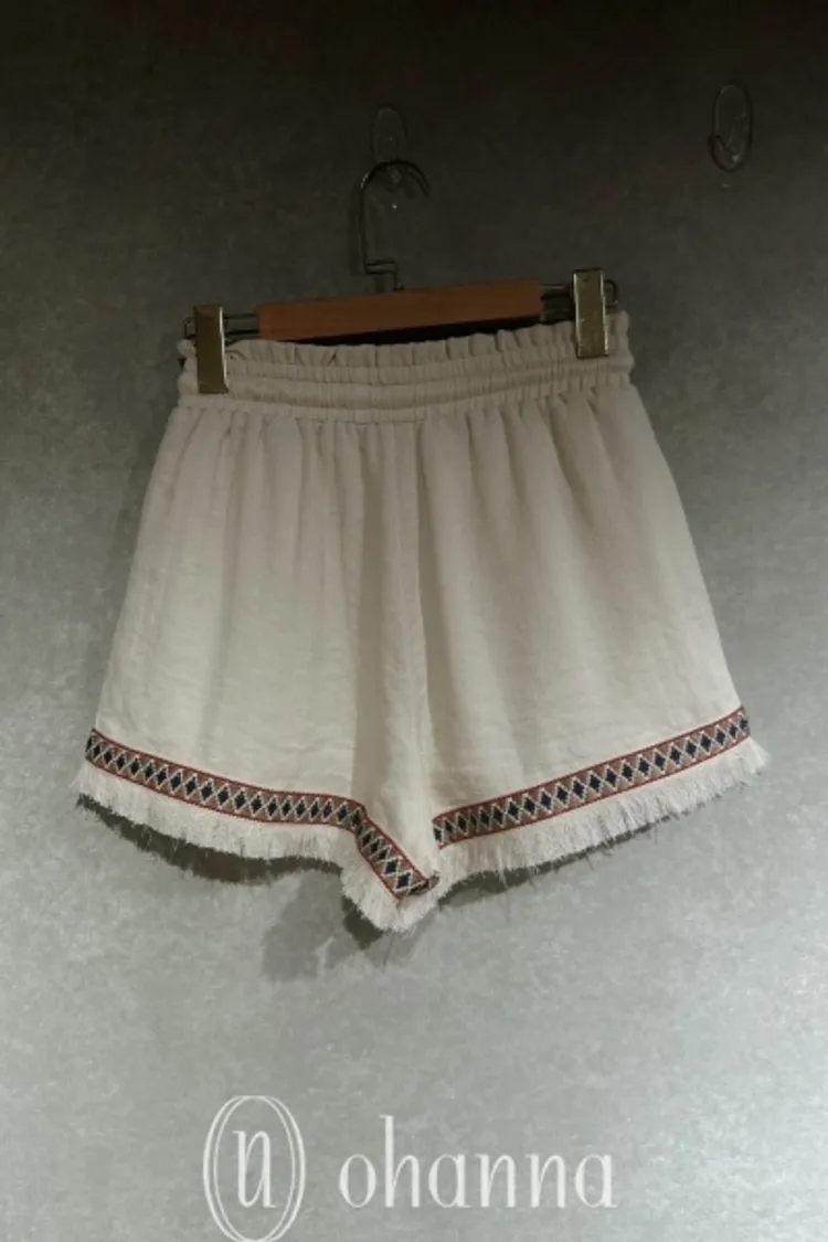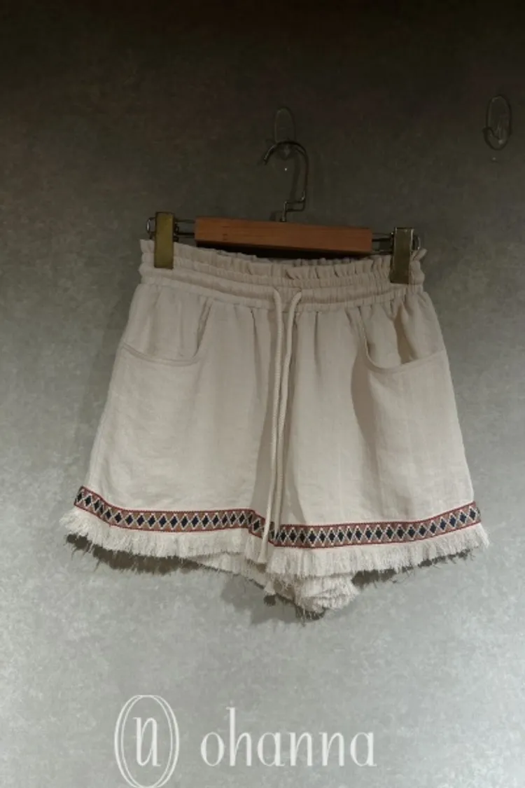 U014(自訂款)杏色下擺圖騰鬚感麻料短褲