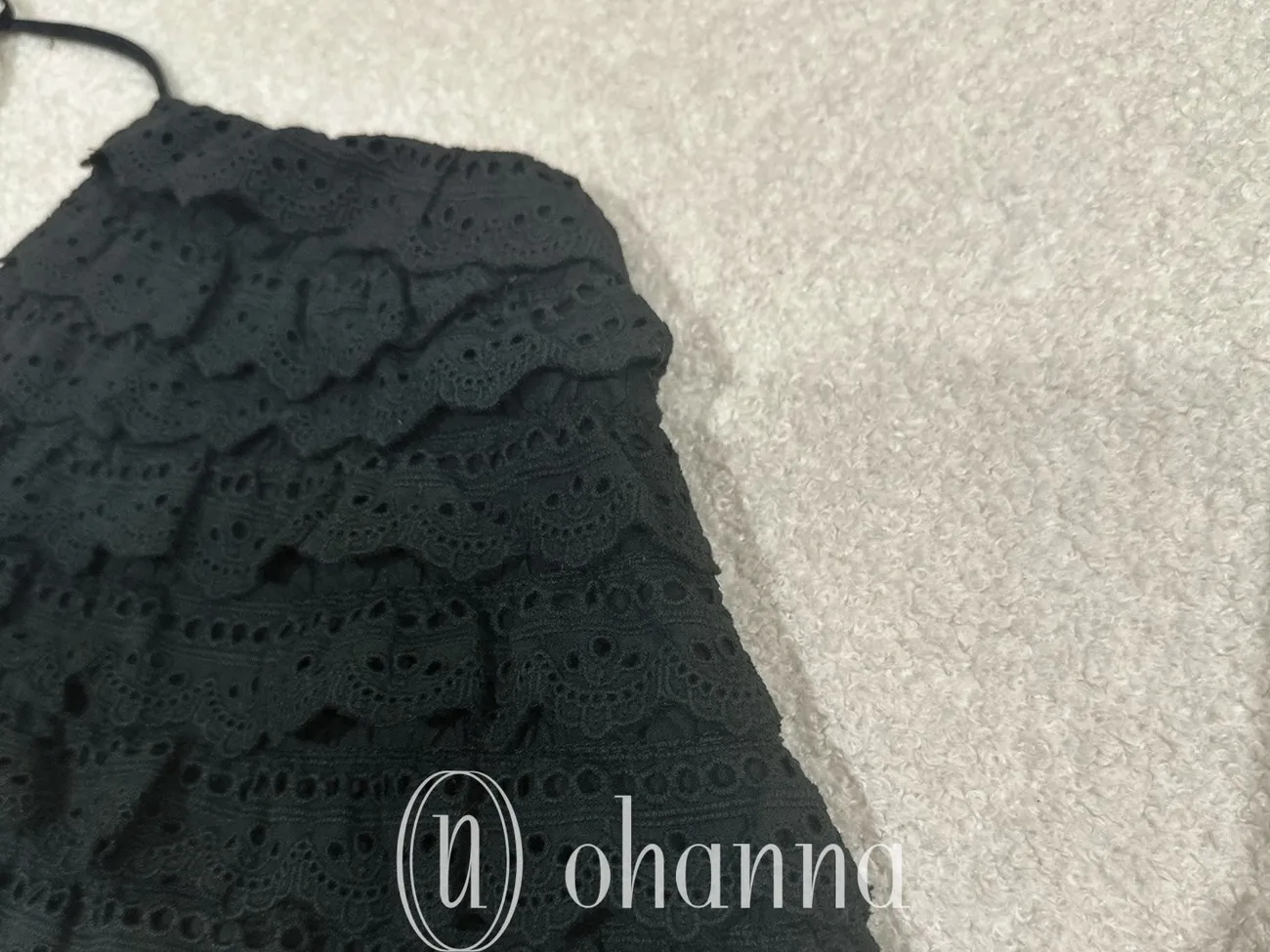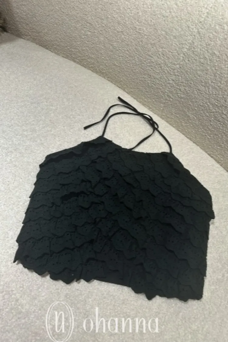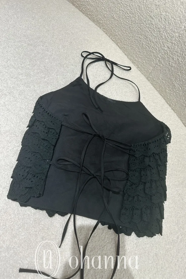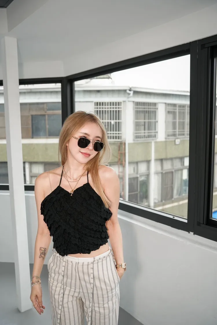 U017(自訂款)黑色布緹花小荷葉美背綁帶背心