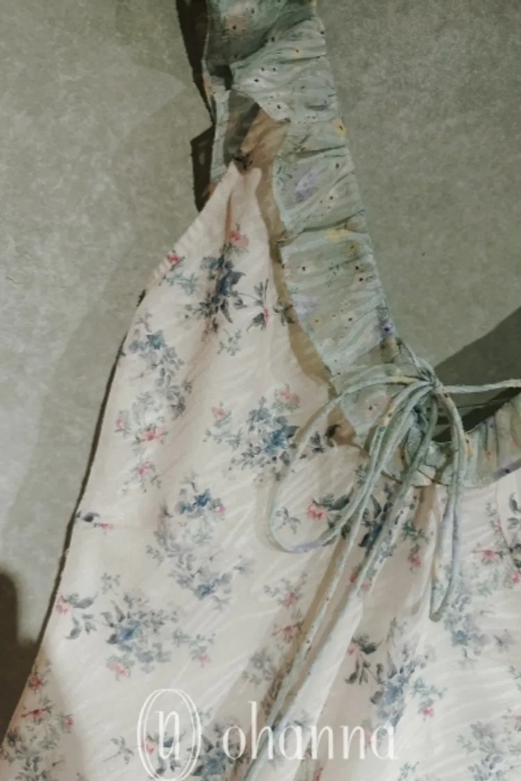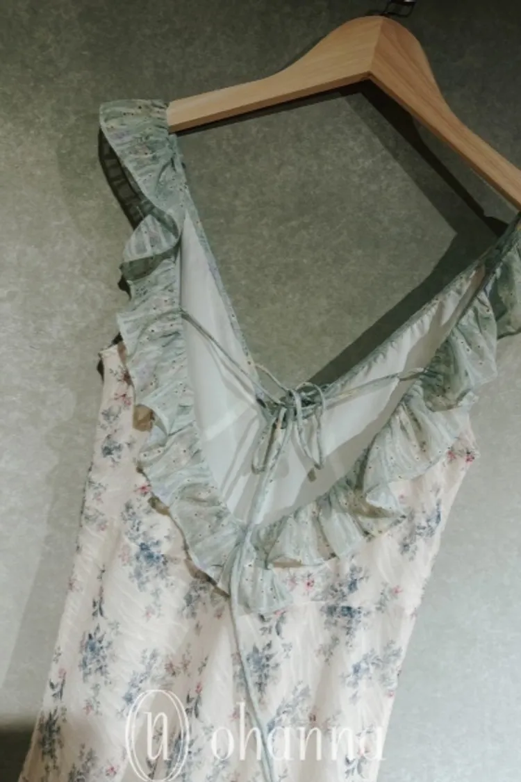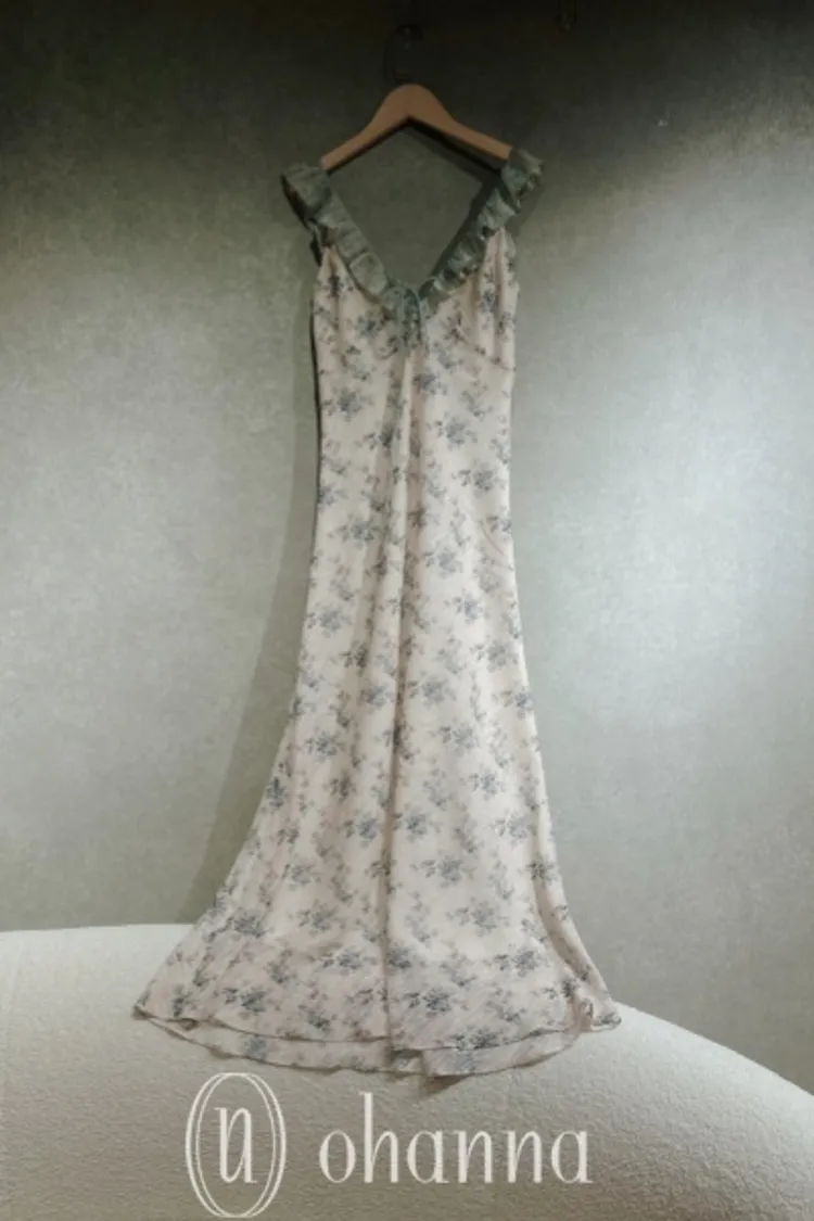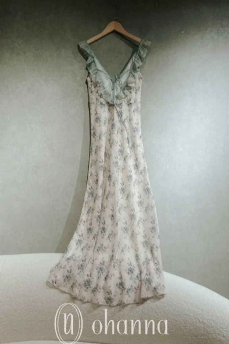 U026(自訂款)杏色小碎花領綠邊v領長洋裝