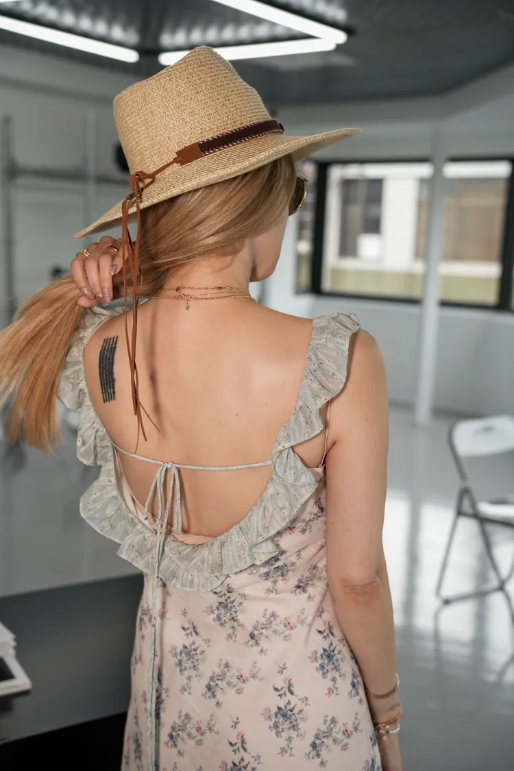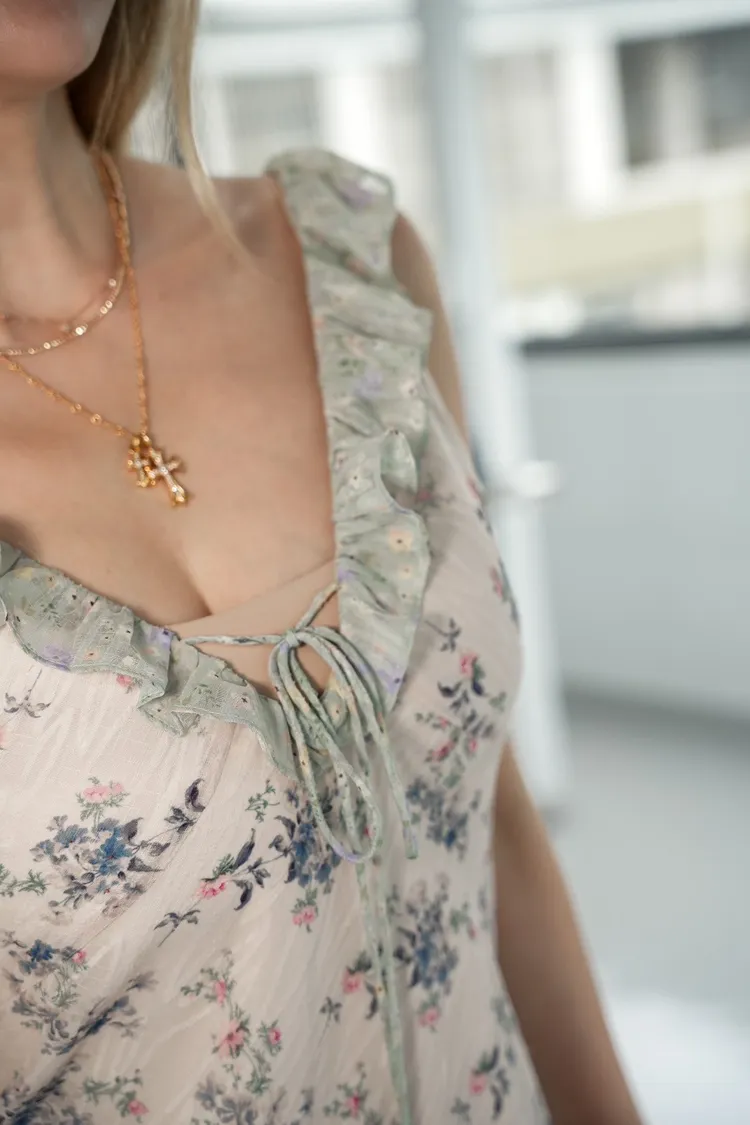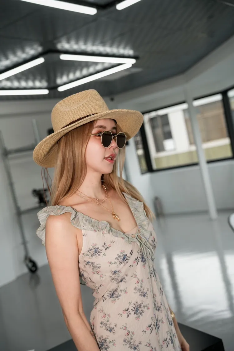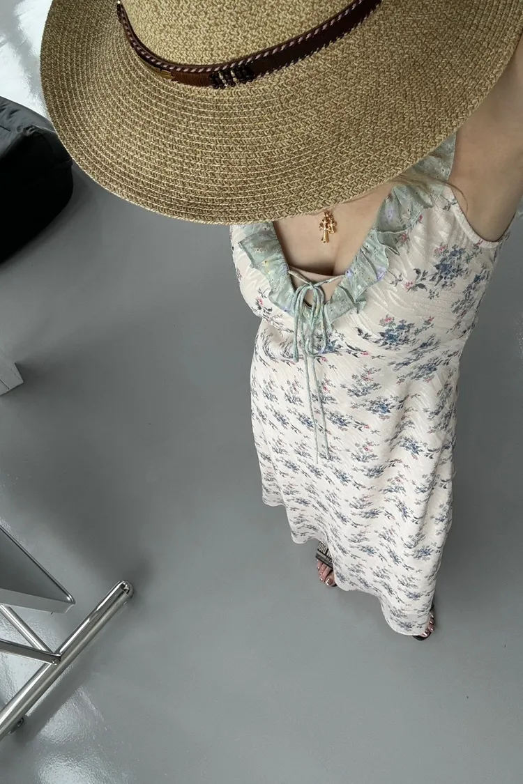 U026(自訂款)杏色小碎花領綠邊v領長洋裝