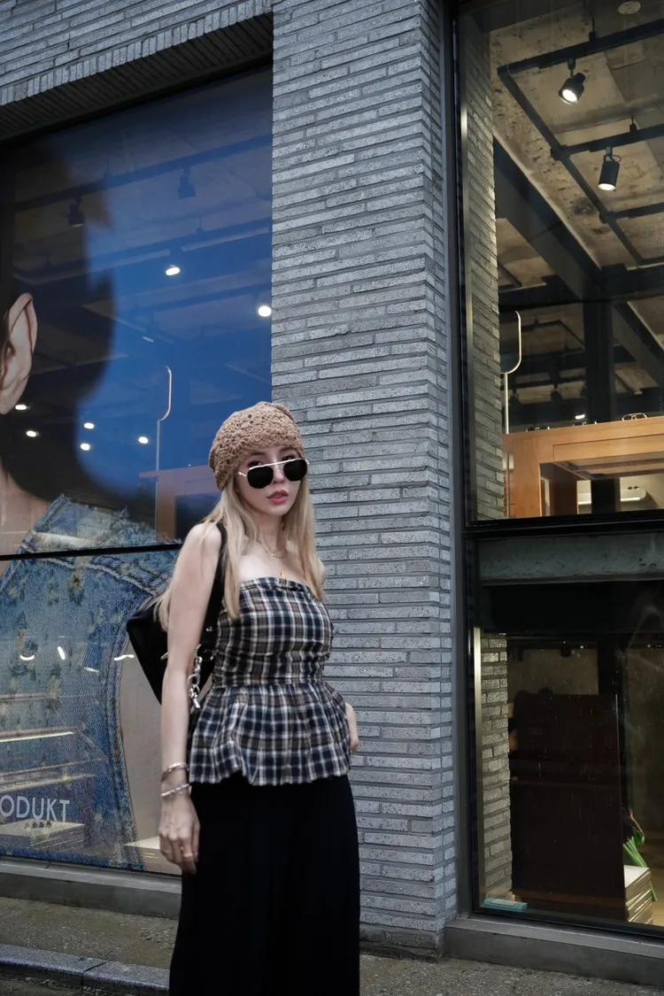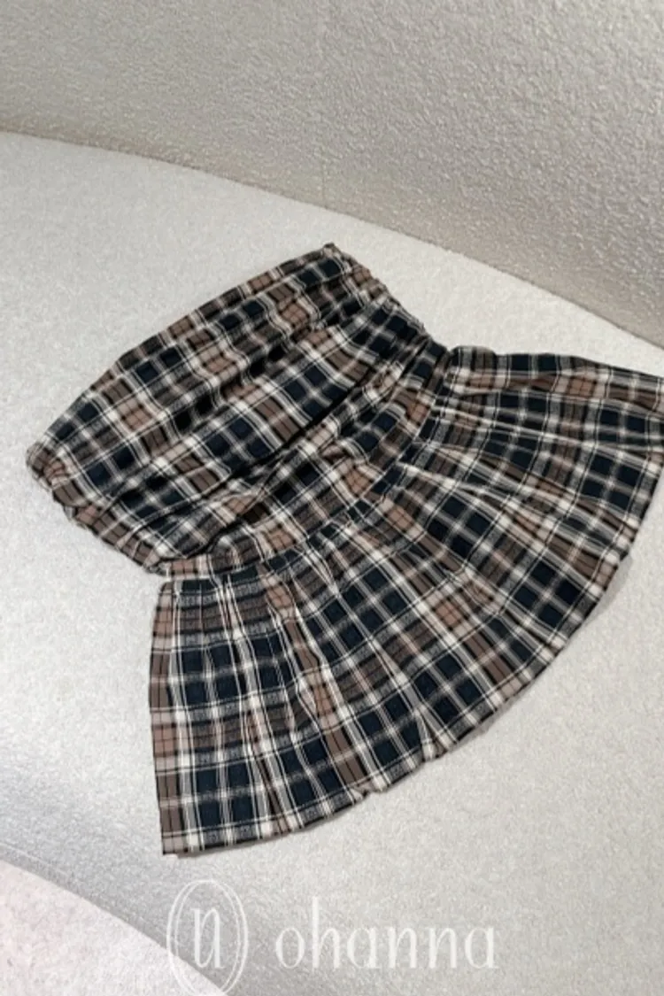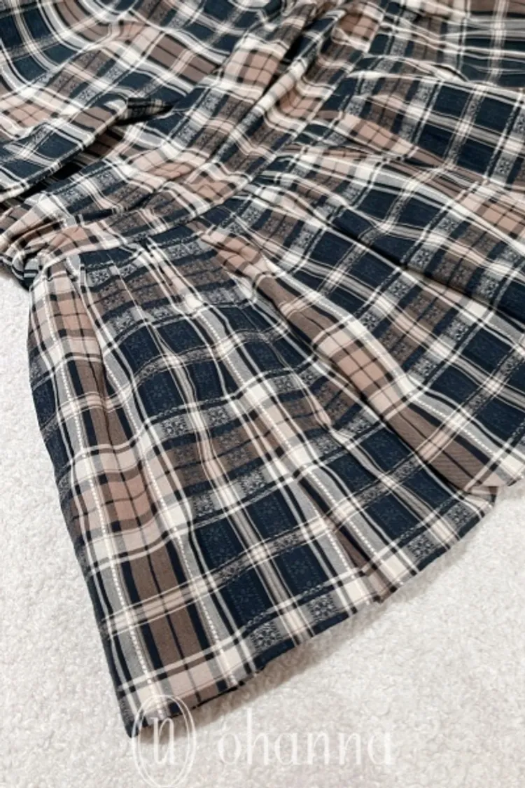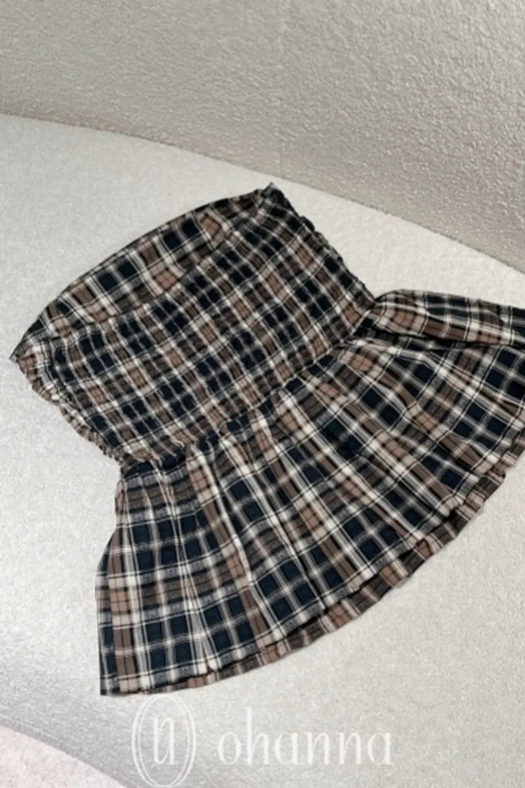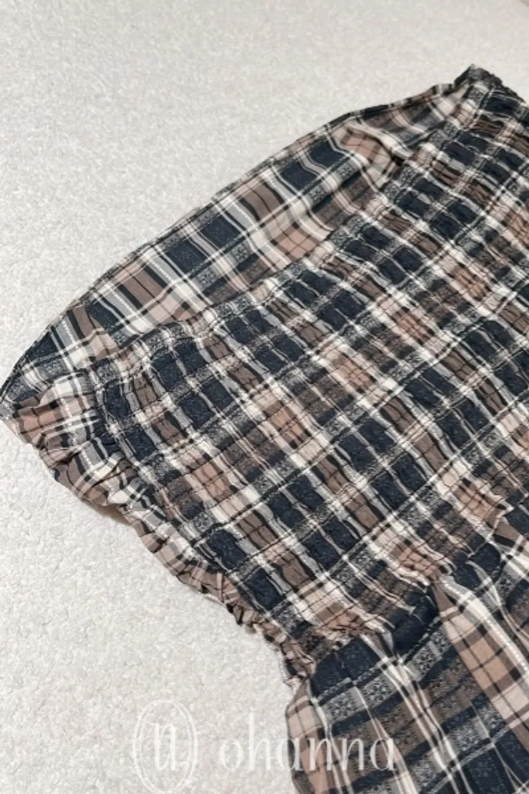 U034(自訂款)深藍混色格紋胸抓皺傘狀平口上衣