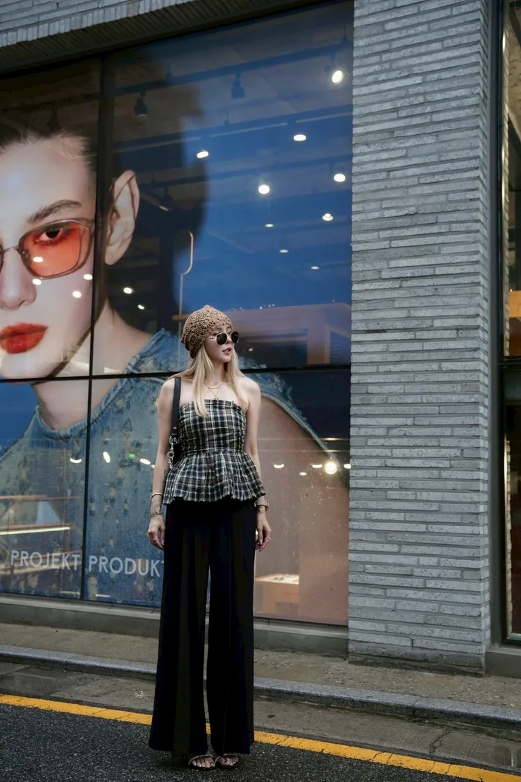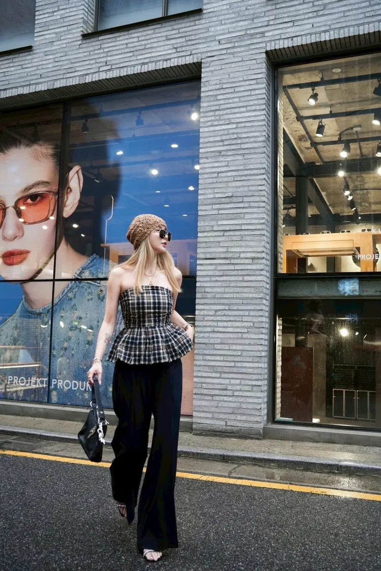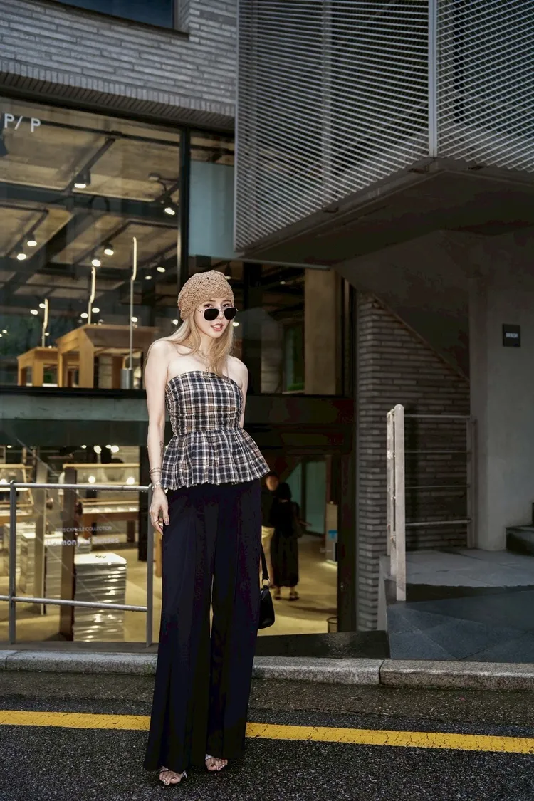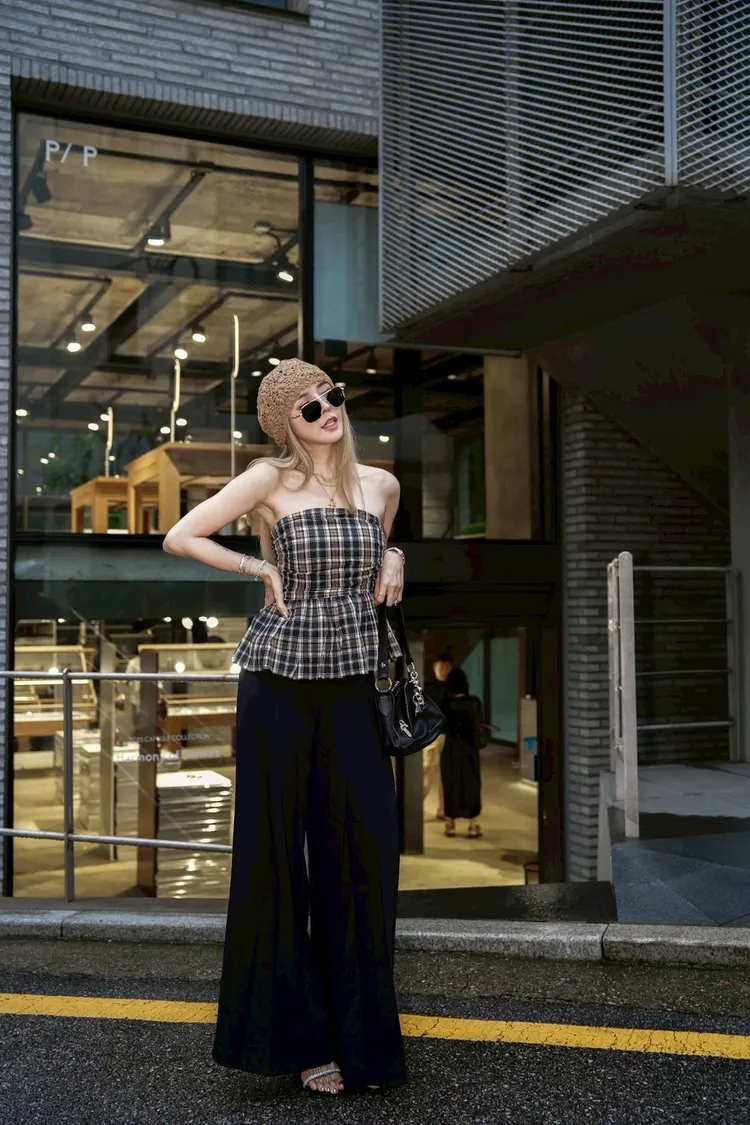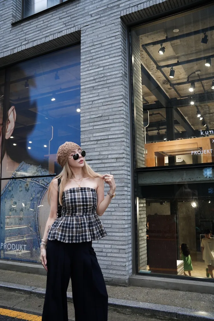U034(自訂款)深藍混色格紋胸抓皺傘狀平口上衣