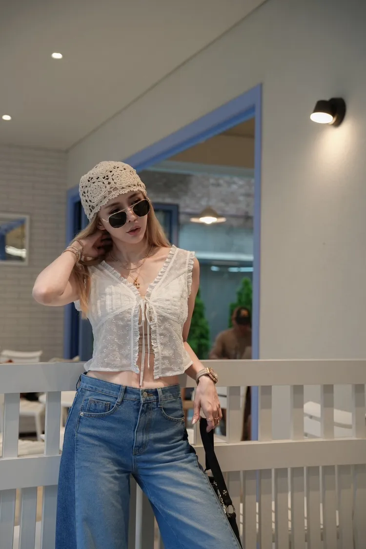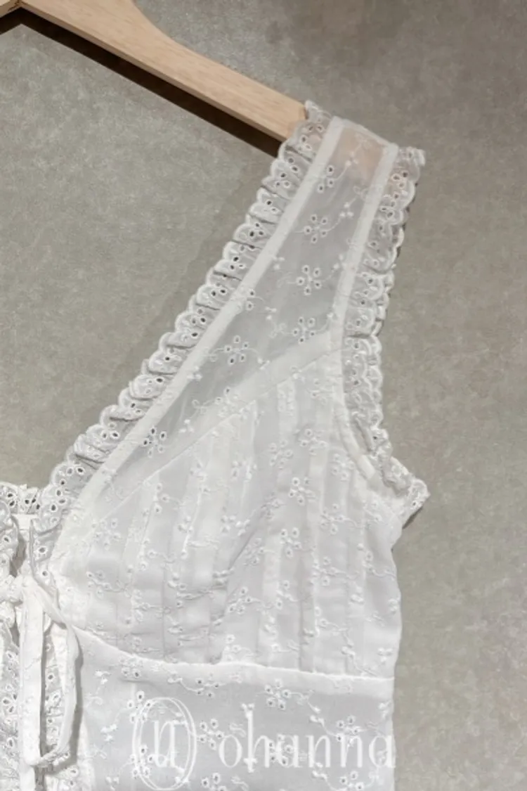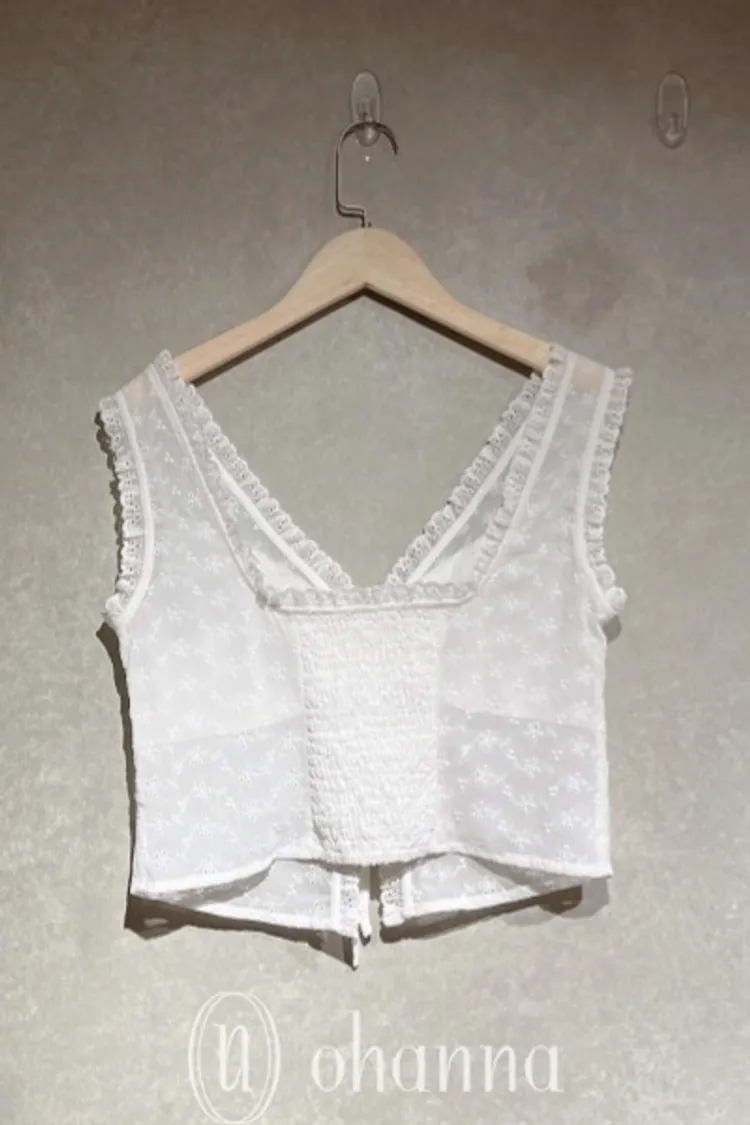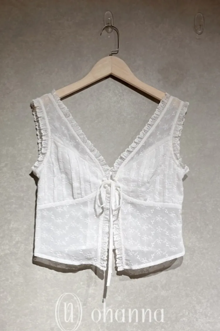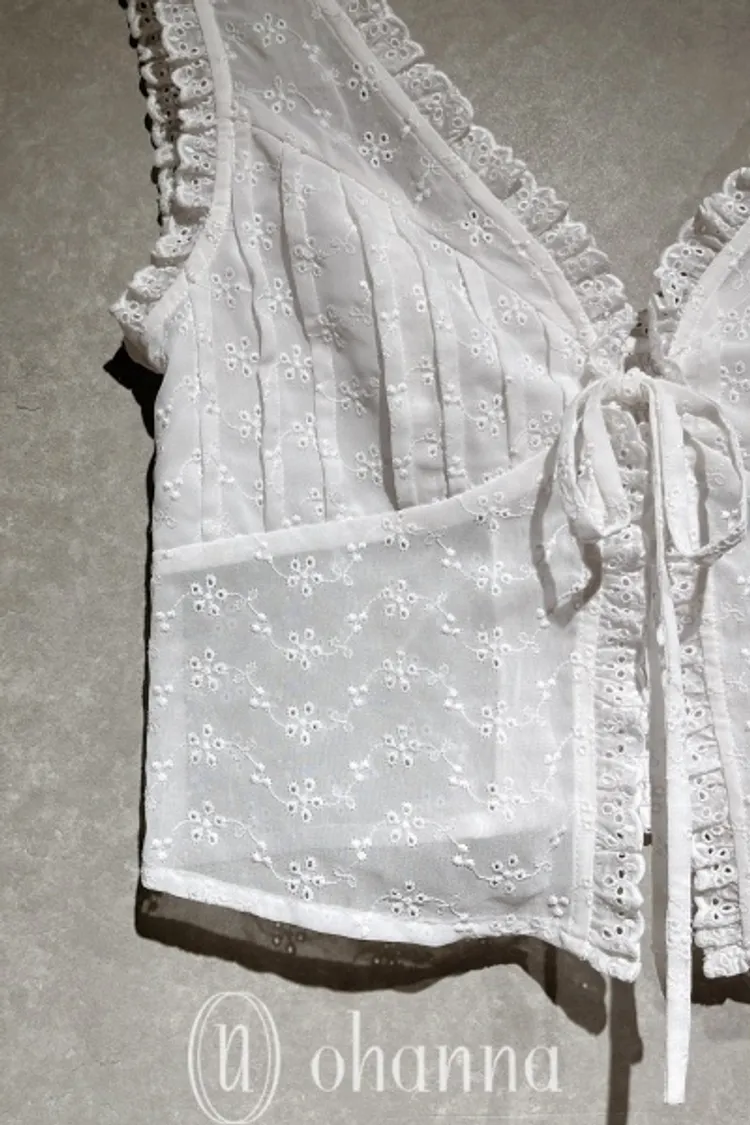 U043(自訂款)白色緹花胸壓褶綁帶透膚背心