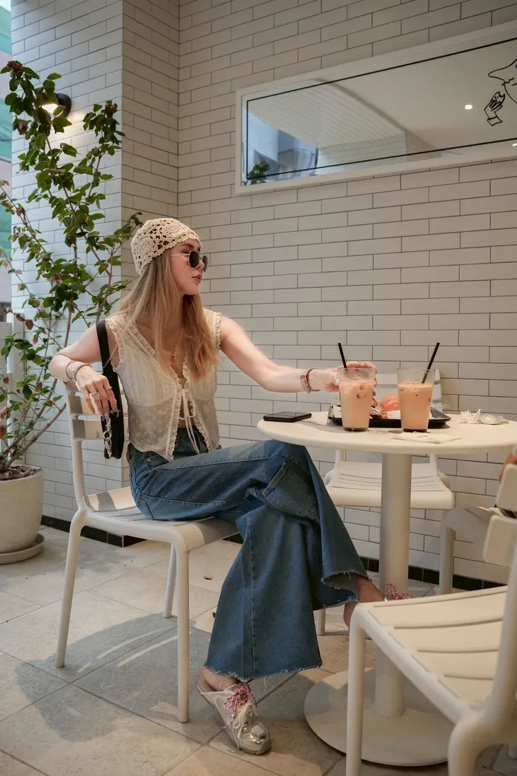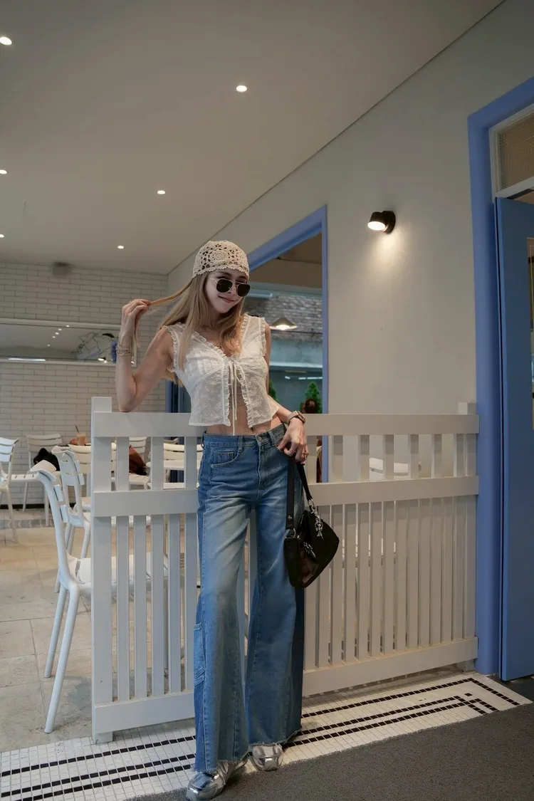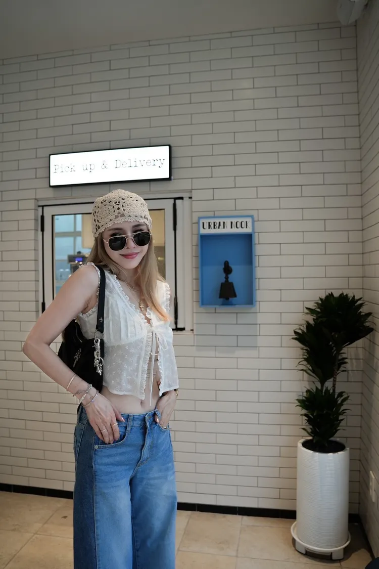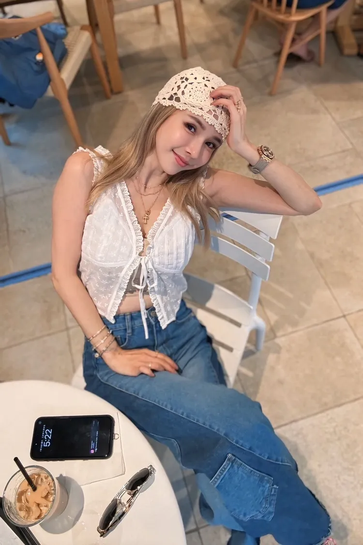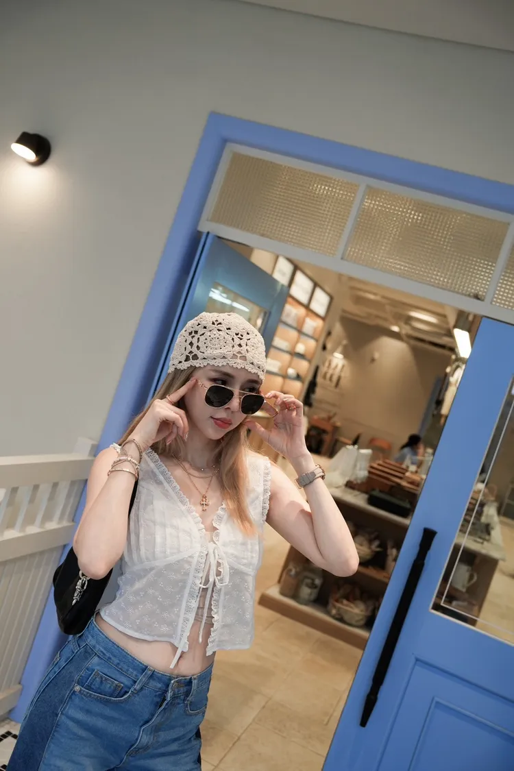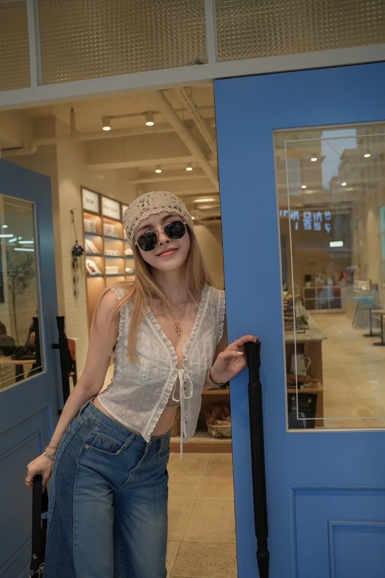 U043(自訂款)白色緹花胸壓褶綁帶透膚背心