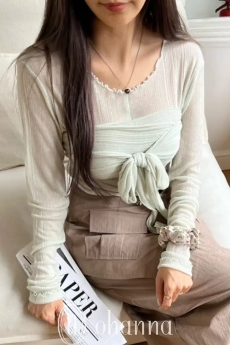 U184木耳邊透膚上衣+平口綁帶背心 一組賣