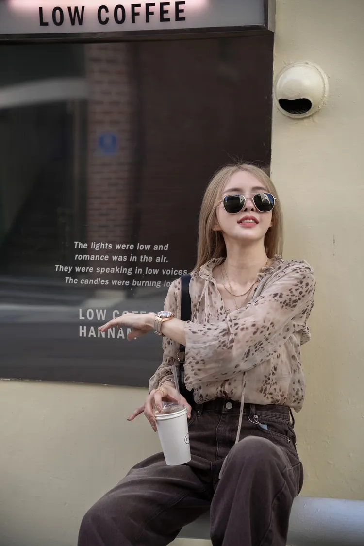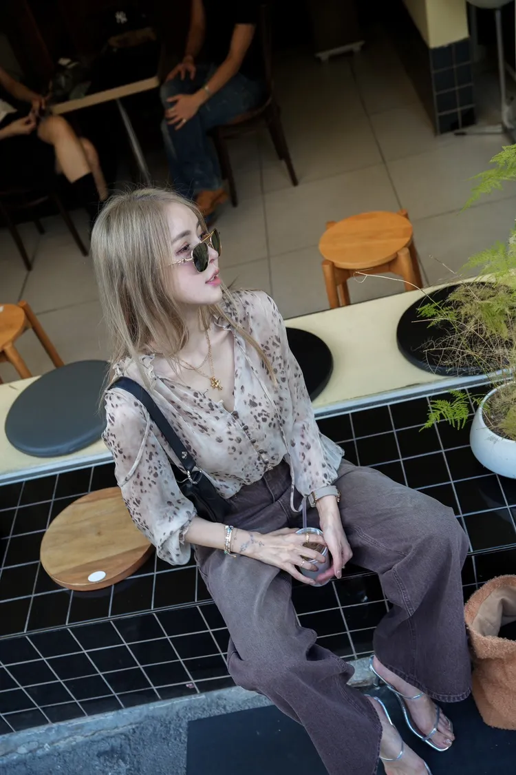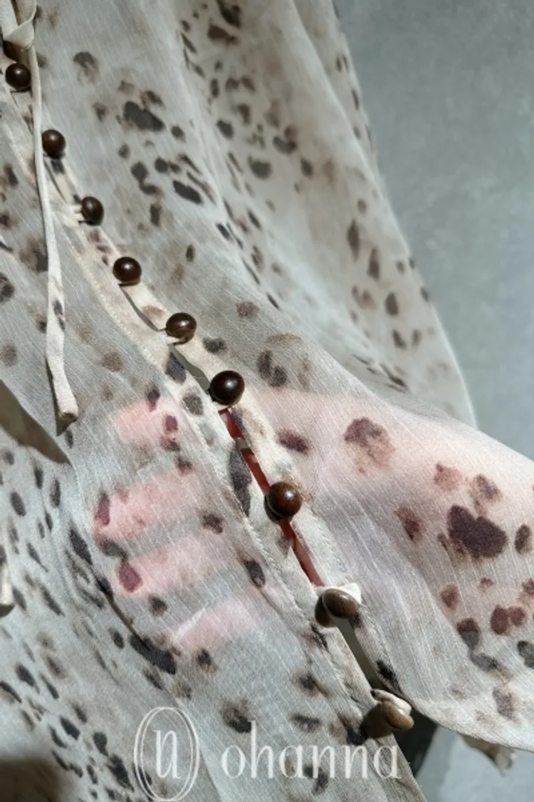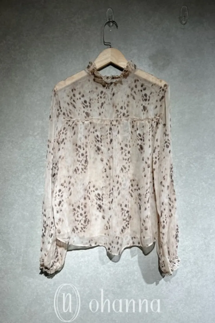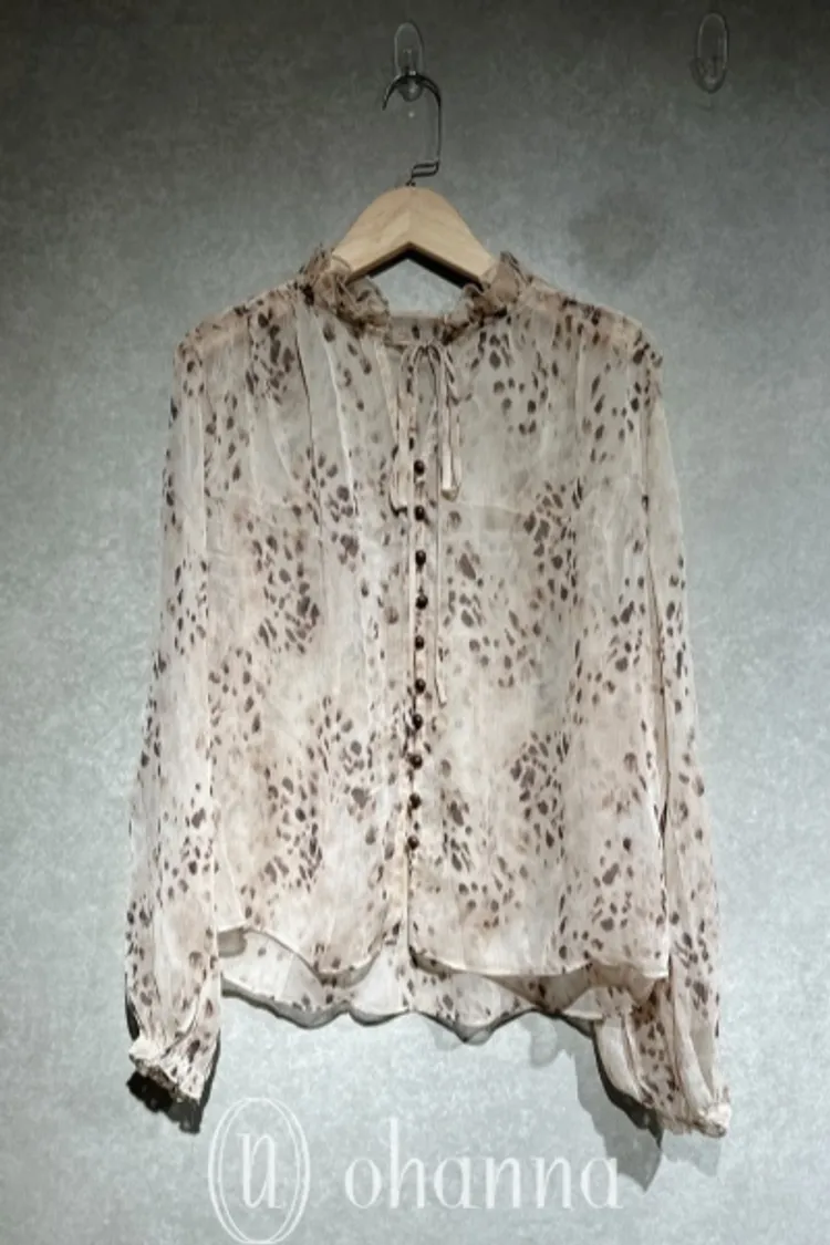 U256(自訂款)荷葉領綁帶豹紋透膚排扣上衣