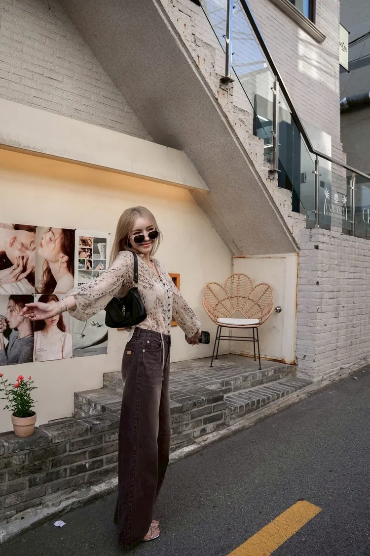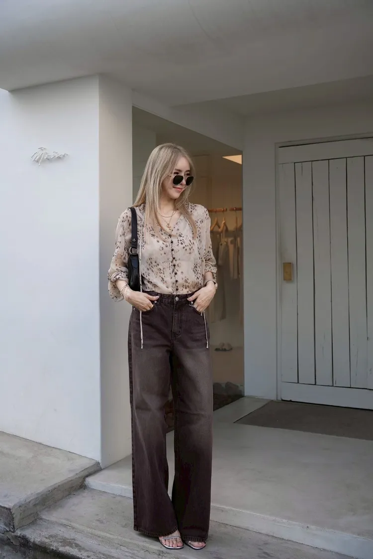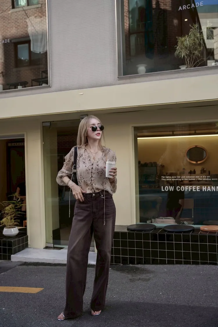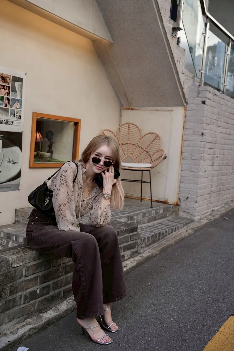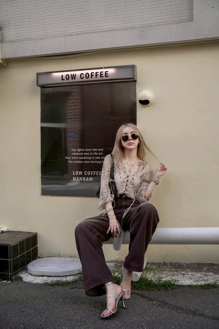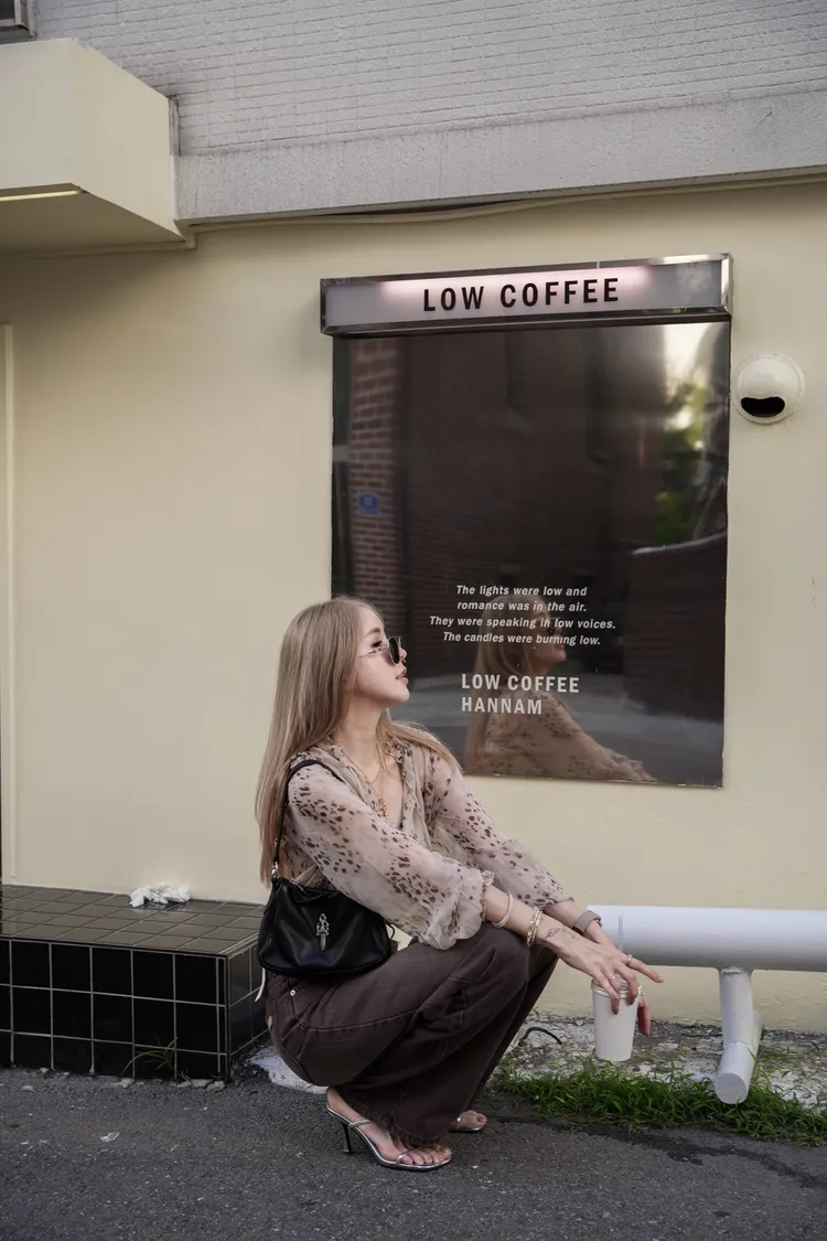 U256(自訂款)荷葉領綁帶豹紋透膚排扣上衣