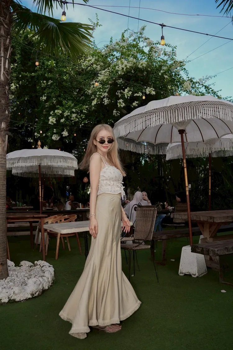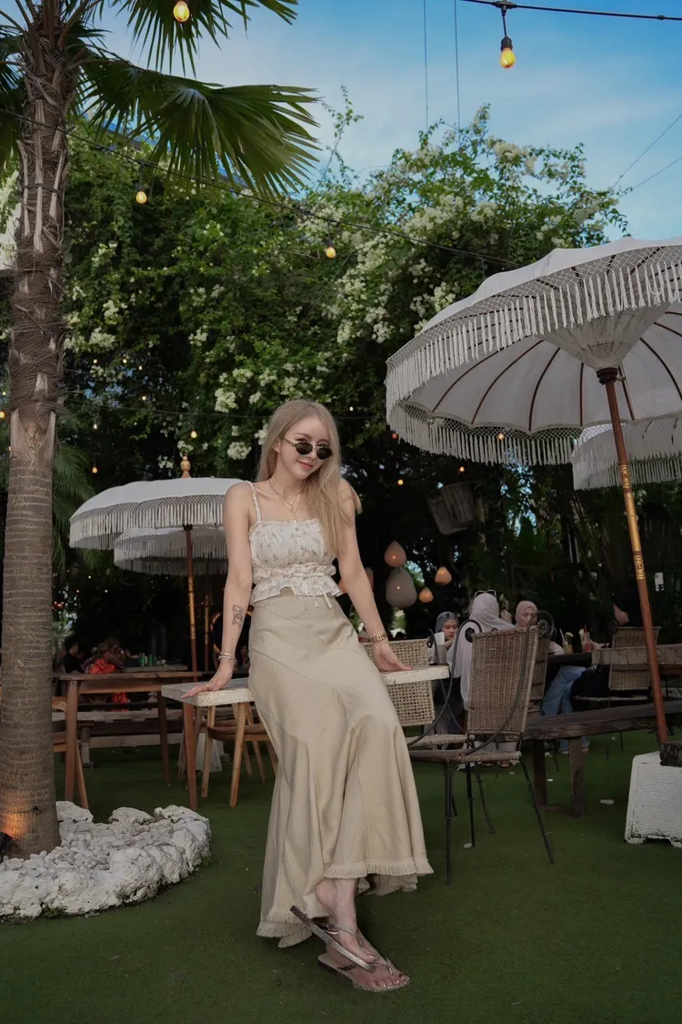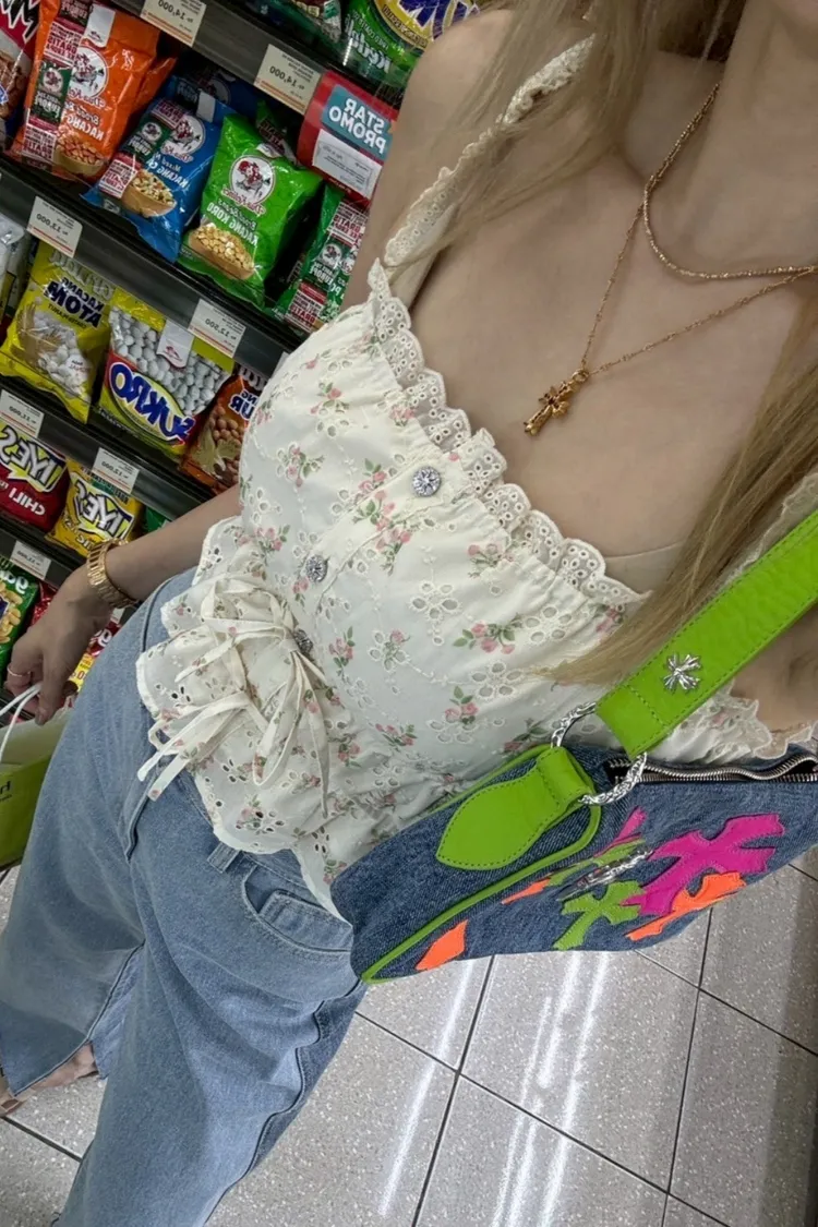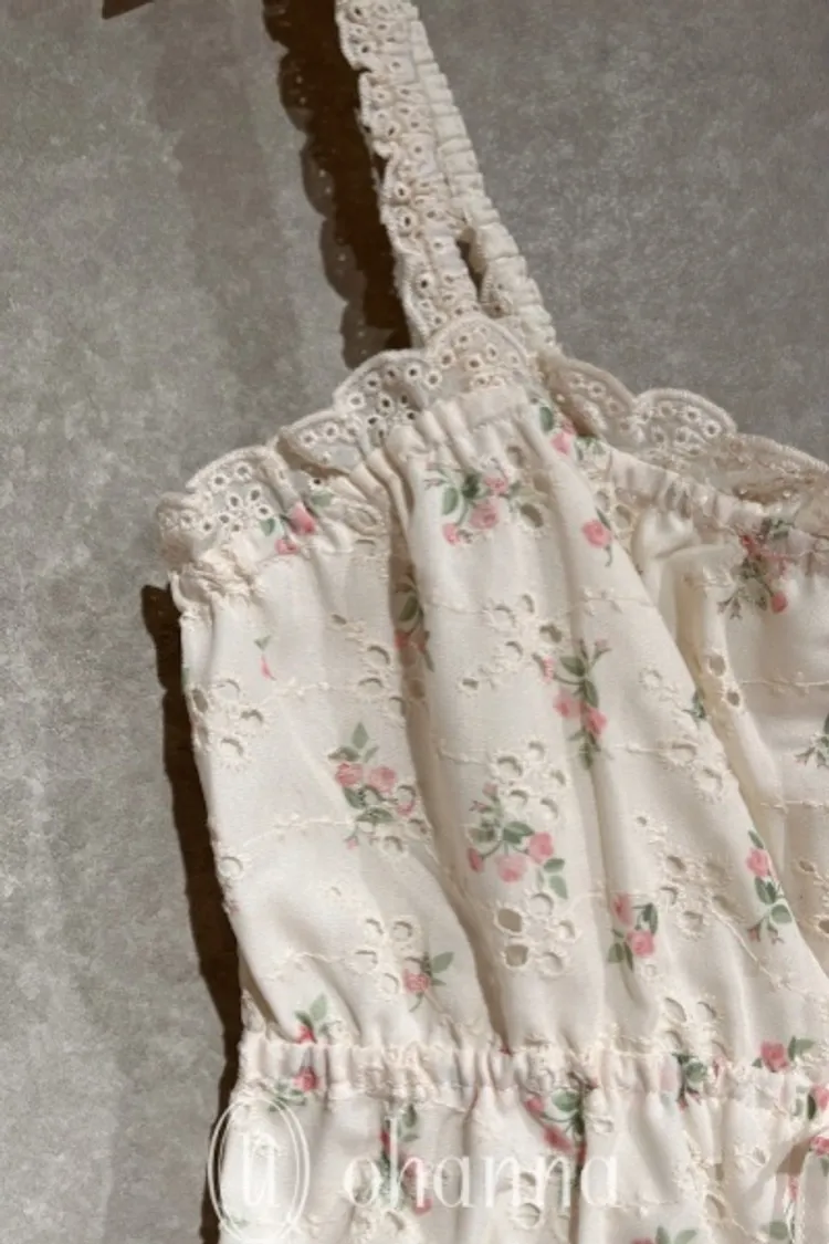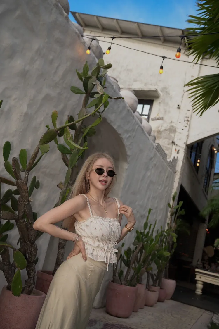 Y091(自訂款)米色花朵排釦腰抽繩背心