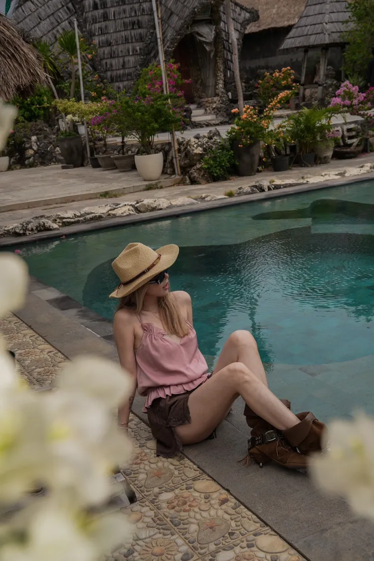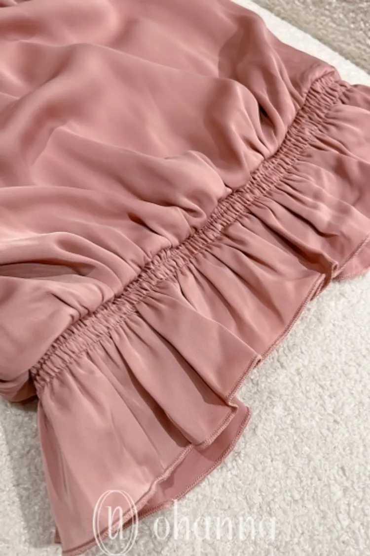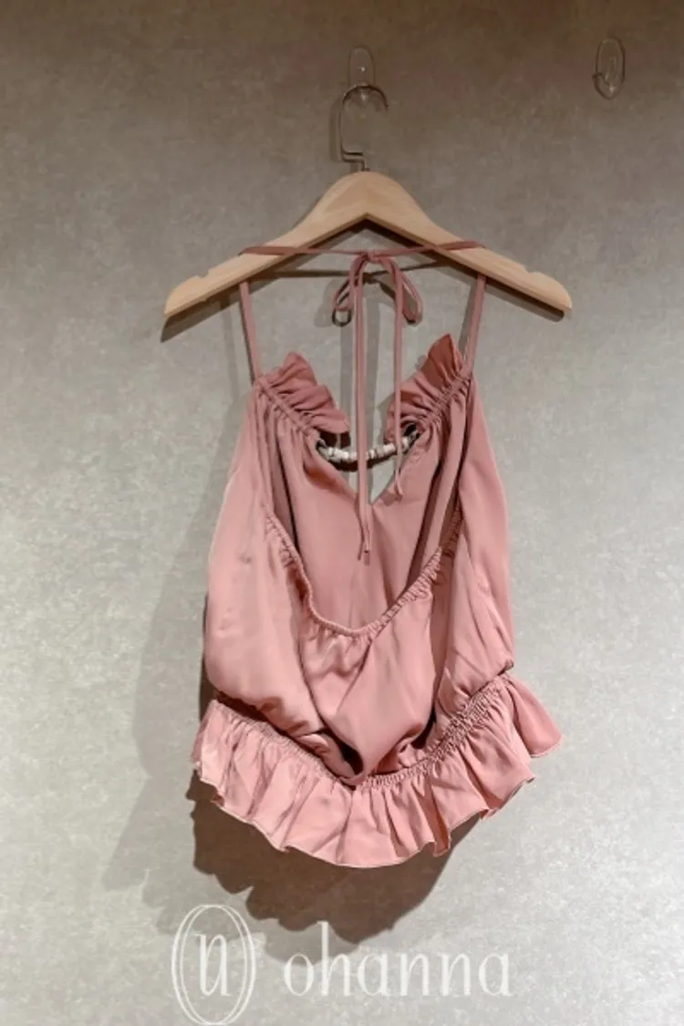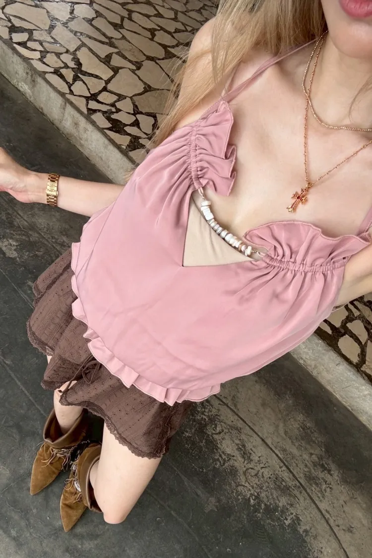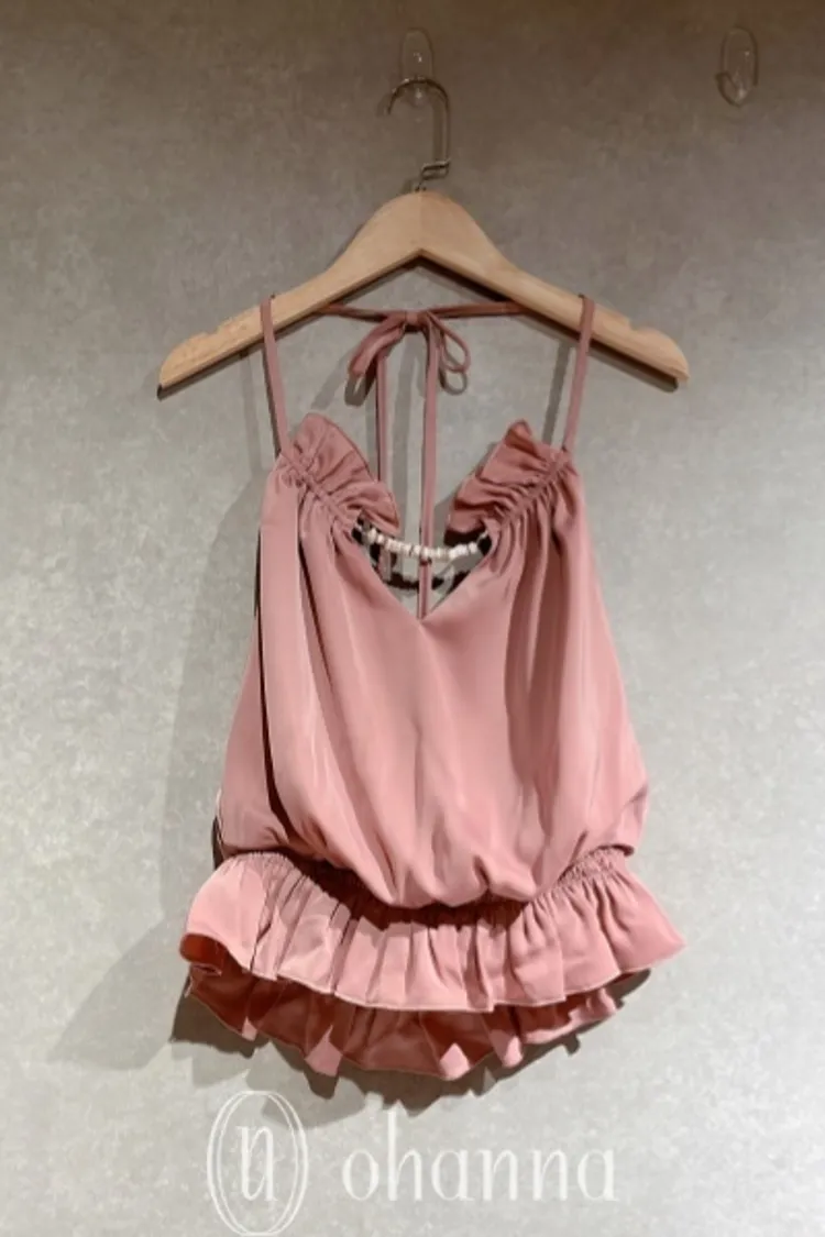 Y095(自訂款)粉色荷葉領貝殼串珠縮腰綁帶背心