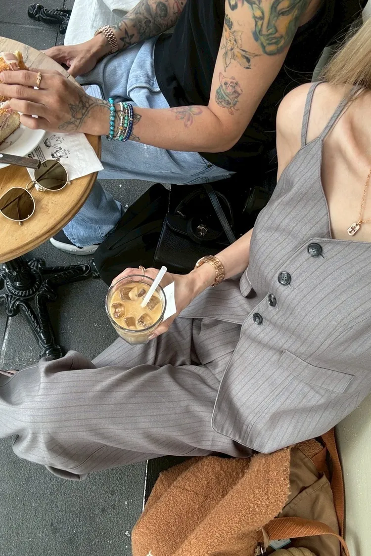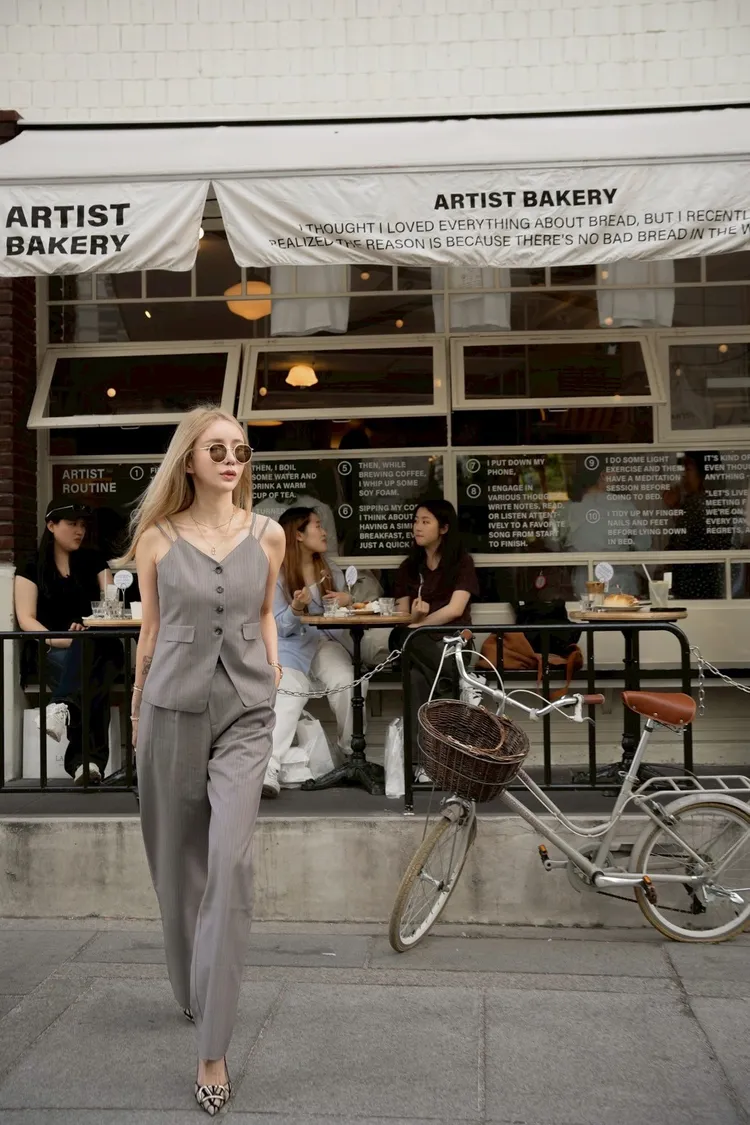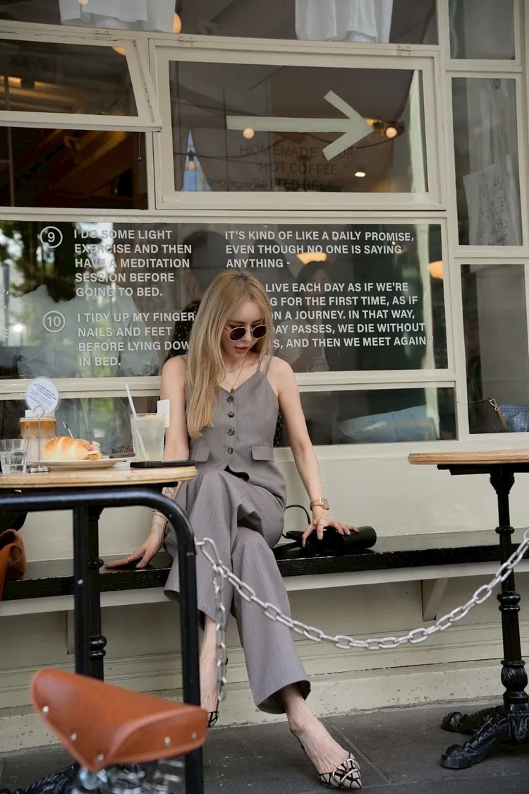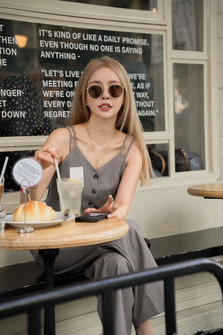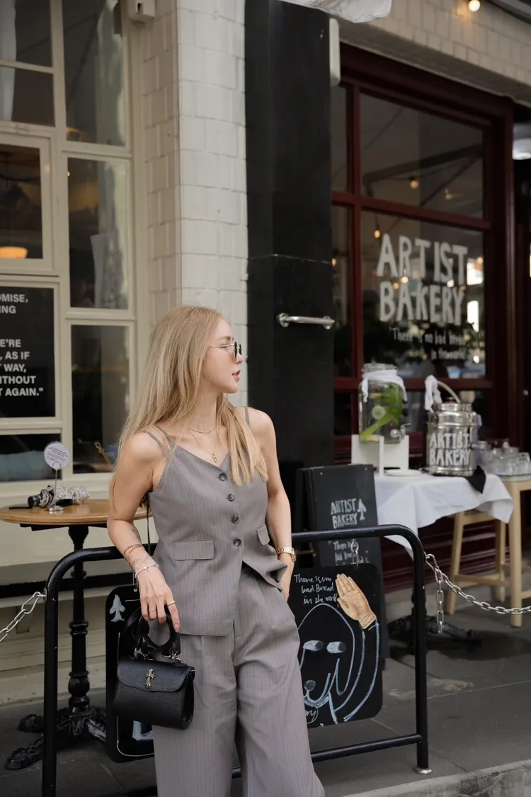 Y114(自訂款)灰色線條排扣細肩帶西裝背心+長褲