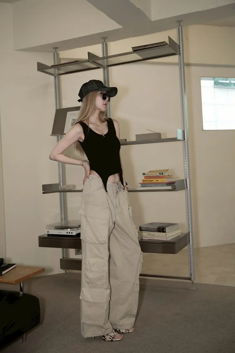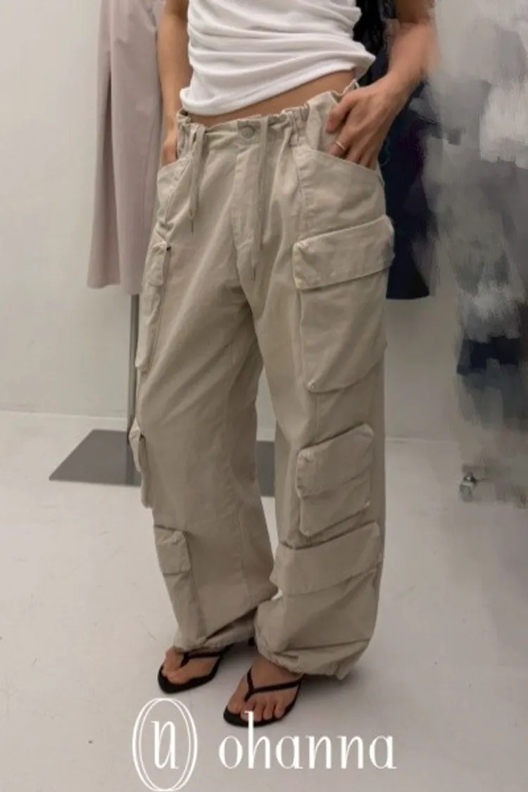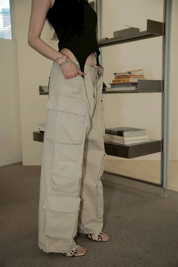 A018杏色褲頭內抽繩多口袋造型工裝褲