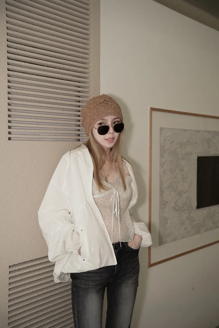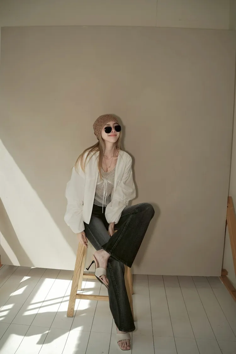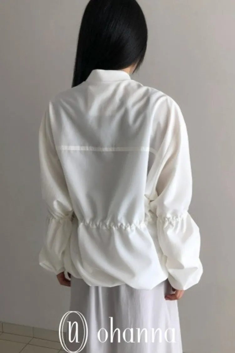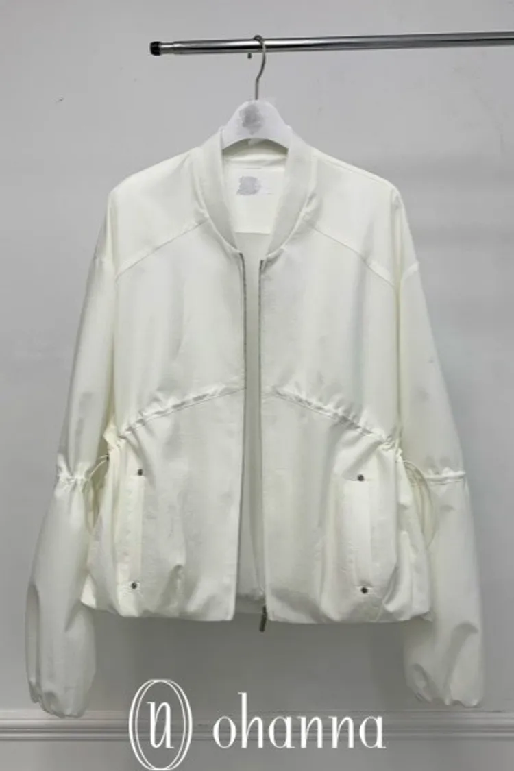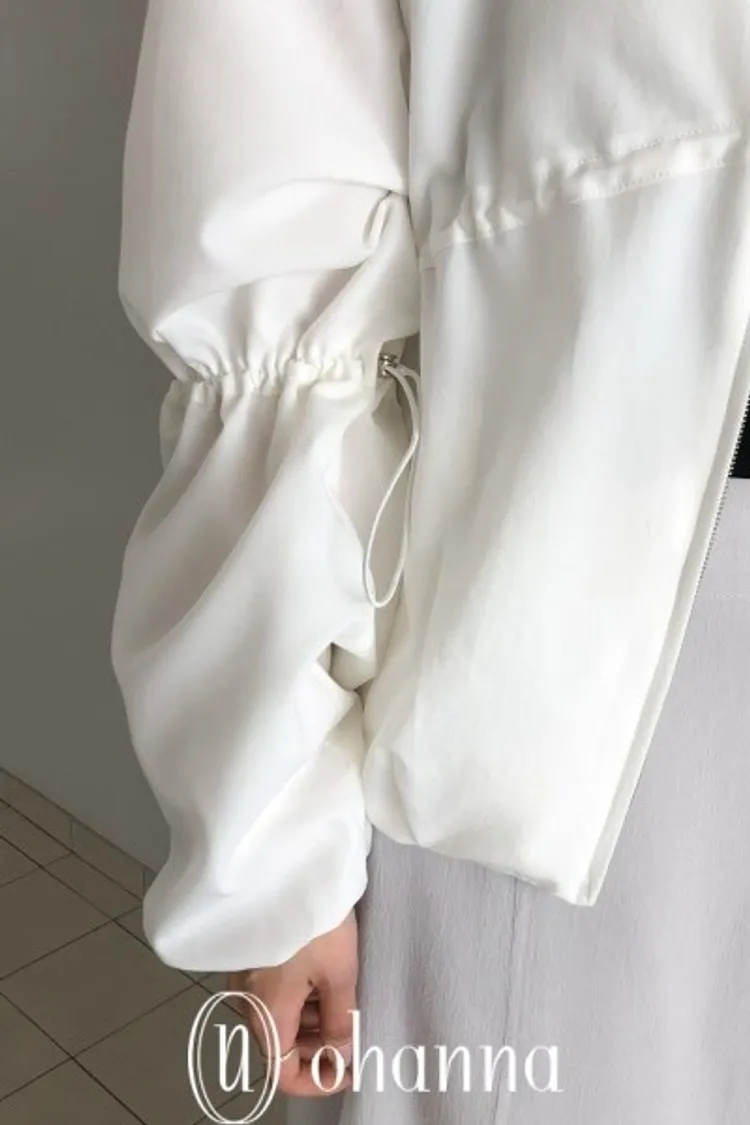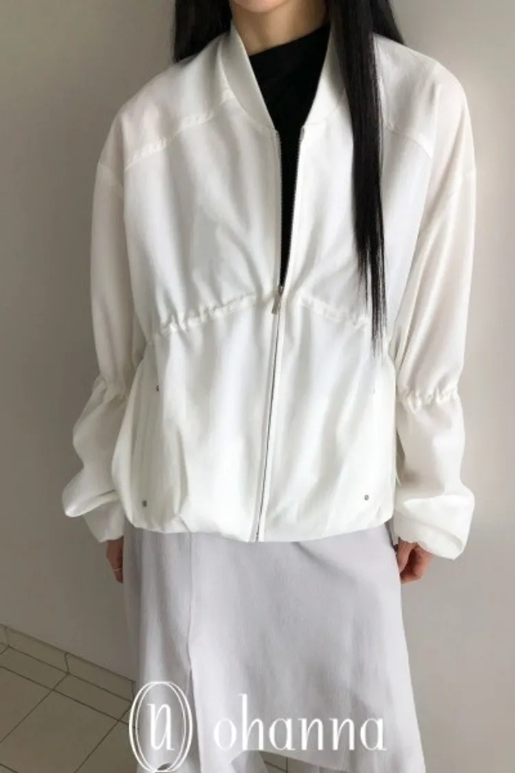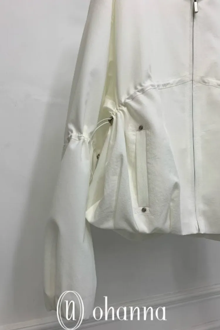 A034白色抓皺抽繩造型拉鍊外套