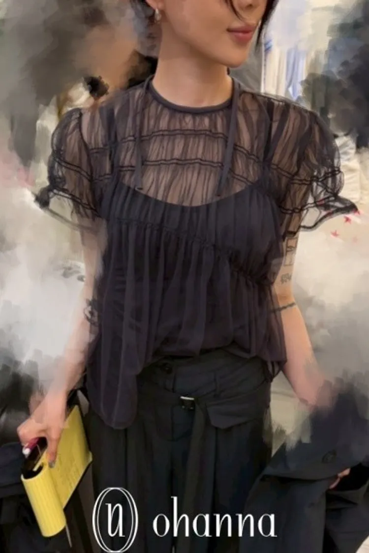 A042深灰綁帶透膚上衣+背心一組賣
